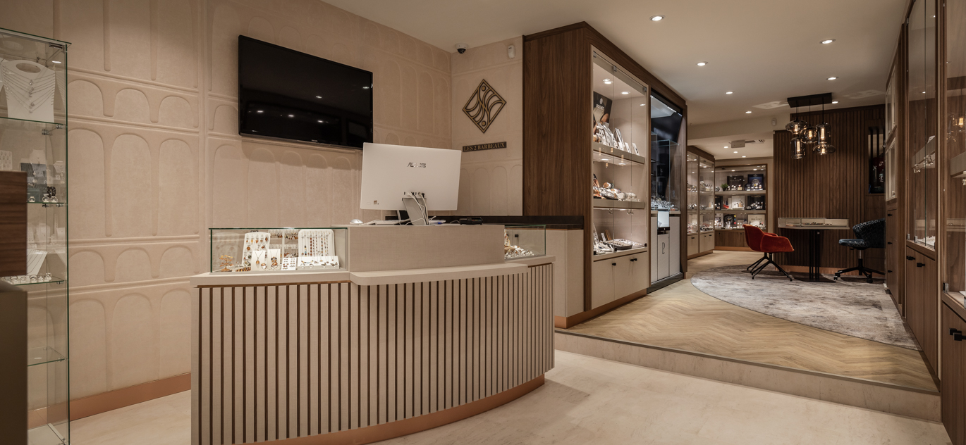 Loic Alif, de eigenaar van Bijouterie Les 2 Barbeaux, nam contact op met de interieurarchitecten van WSB om samen te brainstormen over een nieuwe winkelinrichting. Loic heeft veel kennis van de juweliers in Frankrijk omdat hij vroeger vertegenwoordiger was in de juweliersbranche. Hij heeft WSB de opdracht gegeven om een sfeervolle, niet al te industriële winkel te ontwerpen met tijdloze kleuren, ronde vormen en enkele opvallende eyecatchers. Een van de verschillende eyecatchers die in de winkel te vinden zijn, is de opvallende lamp in het middengebied bij de ingang. Met het uitgebreide assortiment aan sieraden, goud, zilver en horloges, was de indeling van de winkel Bijouterie Les 2 Barbeaux erg belangrijk. WSB richtte zich daarom vooral op het optimaliseren van de winkelruimte.