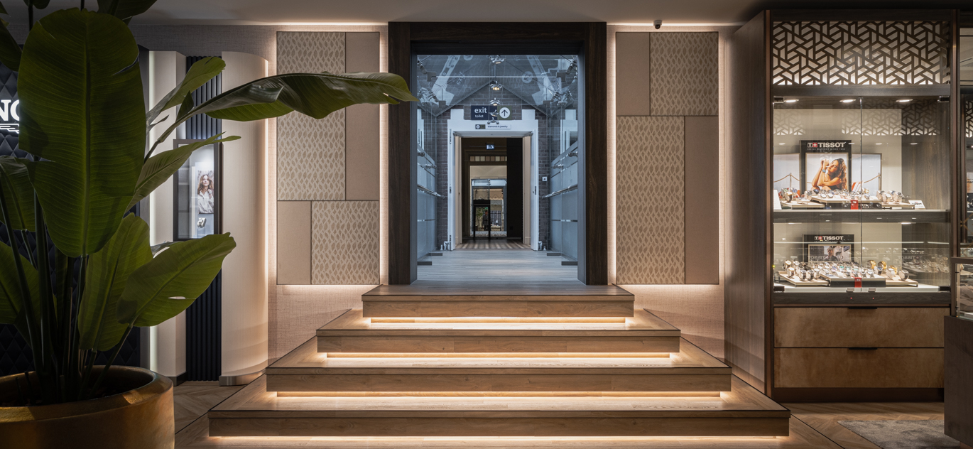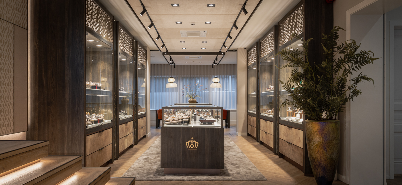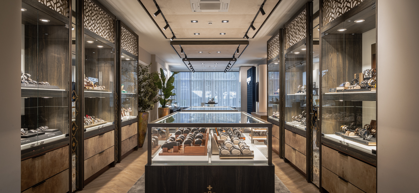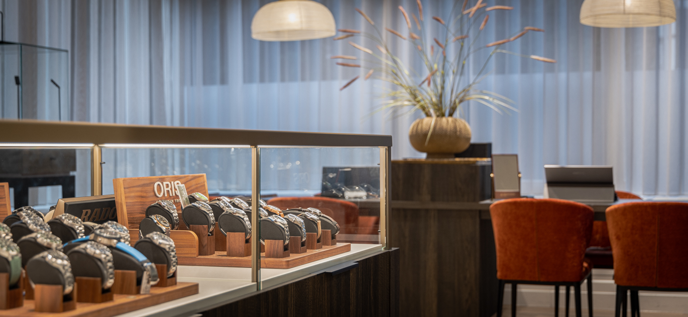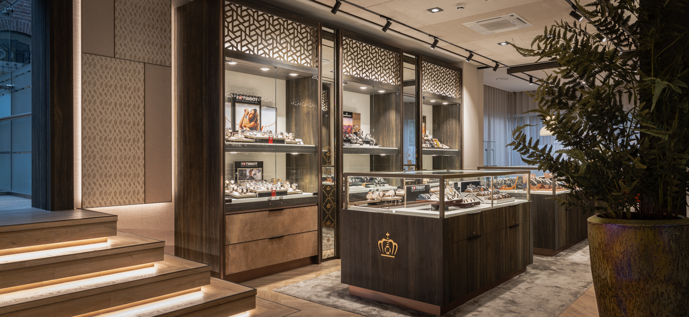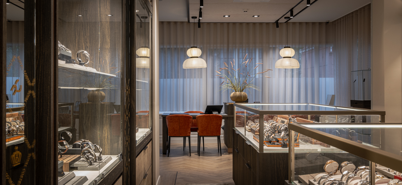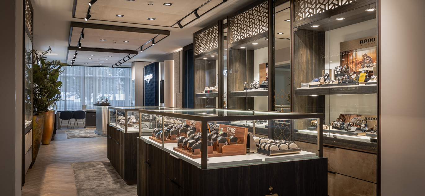 In het ontwerp voor de exclusieve horlogerie-winkel komt dynamiek en luxe samen. De bruisende energie van een warenhuis – met veel aanloop – wordt gecombineerd met de ingetogen klasse en serene sfeer van een boutique. Dit verfijnde ontwerp is gerealiseerd door de diverse horlogemerken in een samenhangende en harmonieuze omgeving te presenteren. Daarbij sluit elke ruimte perfect aan bij de exclusiviteit van de collectie.