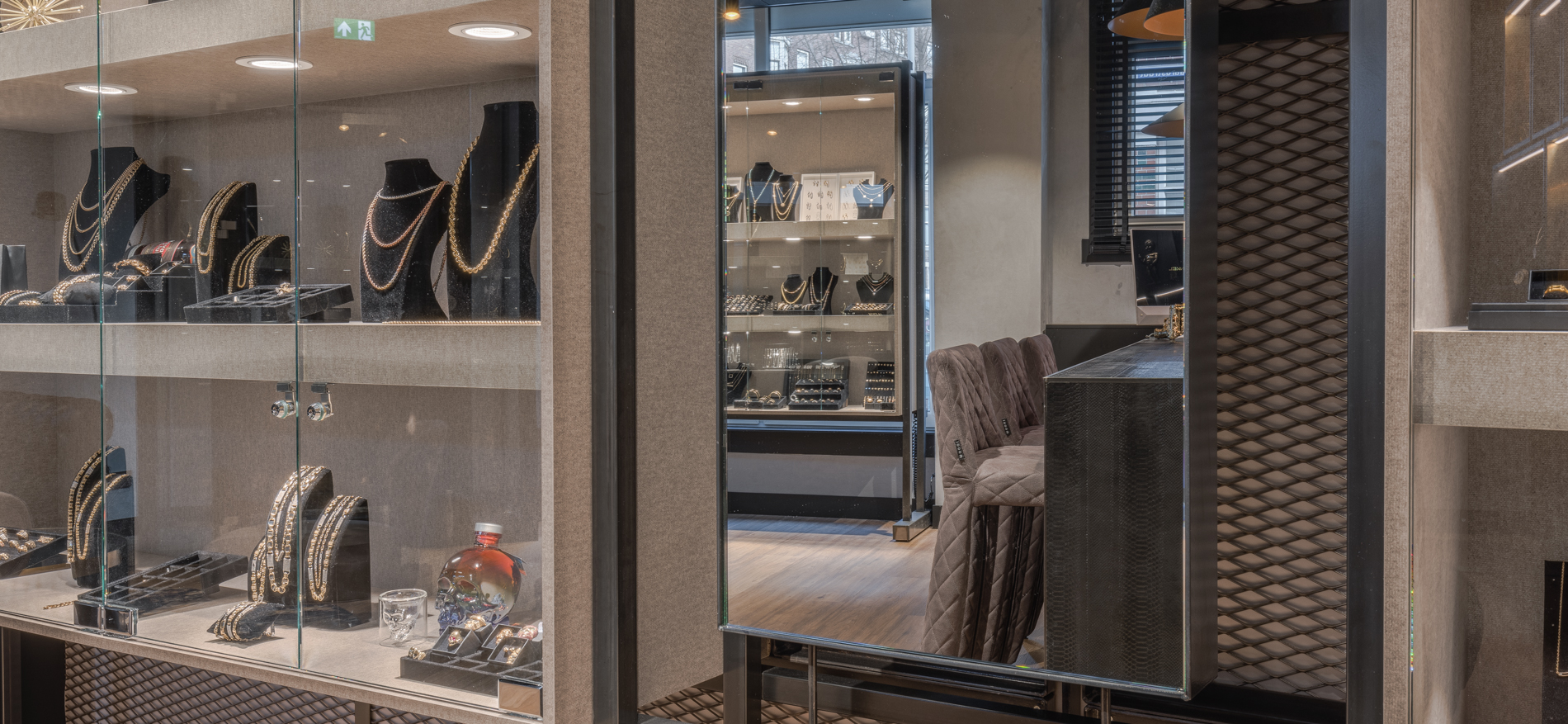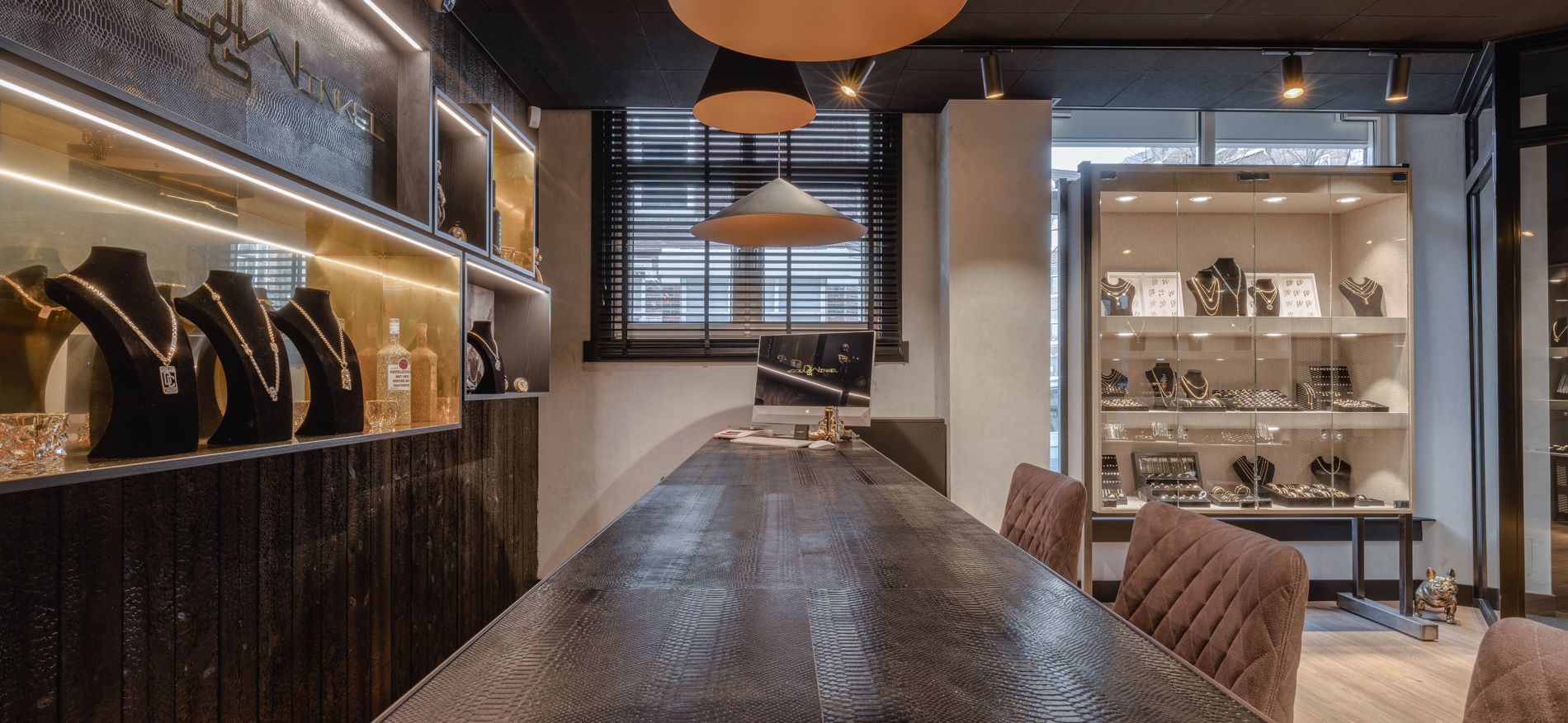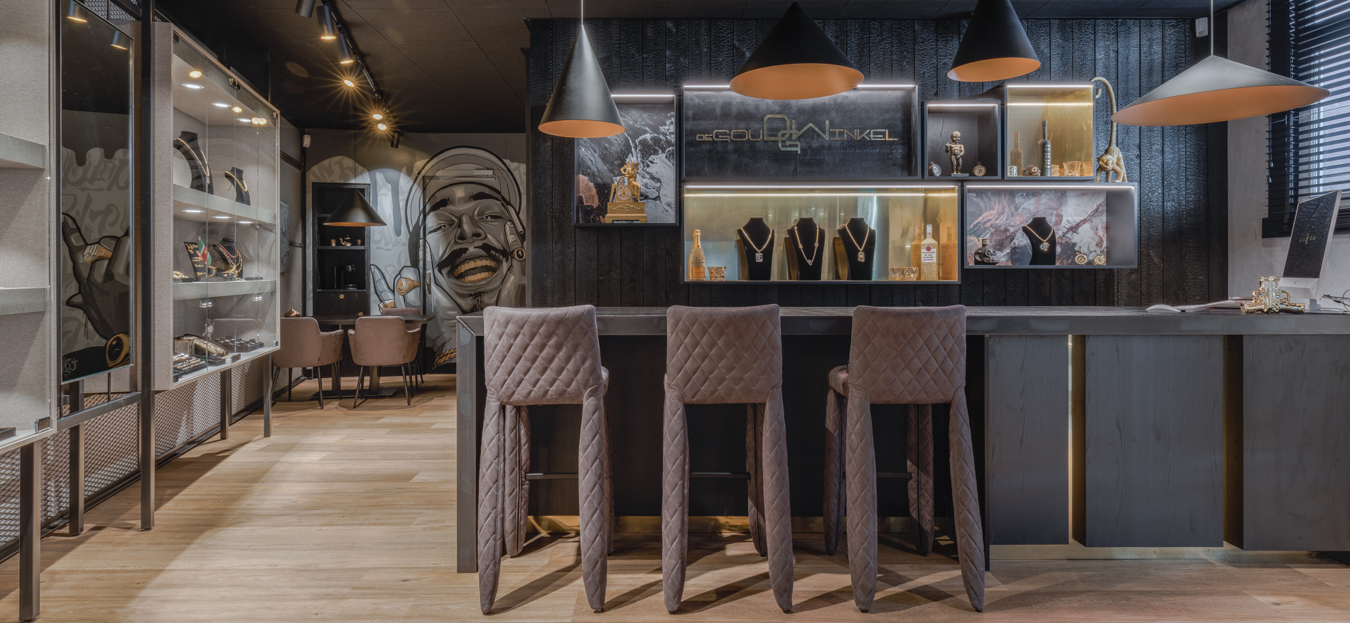 Een pandhuis en juwelier in een. Mede door dit gegeven is er een bijzondere winkel met twee entrees ontstaan. Het pandhuis is vriendelijk, warm en functioneel. De juweliers afdeling is luxe gecombineerd met een sterk industrieel en streetstyle karakter.