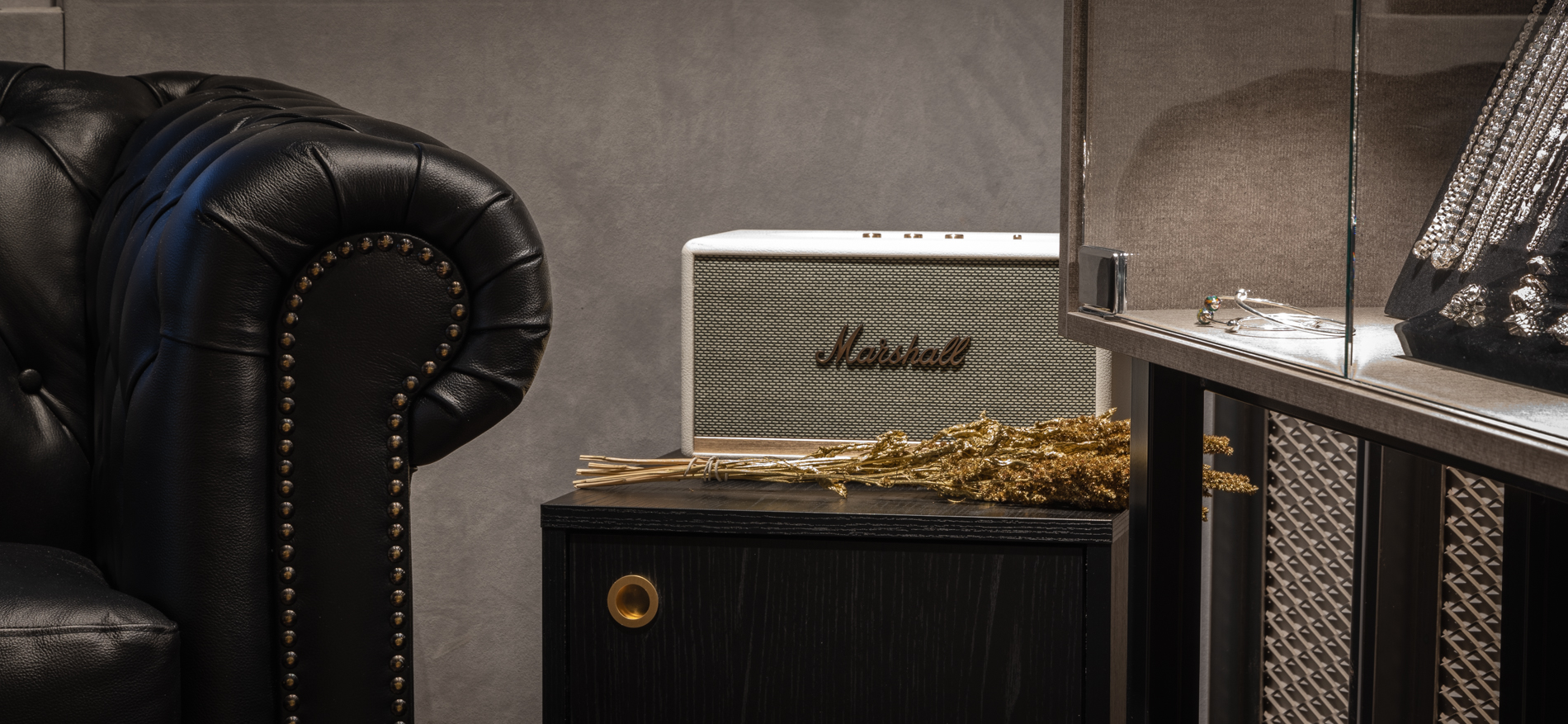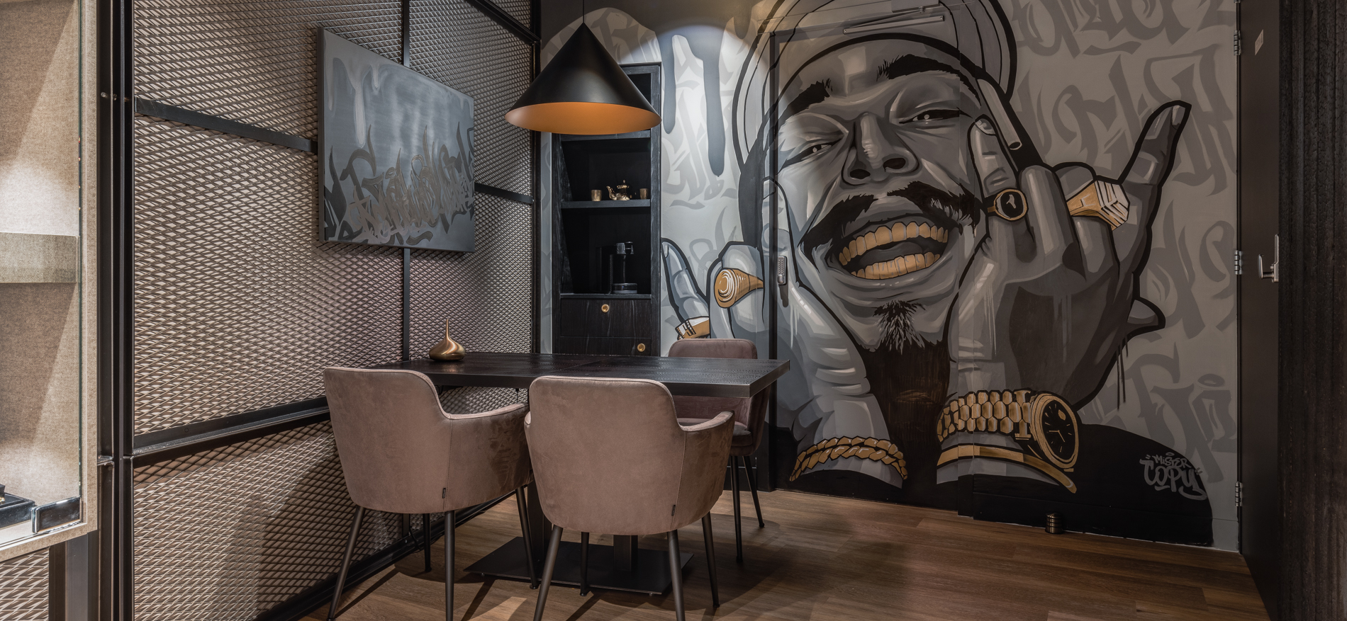 Voor het breed uiteenlopend publiek met veel artiesten uit de rapscene is er een bar, lounge en bespreektafel beschikbaar. Alles overtrokken in rijke en echte materialen waardoor er een stijlvolle balans is ontstaan. Leer, goud, zwart gebrand hout, sterk metaal en beton zijn de materialen die de basis vormen. De sieraden worden geweldig uitgelicht in een verder donkere, spannende omgeving. Voor de juiste touch heeft een internationale graffiti artiest een groot kunstwerk op de achterwand gezet.