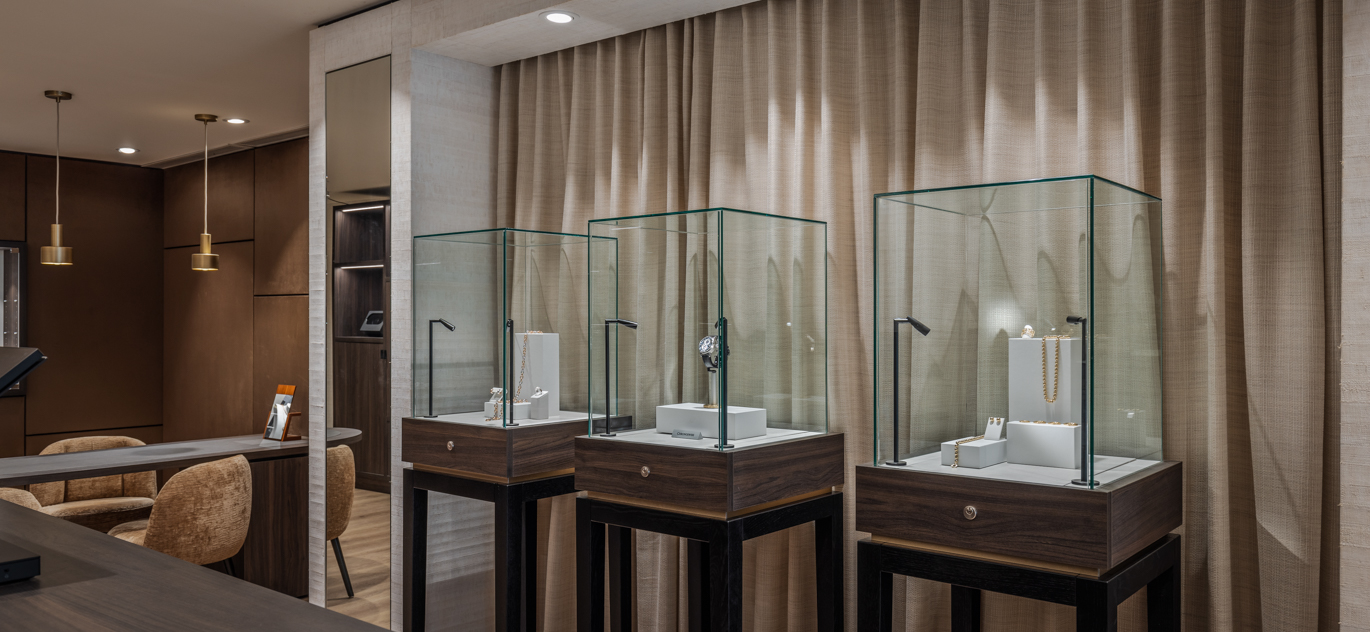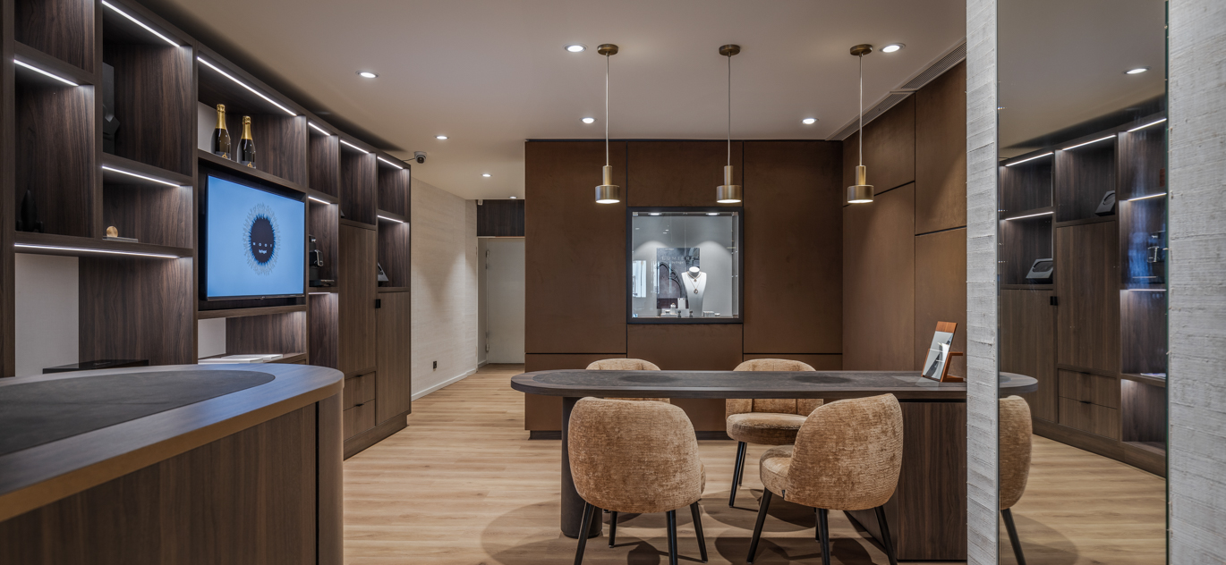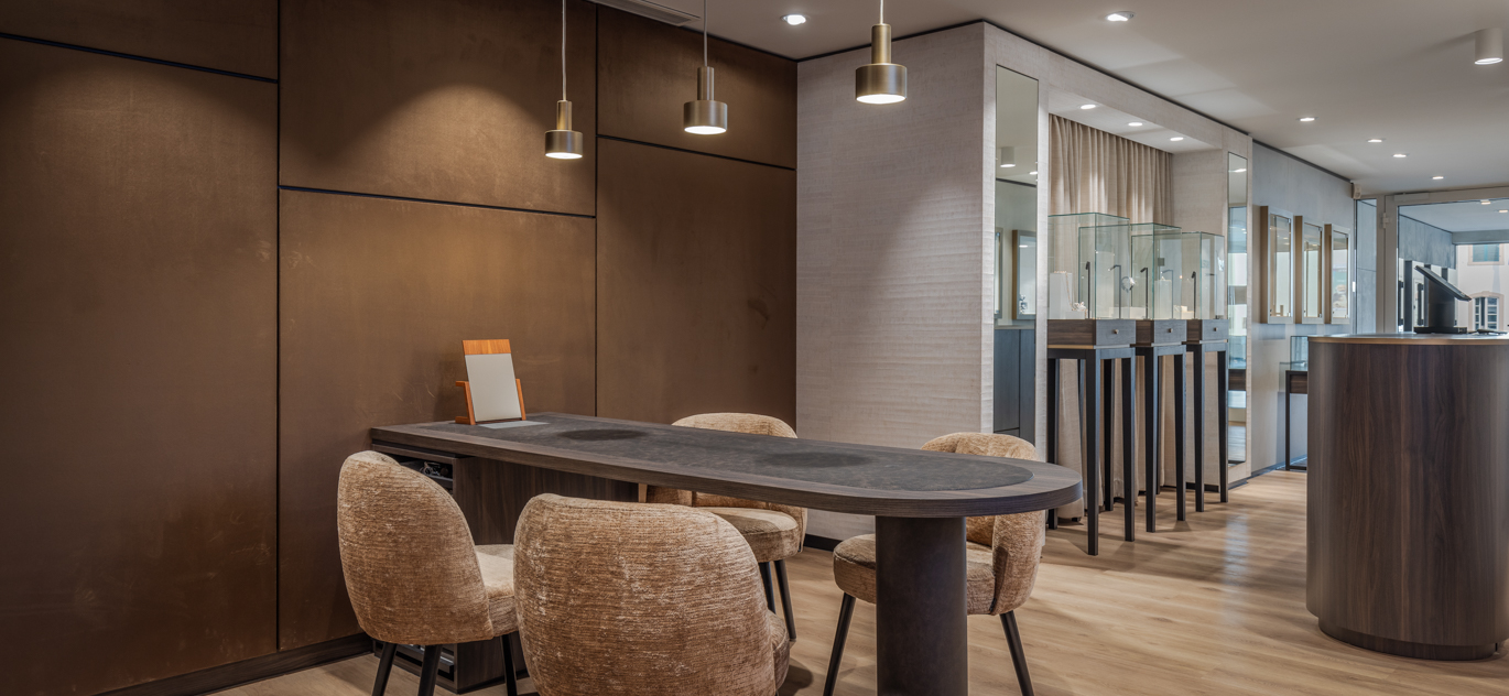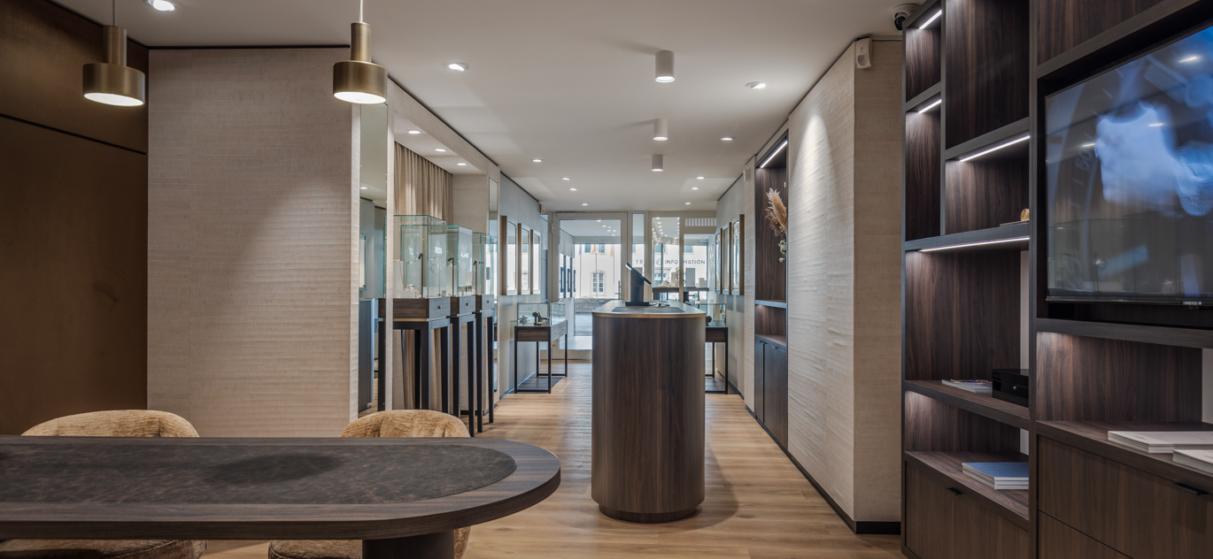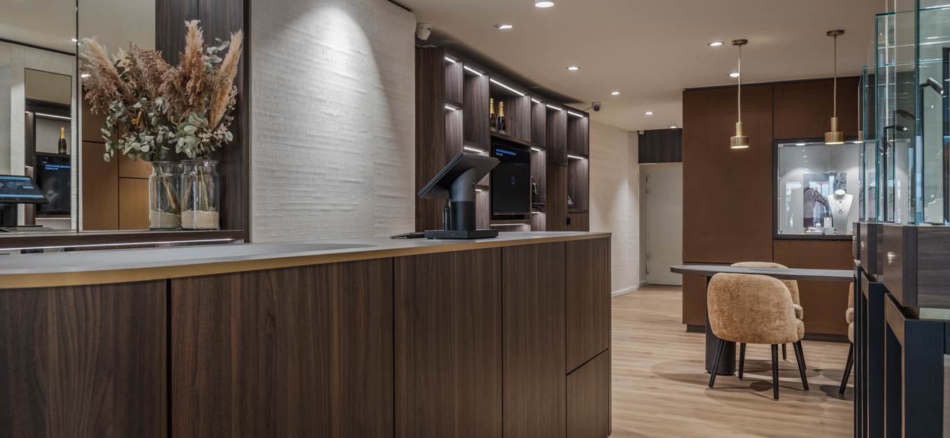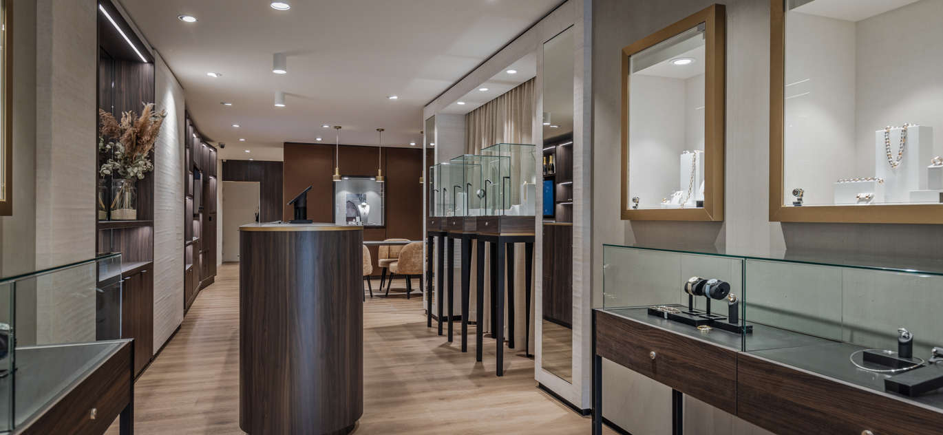 Het elegante winkelontwerp komt ook terug in het interieur, dat een prachtige presentatieruimte biedt met ruime wandvitrines en bijbehorende dressoirs in het voorgedeelte. Een lange en smalle servicebalie in het middengedeelte wordt gebruikt om horloges en sieraden te showen. Aan de achterzijde bevindt zich een ruime zithoek. Deze wordt vaak gebruikt tijdens de verkoop van trouwringen.