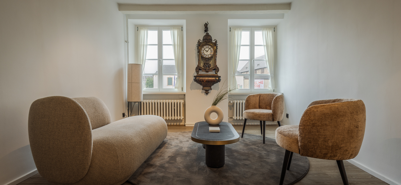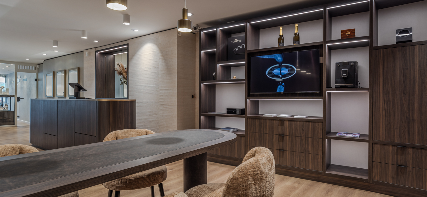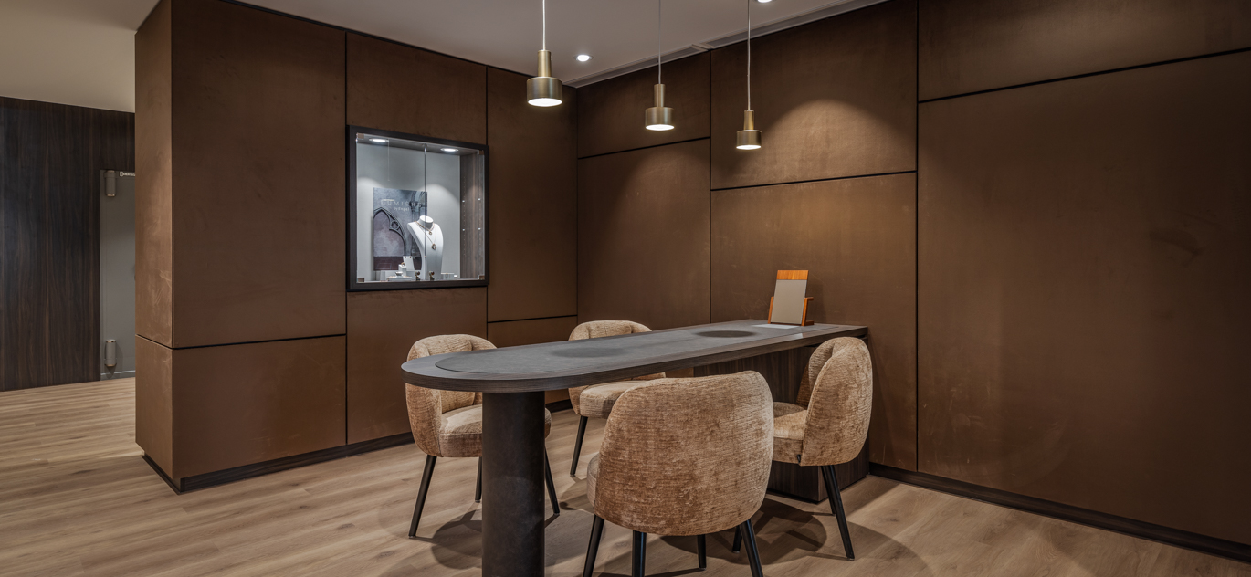 Beton-look op de muren en meubels van donker hout gecombineerd met lichte muurkleuren. Hoogwaardige stoffen lambrisering en elegante gordijnmaterialen. Deze elementen maken het ontwerp compleet. Een passend verlichtingsconcept met het modernste LED-licht zet de goederen in het juiste licht. Deze elementen zorgen voor de realisatie van een elegant winkelinterieur.