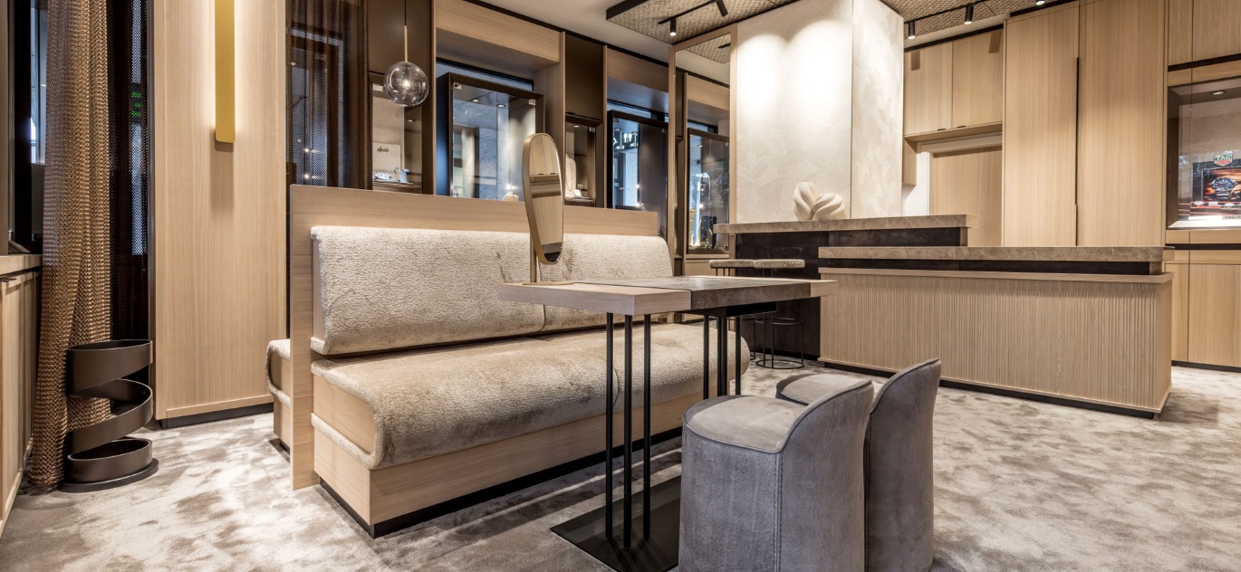 De rechterwand van de winkel is multifunctioneel: klanten kunnen hier langs de collectie lopen en in alle rust een verkoopgesprek voeren. In deze wand zijn bovendien uitschuifbare bureaus geïntegreerd, waarmee we drie extra volwaardige verkoopplekken hebben gecreëerd – een unicum in zo’n compacte ruimte. Ook akoestiek is meegenomen: een met stof beklede zuil naast de balie ondersteunt niet alleen het plafond, maar dempt ook het geluid voor een aangename winkelervaring.