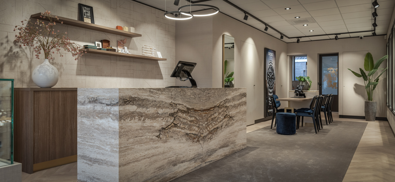 Qua sfeer moest de juwelierszaak een luxe en lichte uitstraling hebben, maar in het ontwerp moest wel het toegankelijke karakter behouden worden. Daarom is er gekozen voor een lichte visgraatvloer, luxe behang van Élitis, warm notenhout, goudkleur details en een prachtige travertin balie. Deze elementen bracht WSB aan in het winkelontwerp voor een perfecte balans en de materialen geven de winkel de gewenste uitstraling. Al met al een zeer geslaagde verbouwing waar zowel de opdrachtgever als hun klanten uitgesproken positief over zijn!
