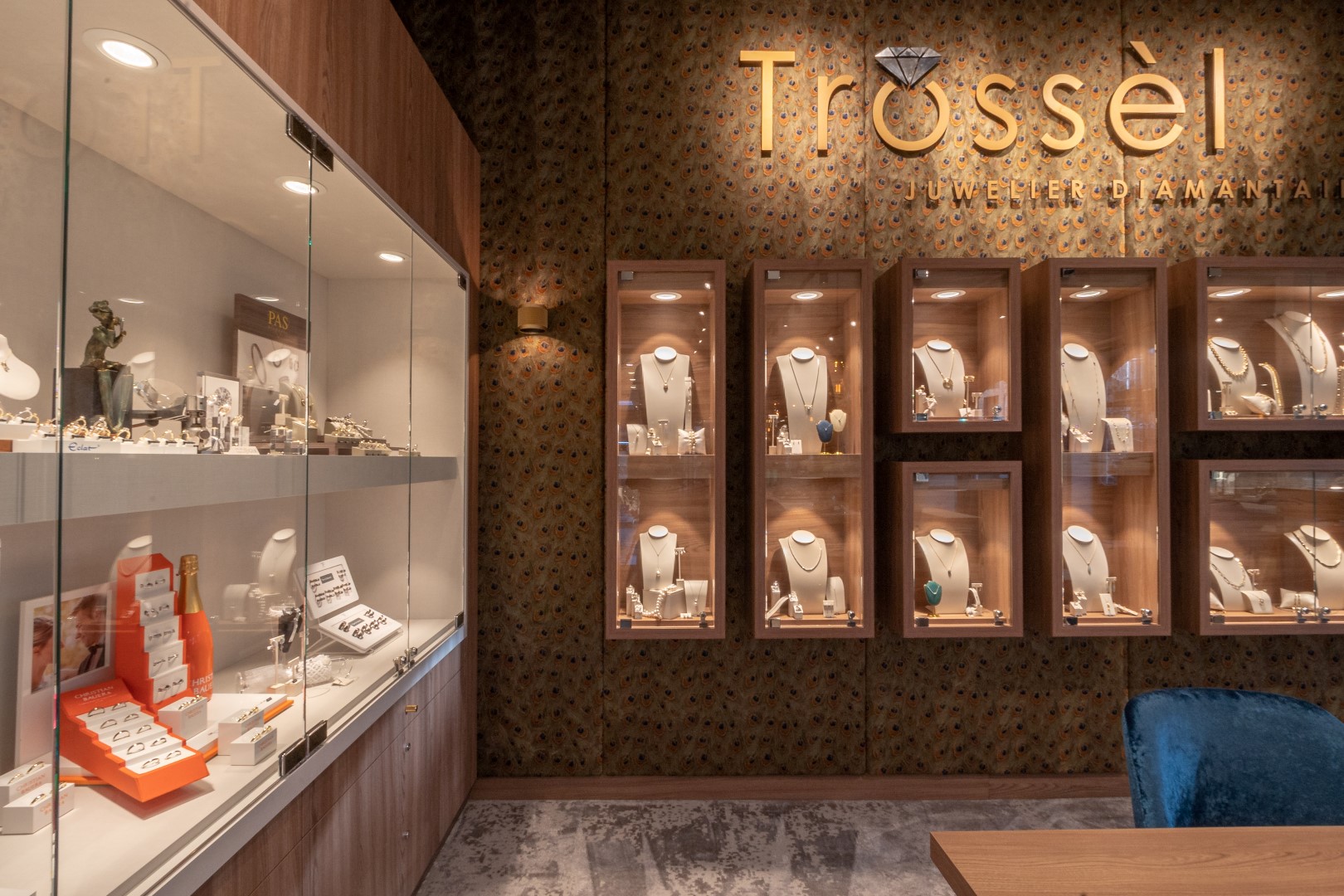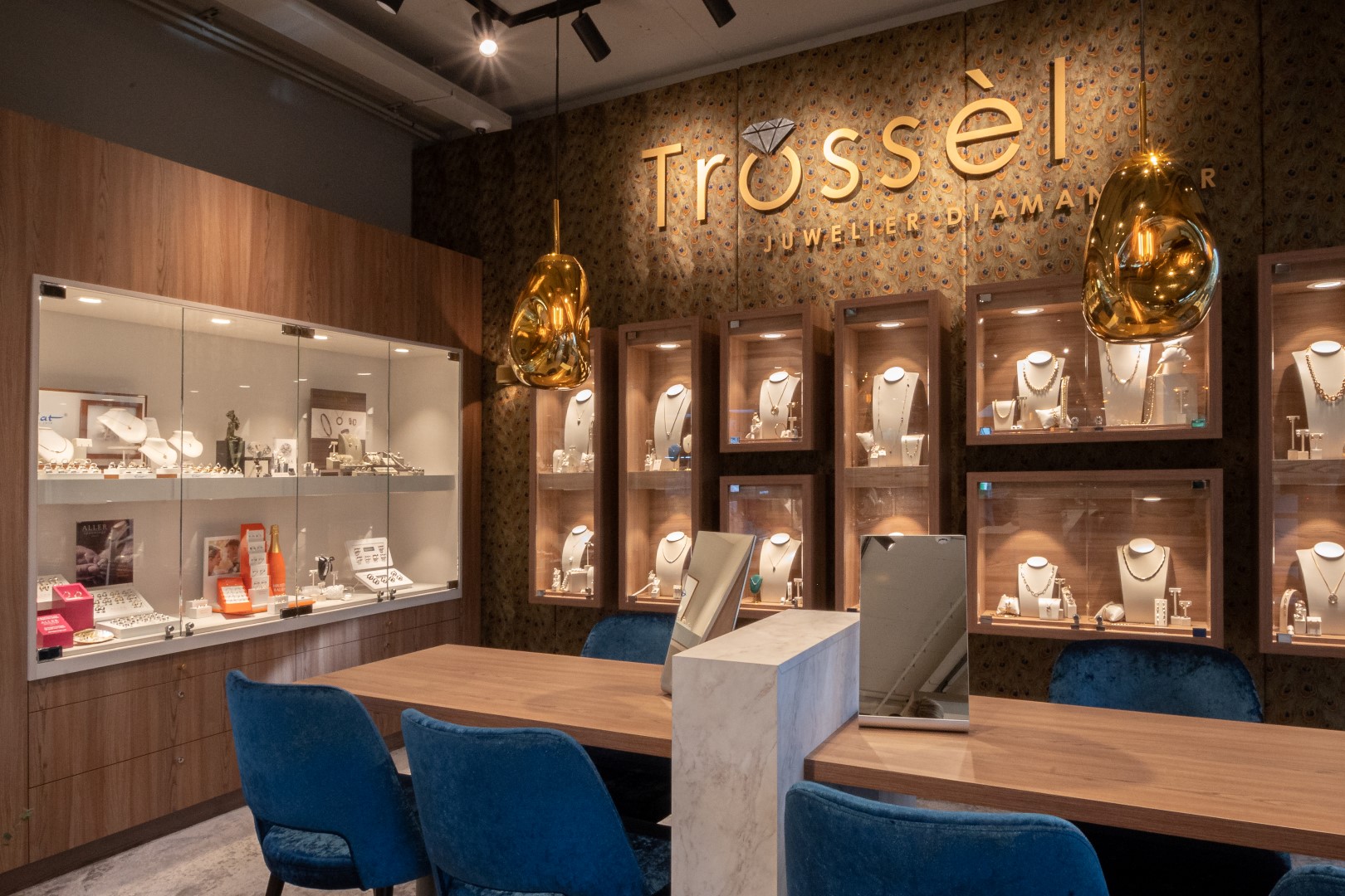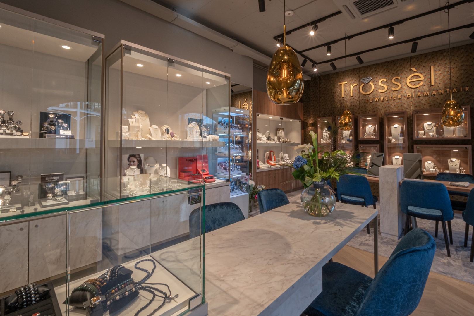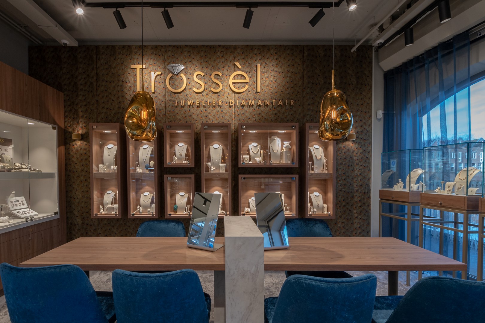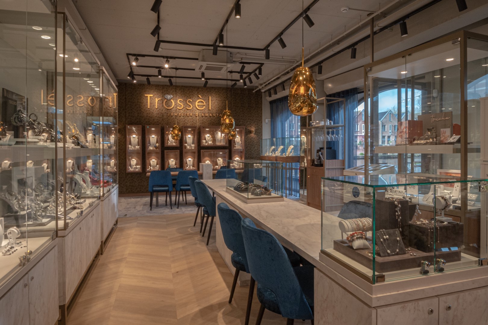 In 2022 was het zover. Cindy van juwelier Trossèl nam de beslissing om haar winkel te reloceren. Ze ging het winkelcentrum de Aarhof uit en zit nu in een mooi hoekpand langs het water. Als inspiratie van haar winkel dienden de inrichting van optik Amberg in Erlangen (DE) en de Emyko showroom voor ‘Residential Interior Design’ in Scherpenzeel. Mooie warme materialen, notenkleuren, structuren van pauwenveren, velours bekleding in blauw. Het interieur staat niet in een witte of een zwarte omgeving, maar heeft een warme, lichte toegankelijke kleur. De winkel is qua ruimte tot de laatste centimeter geoptimaliseerd en biedt ruimte aan 5 verkoopzits.