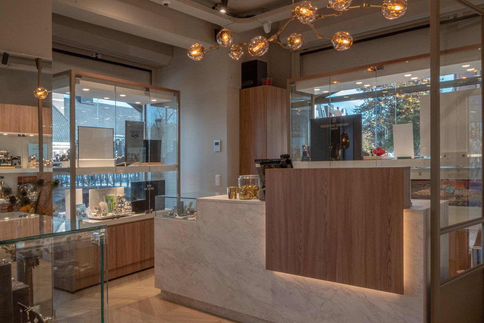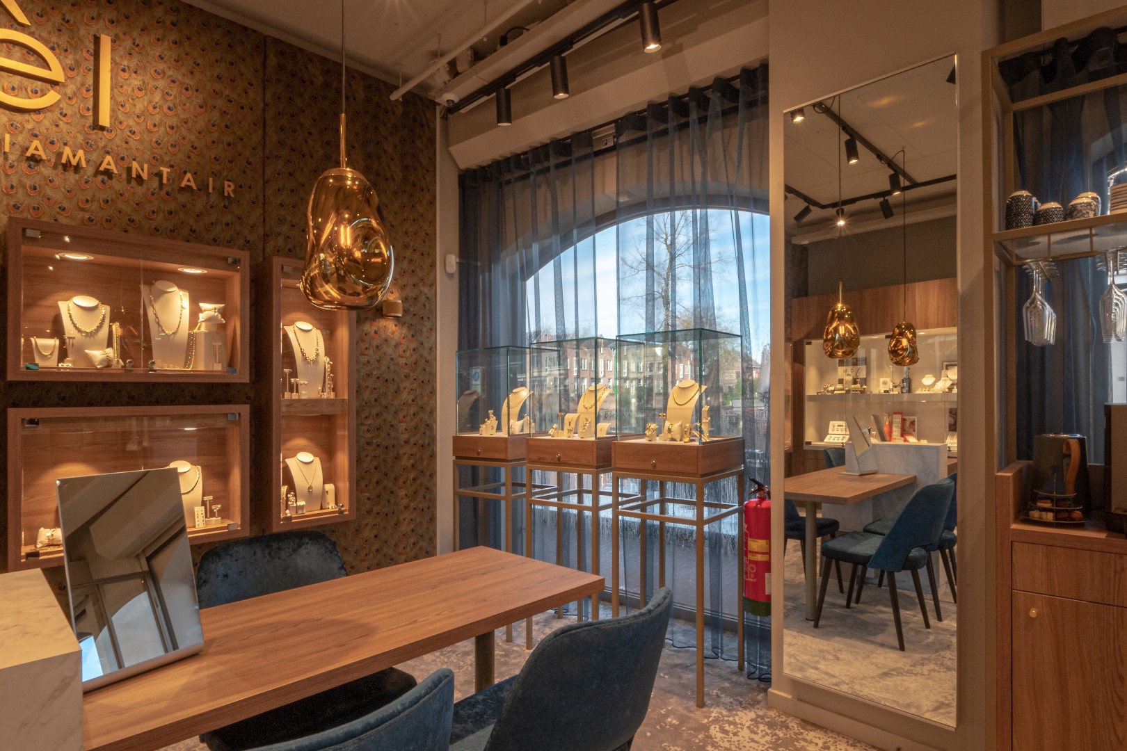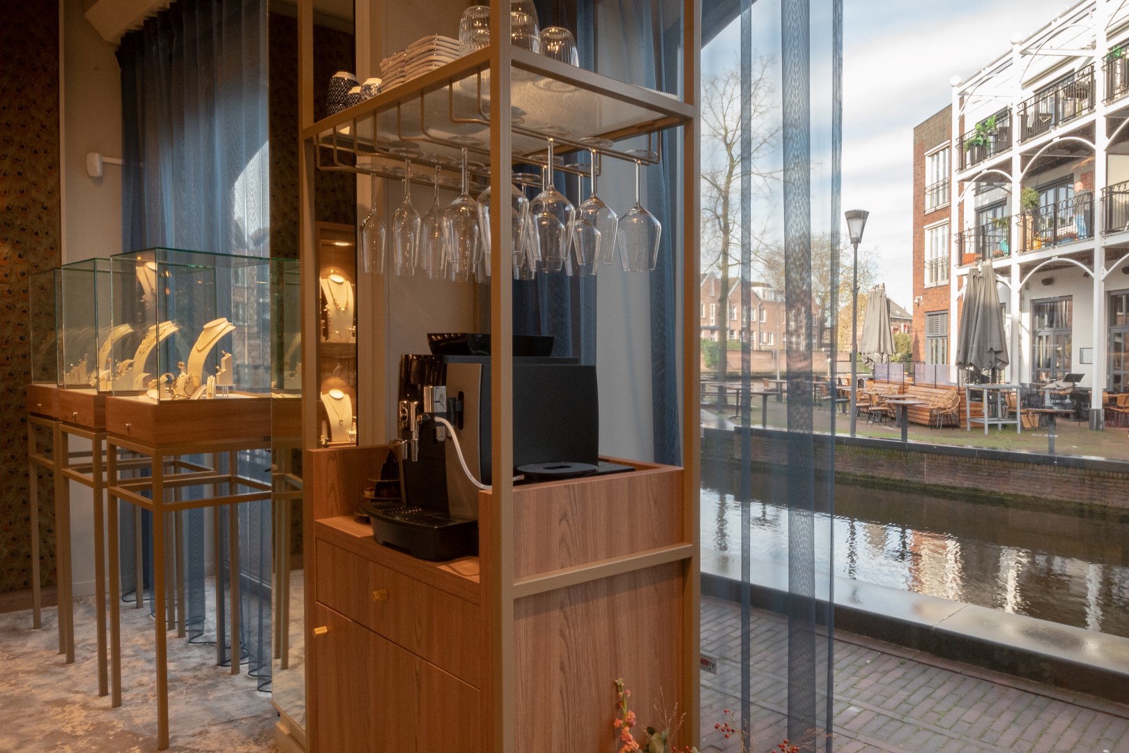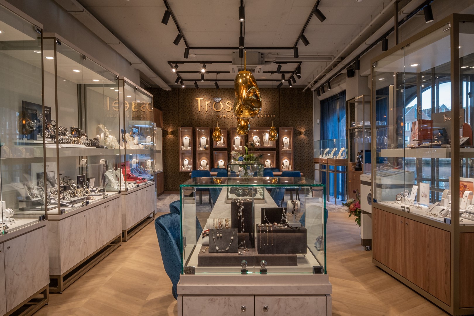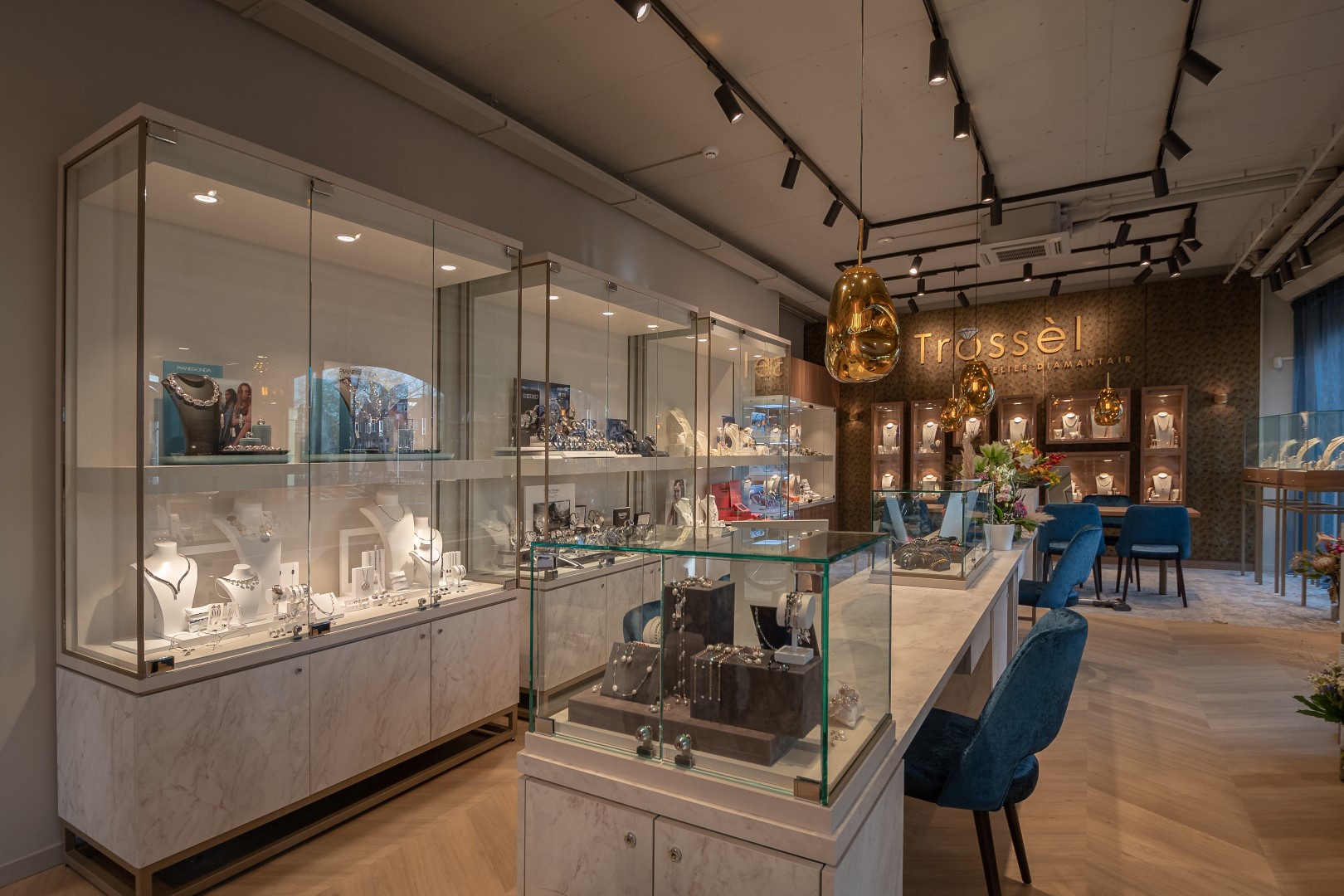In 2022 was het zover. Cindy van juwelier Trossèl nam de beslissing om haar winkel te reloceren. Ze ging het winkelcentrum de Aarhof uit en zit nu in een mooi hoekpand langs het water. Als inspiratie van haar winkel dienden de inrichting van optik Amberg in Erlangen (DE) en de Emyko showroom voor ‘Residential Interior Design’ in Scherpenzeel. Mooie warme materialen, notenkleuren, structuren van pauwenveren, velours bekleding in blauw. Het interieur staat niet in een witte of een zwarte omgeving, maar heeft een warme, lichte toegankelijke kleur. De winkel is qua ruimte tot de laatste centimeter geoptimaliseerd en biedt ruimte aan 5 verkoopzits.