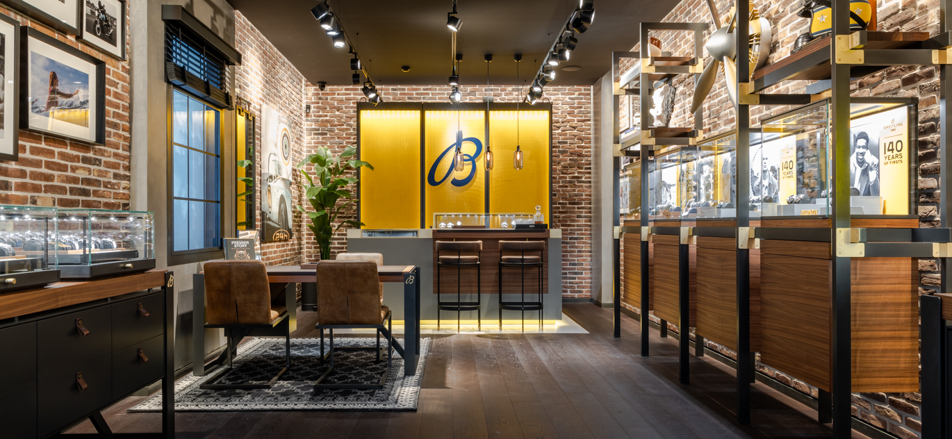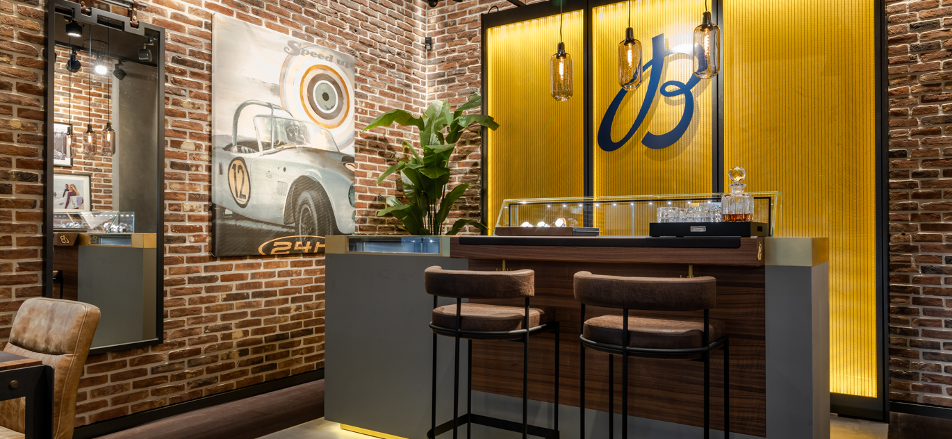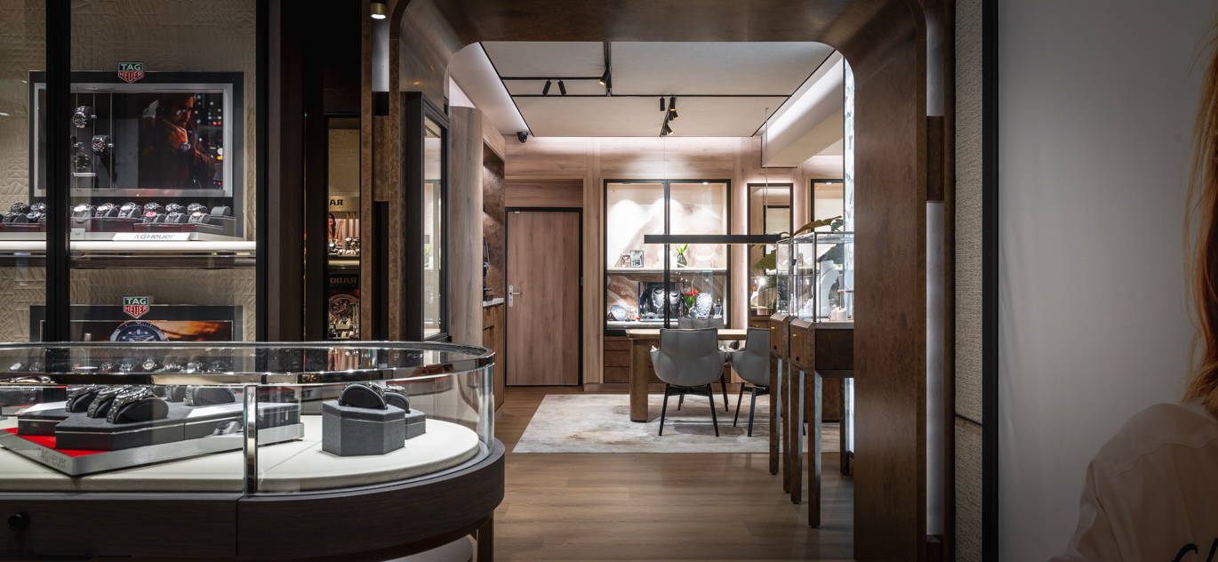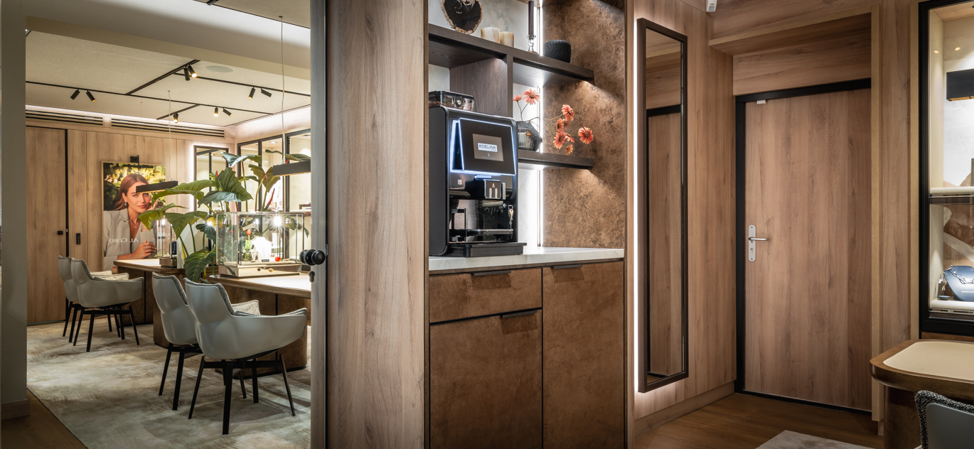Nico Schreuder vertelt: “Aan WSB de vraag om achterin de winkel een verbinding te maken met de bestaande winkel, die opereert in het midden-hoge segment, maar meer ruimte nodig had om in het hogere segment haar vleugels verder uit te slaan. De uitdaging was om van het huidige kantoor en de werkplaats een high-end architectonisch pareltje te maken dat qua stijl en niveau aansluit bij Breitling, dat daar ook gelijktijdig geplaatst is.”