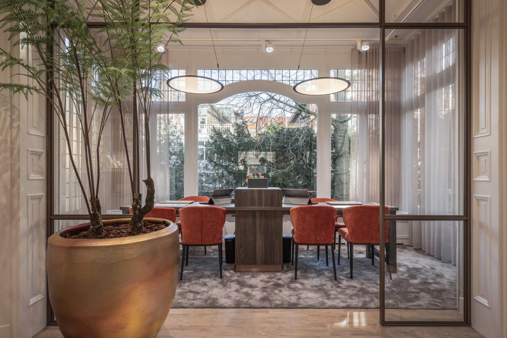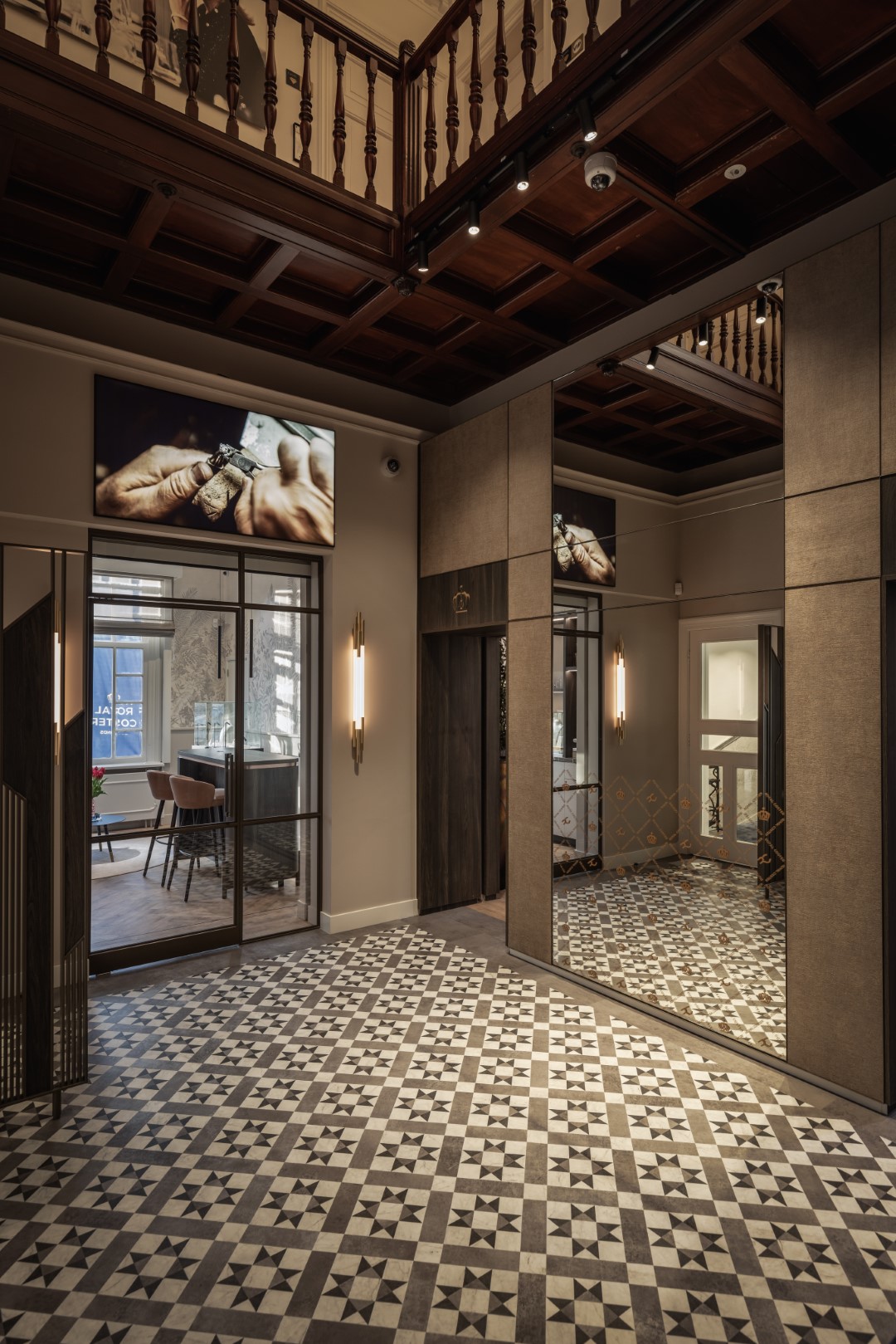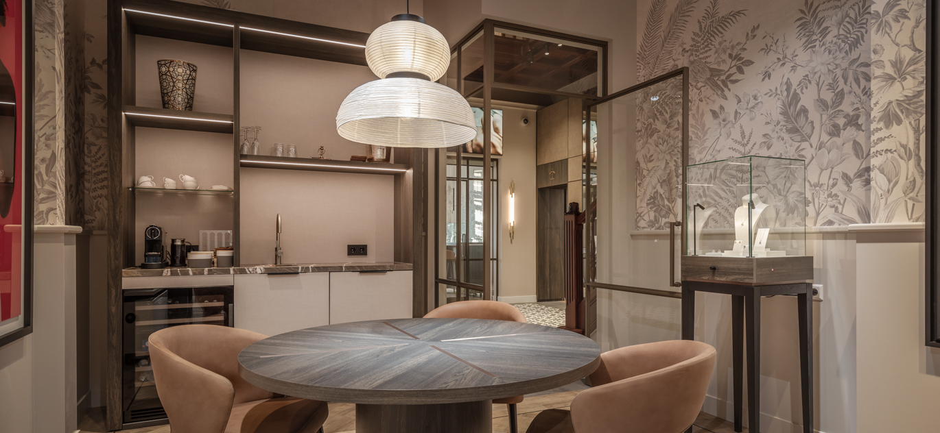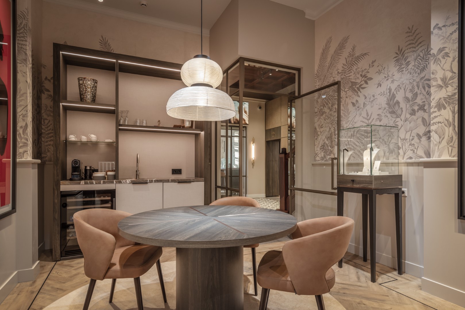 Het winkelontwerp is gemaakt op de pracht van het monumentale pand. Warme en rijke materialen zoals Élitis behang, natuursteen, design verlichting en sfeervolle stoffen van Kirkby zijn zorgvuldig gekozen door de designers van WSB, passend bij het karakter en het niveau van de collectie.