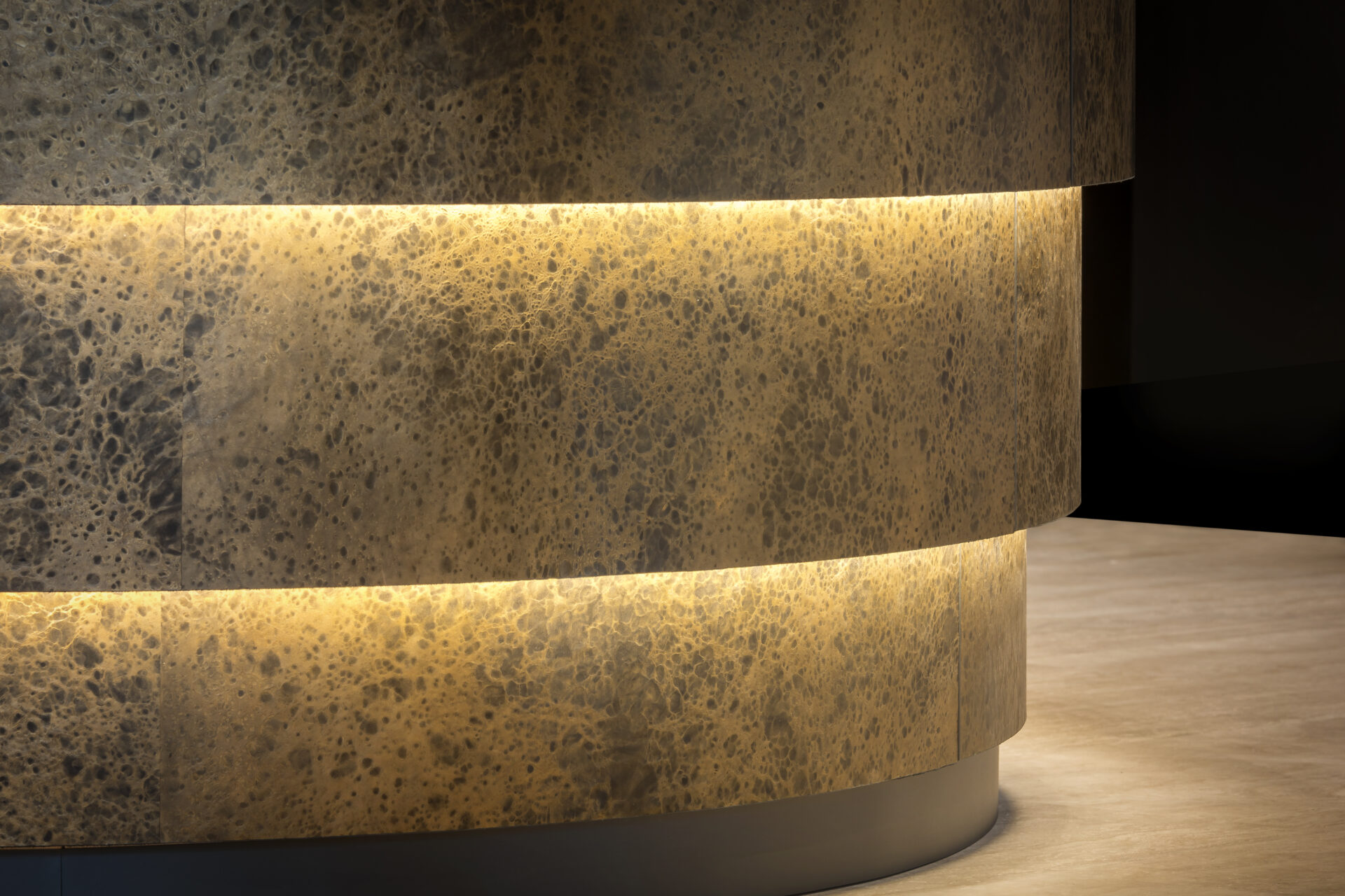 Om de exclusiviteit van de merken te ondersteunen is er gebruik gemaakt van materialen op hetzelfde niveau zoals marmer en leer. De winkel krijgt hierdoor de internationale allure passend bij de straat, het winkelpand en de merken die worden verkocht. Een echte eye-catcher is de met leer beklede balie in een messing kleur, hierin is indirect licht verwerkt. Door een trap met loopbrug te maken is de mogelijkheid ontstaan het plafond te verwijderen zonder dat werkruimtes opgeofferd zijn.