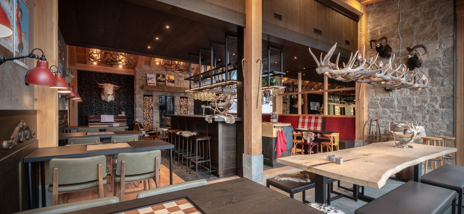 Onbewerkt Douglas houten plafonds en vloer maken de basis warm en gezellig. Verder maakten we bij de inrichting gebruik van materialen als leer, staal, wol en: nog meer hout. Alles is afgestyled in alpine sfeer met houten skies, vintage ski billboards, Zwitserse koeienbellen en een hoop opgezette dieren in alle soorten en maten (allemaal een zachte natuurlijke dood gestorven uiteraard). Al met al de perfecte plek om iedere pauze met het team te ontspannen of tijd te nemen voor een goede borrel. Hard werken is hard onstpannen!