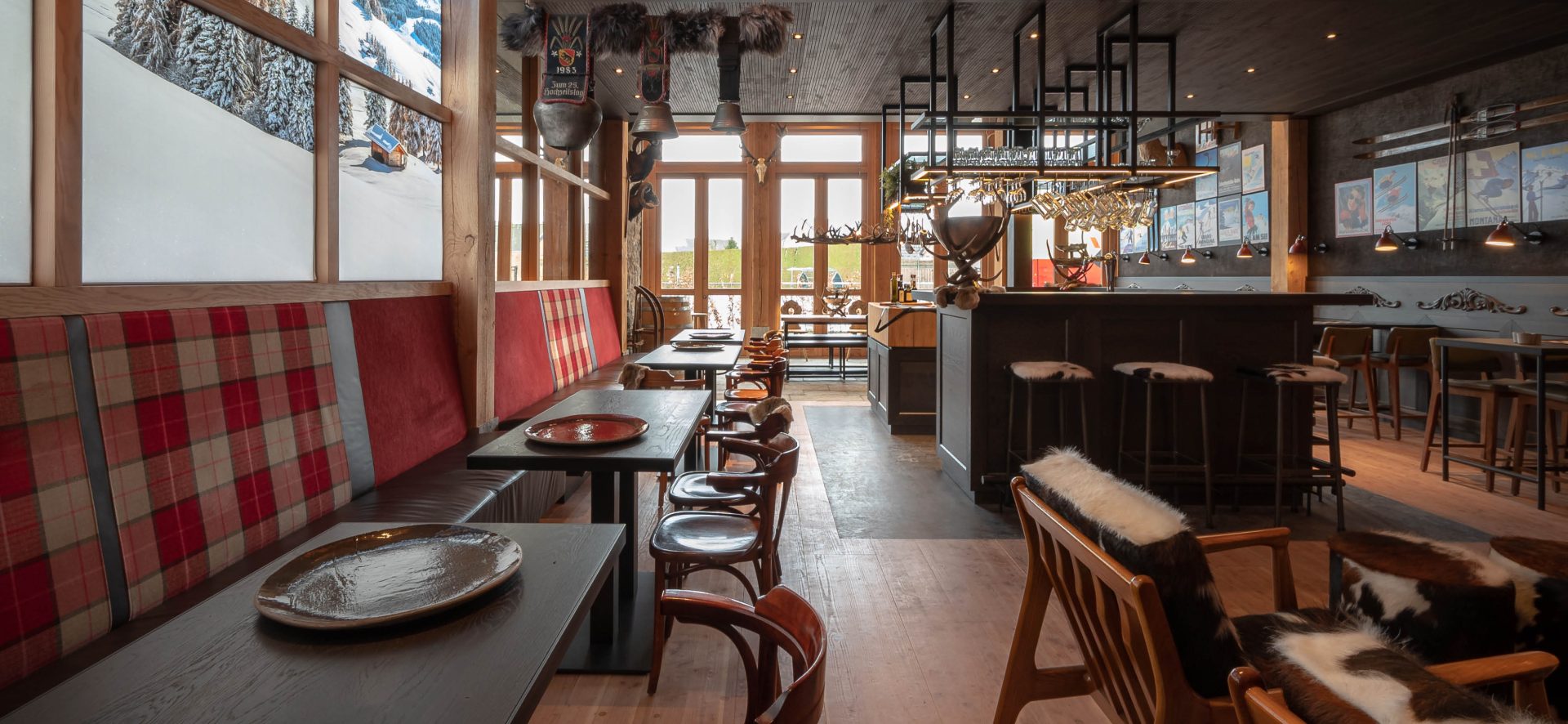 De zits zijn aan lange koffietafels, hoge bartafels of juist laag bij de open haard, voor ieder moment en iedere stemming iets. Aan de inpandige ruimte is een grote serre gebouwd met veel hoogte en licht. Dit zorgt ervoor dat het een fijne plek is in elk seizoen. Centraal middelpunt van de bedrijfskantine is natuurlijk de bar. Een ingebouwde tap, koeling, grote pizza oven en kookplaat zorgen ervoor dat we van iedere borrel een top feestje kunnen maken. De grote verlichte visual wekt de illusie zo het berglandschap in te kijken. Doordat dit vervangbare doeken zijn is dit eenvoudige aan te passen aan de seizoenen.