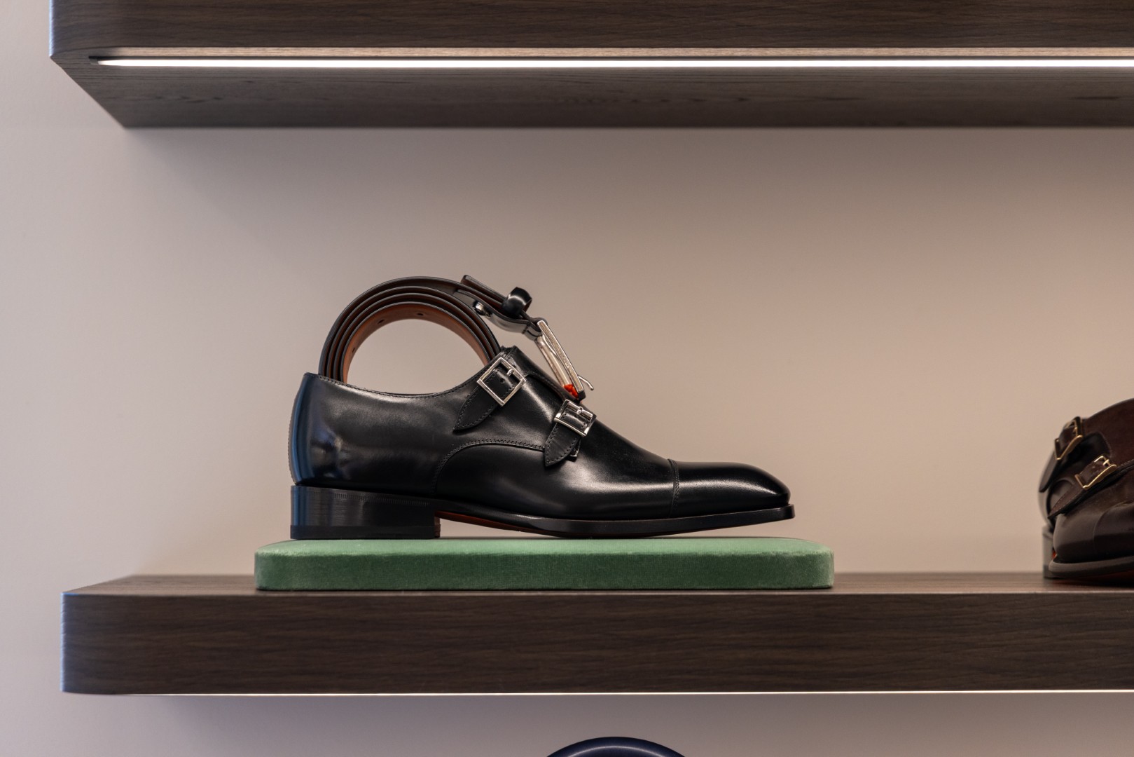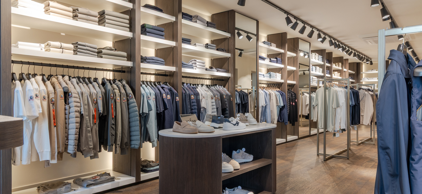 De kasten zijn voorzien van een flexibel hangsysteem en geïntegreerde verlichting, zodat de kleding optimaal gepresenteerd wordt. De eikenhouten vloer heeft een tweede leven gekregen en sluit perfect aan bij de uitstraling van de boetiek. Het geheel is verfijnd en praktisch, en biedt een luxe winkelervaring voor zowel heren als kinderen.