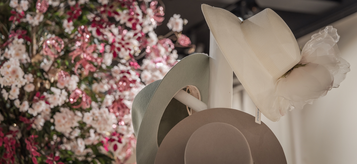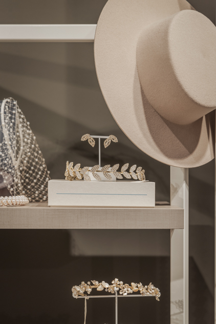 Datail van showroom inrichting en meubilair voor bruidsmode accessoires merk Poirier.