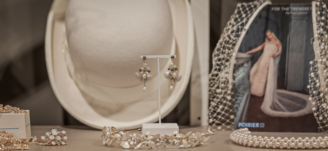 Showroom inrichting van bruidsmode accessoires merk Poirier in Weddingworld in Oberhausen.