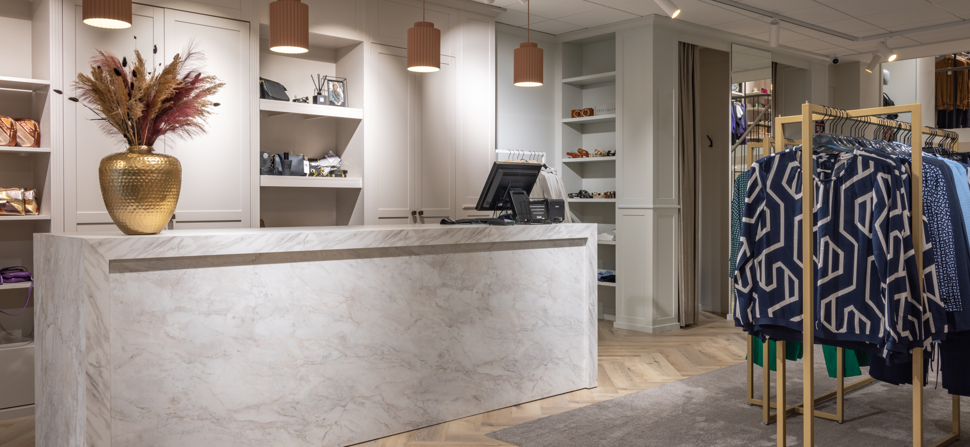 Blush Mode heeft er weer een nieuwe vestiging bij! In het centrum van Rijssen, op een prachtige plek, geheel in het nieuw gestoken. De winkel voor damesmode heeft een split level waardoor er meerdere gezellige hoeken ontstaan met als centraal middelpunt een prachtige bar. Alles is optimaal transparant gemaakt zodat het overzicht in de winkel goed is. Fijn voor de klant en fijn voor de medewerkers. De kleurstelling is herkenbaar en in lijn met de andere Blush winkels. Zachte taupe tinten, goud, natuursteen en hout in combinatie met een lichte basis. Dit maakt het geheel eigentijds, warm en toegankelijk voor een breed publiek.