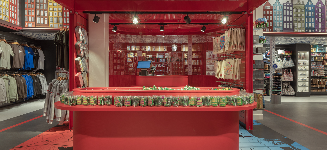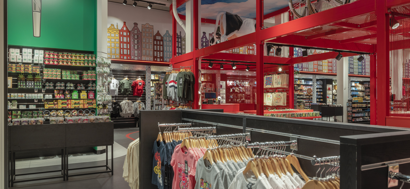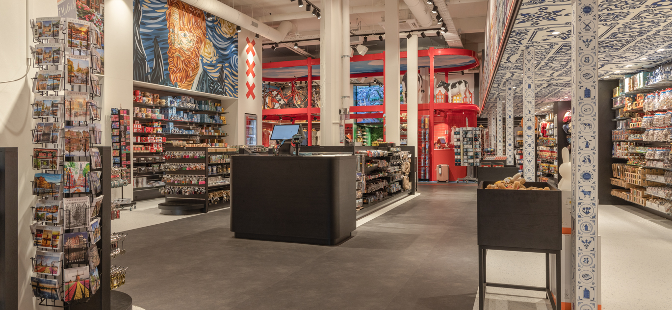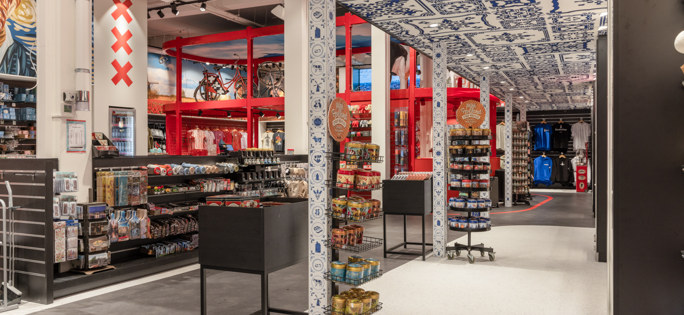 Als allereerst heeft WSB de souvenirwinkel een heldere routing gegeven, gemarkeerd doormiddel van looplijnen. Hierdoor worden de klanten automatisch door heel de winkel en daarmee langs het gehele assortiment geleid. Gaandeweg komen vele Hollandse en Amsterdamse thema’s aan bod, waardoor het bezoek aan de giftshop een echte ervaring is.
