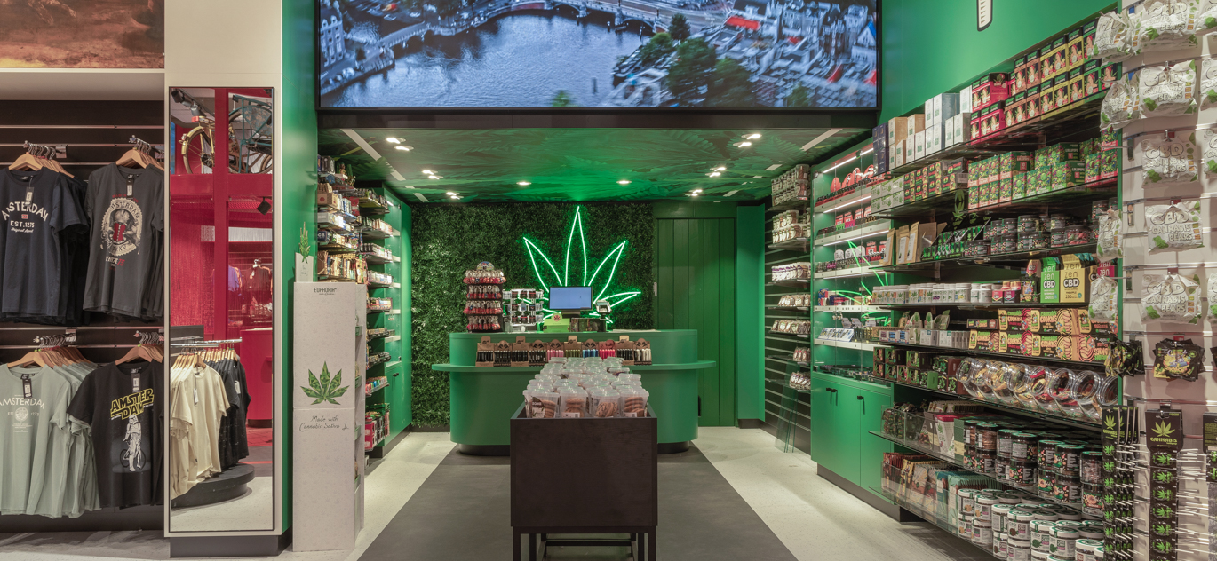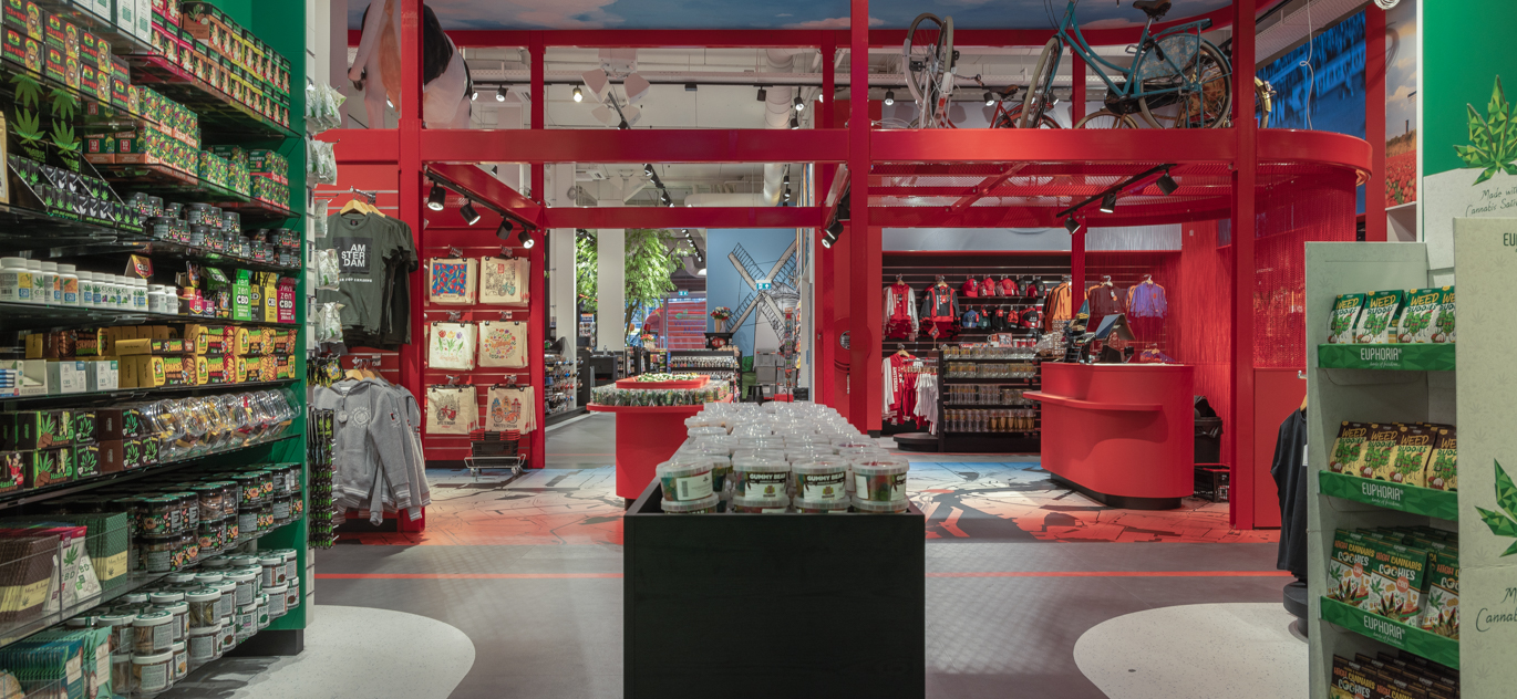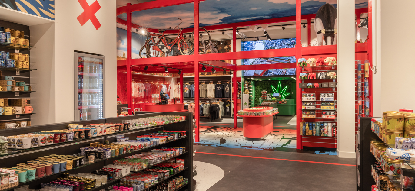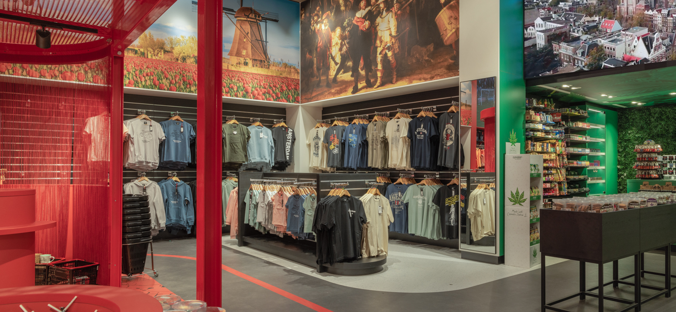 Van Delfts blauw tot de Amsterdamse wiet/marihuana cultuur, van Hollandse windmolens tot de bekende Amsterdamse rondvaartboten en van stroopwafels tot Ajax. We hebben de bekende thema’s doormiddel van fris kleur- en beeldgebruik, een hedendaagse beleving meegegeven. Ook zijn er grote led-schermen aangebracht, welke voor de nodige interactie zorgen. Daarnaast is de gehele basis van de giftshop voorzien van flexibele inhang mogelijkheid, waardoor er op elk seizoen geanticipeerd kan worden. WSB vond de opdracht voor de winkelinrichting van souvenirwinkel Amsterdam Experience een geweldige opdracht, één waar veel creativiteit in kwijt kon.