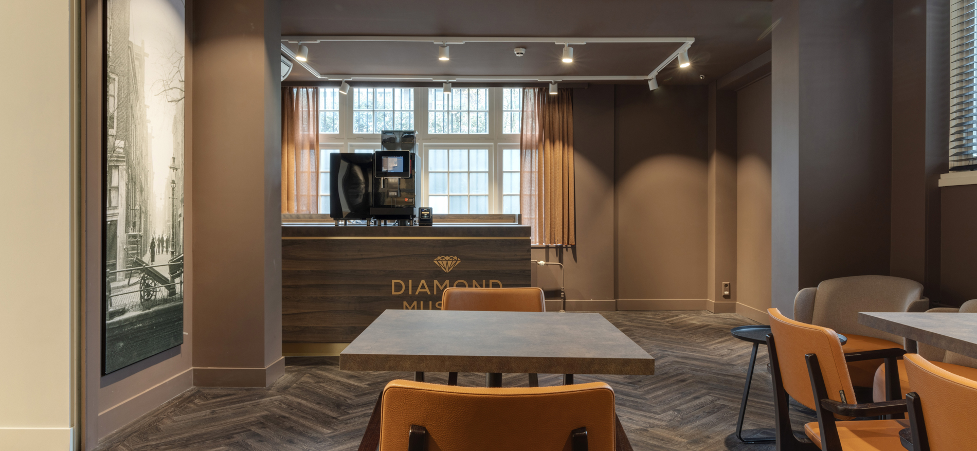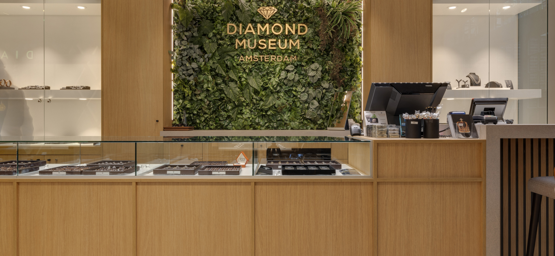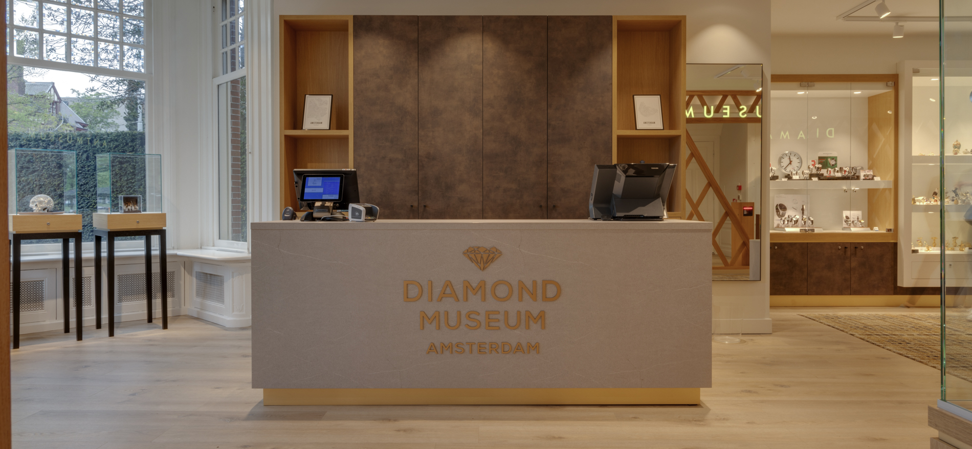 Op een prachtige plek aan het Museumplein bevindt zich de shop van het Diamant Museum in Amsterdam. Dagelijks passeren hier vele duizenden internationale bezoekers. De shop is de laatste ruimte voordat de bezoekers van zowel Coster Diamonds als het Diamant Museum het pand verlaten. De sfeer was voorheen toeristisch georiënteerd met veelal standaard souvenirs. In de nieuwe situatie moesten vooral de high end souvenirs en diamanten beter gepresenteerd worden. Tevens is er een horeca gedeelte gecreëerd waar bezoekers rustig een kop koffie kunnen drinken. De winkel is voorzien van speciale vitrines waar de diamanten extra mooi fonkelen.