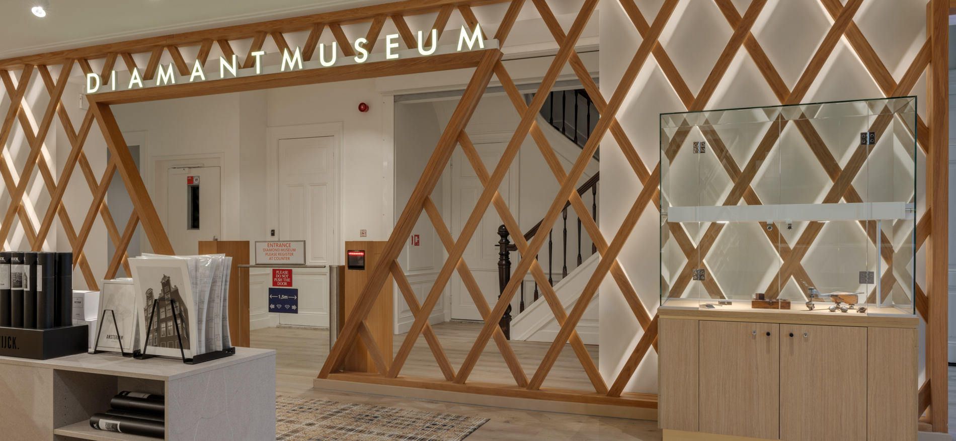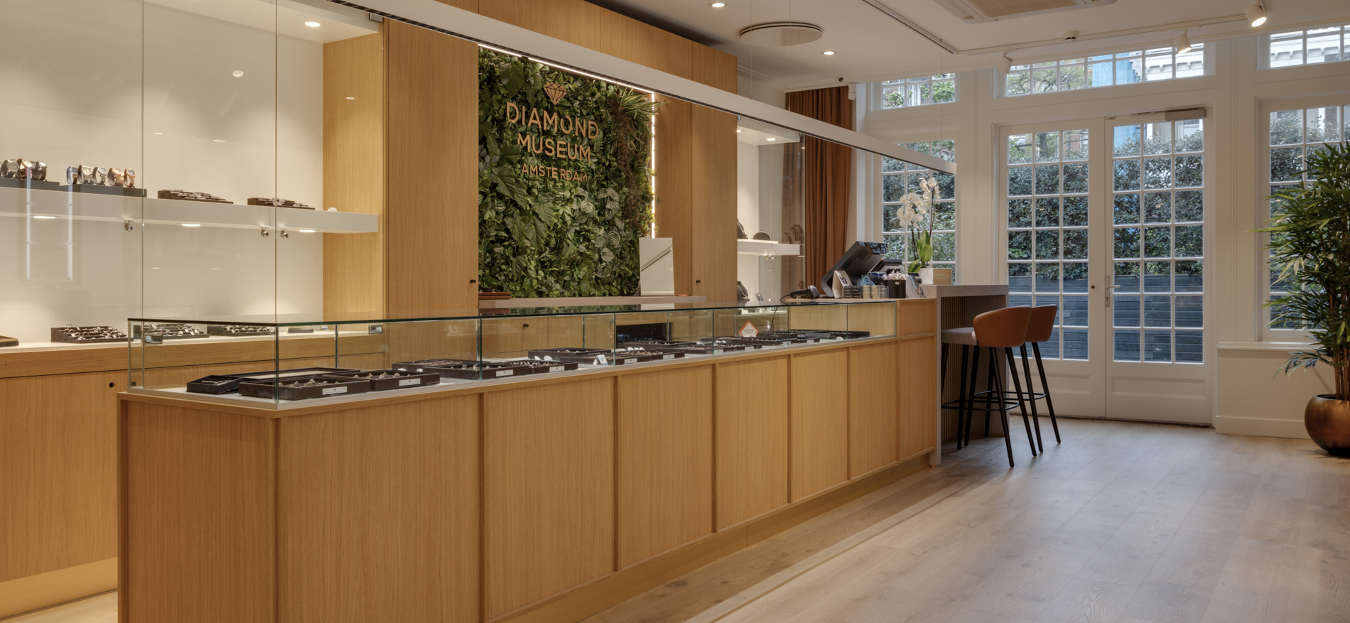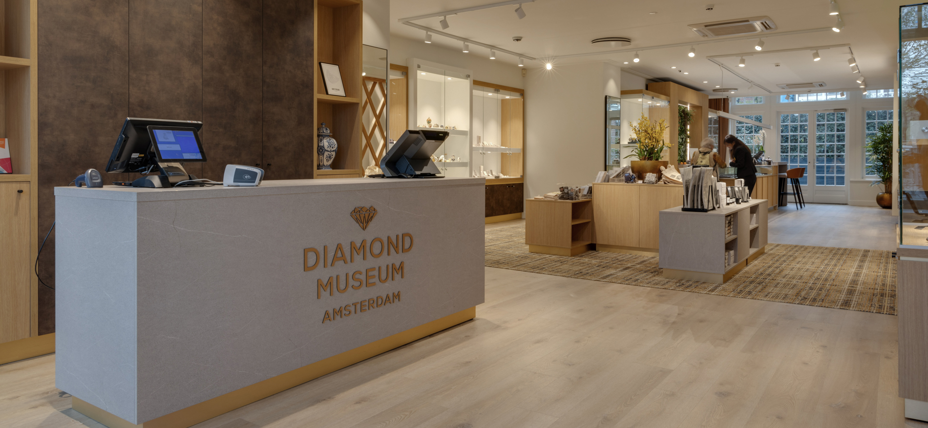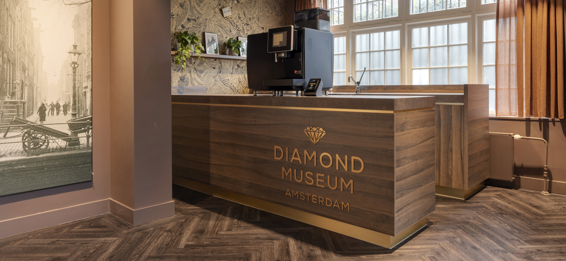Op een prachtige plek aan het Museumplein bevindt zich de shop van het Diamant Museum in Amsterdam. Dagelijks passeren hier vele duizenden internationale bezoekers. De shop is de laatste ruimte voordat de bezoekers van zowel Coster Diamonds als het Diamant Museum het pand verlaten. De sfeer was voorheen toeristisch georiënteerd met veelal standaard souvenirs. In de nieuwe situatie moesten vooral de high end souvenirs en diamanten beter gepresenteerd worden. Tevens is er een horeca gedeelte gecreëerd waar bezoekers rustig een kop koffie kunnen drinken. De winkel is voorzien van speciale vitrines waar de diamanten extra mooi fonkelen.