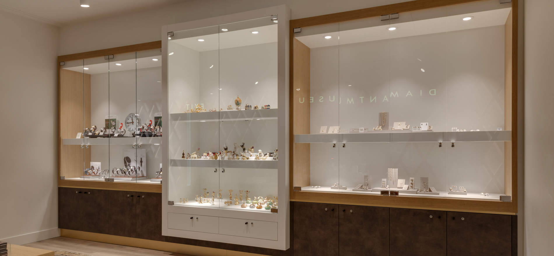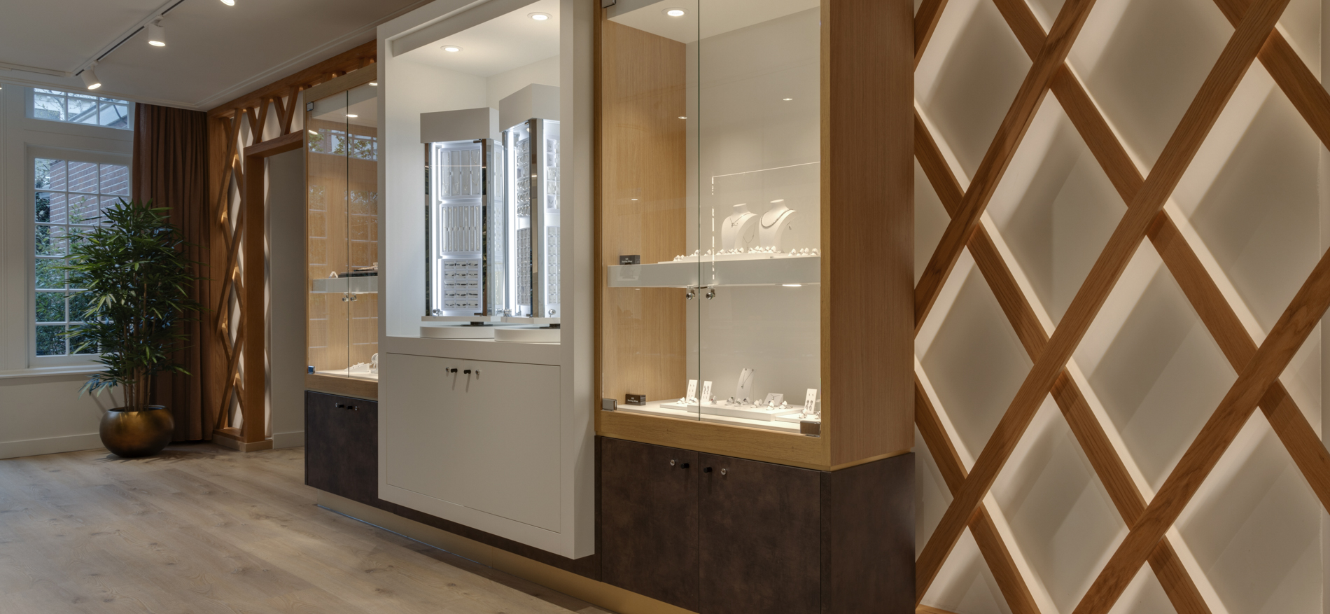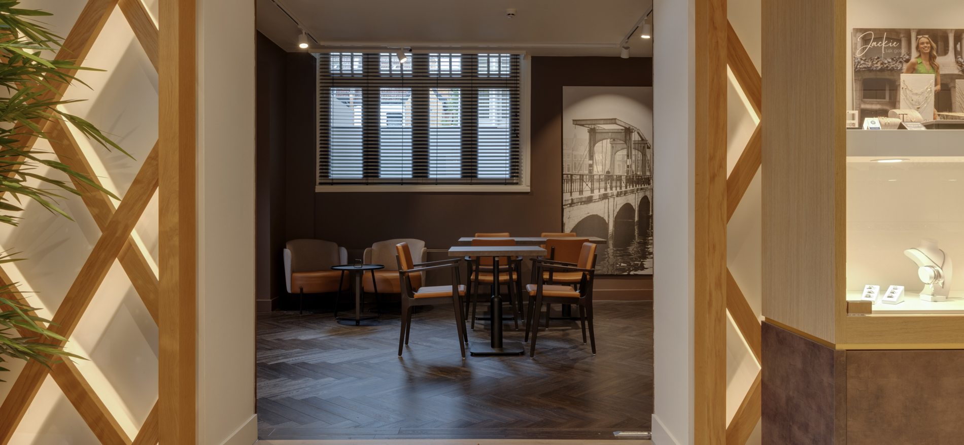 Hoogtepunt is de bar waar klanten hun diamanten sieraad kiezen met een kopje koffie of een glaasje cava. De luxe souvenirs worden uitgestald op verschillende flexibele stellages. Deze stellages zijn flexibel in te zetten zodat er met de winkelruimte gespeeld kan worden en er ook ruimte ontstaat voor bijvoorbeeld evenementen met grote groepen. De sfeer is licht en toegankelijke luxe met de horeca als donkere, gezellige tegenhanger. Al met al is het een fantastische ruimte geworden waar ook de verkoop flink is gestegen!