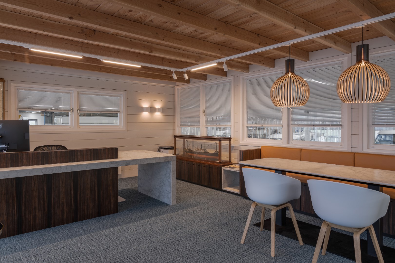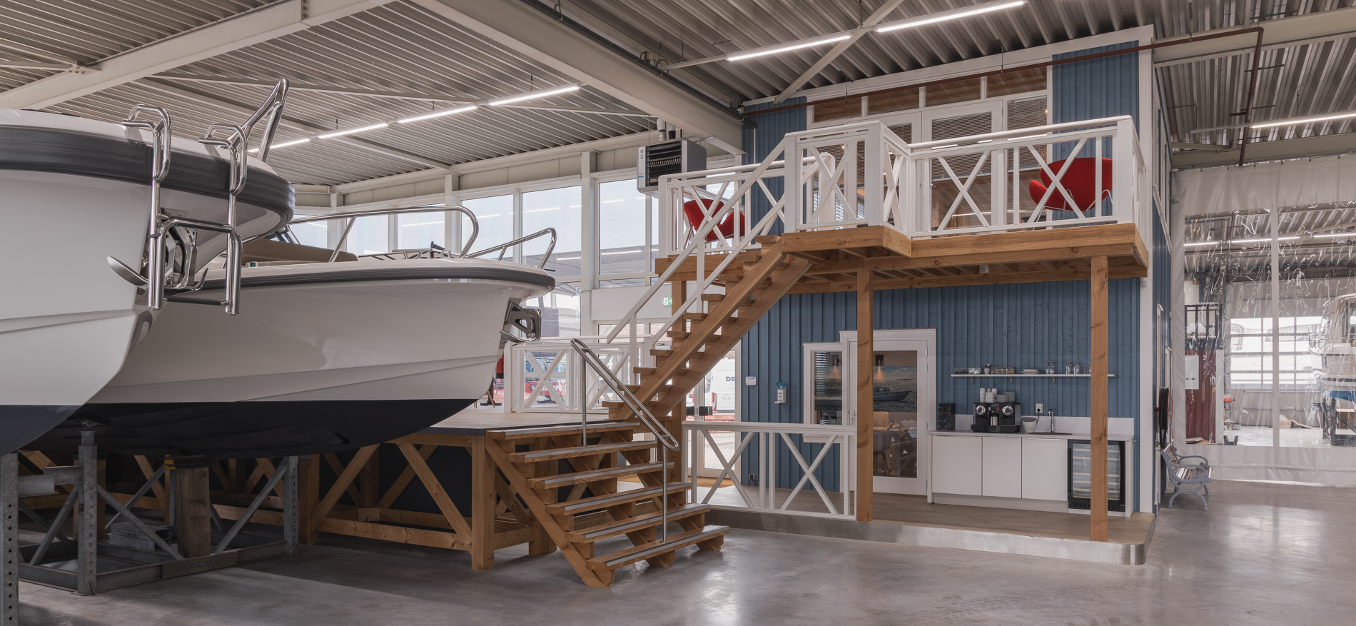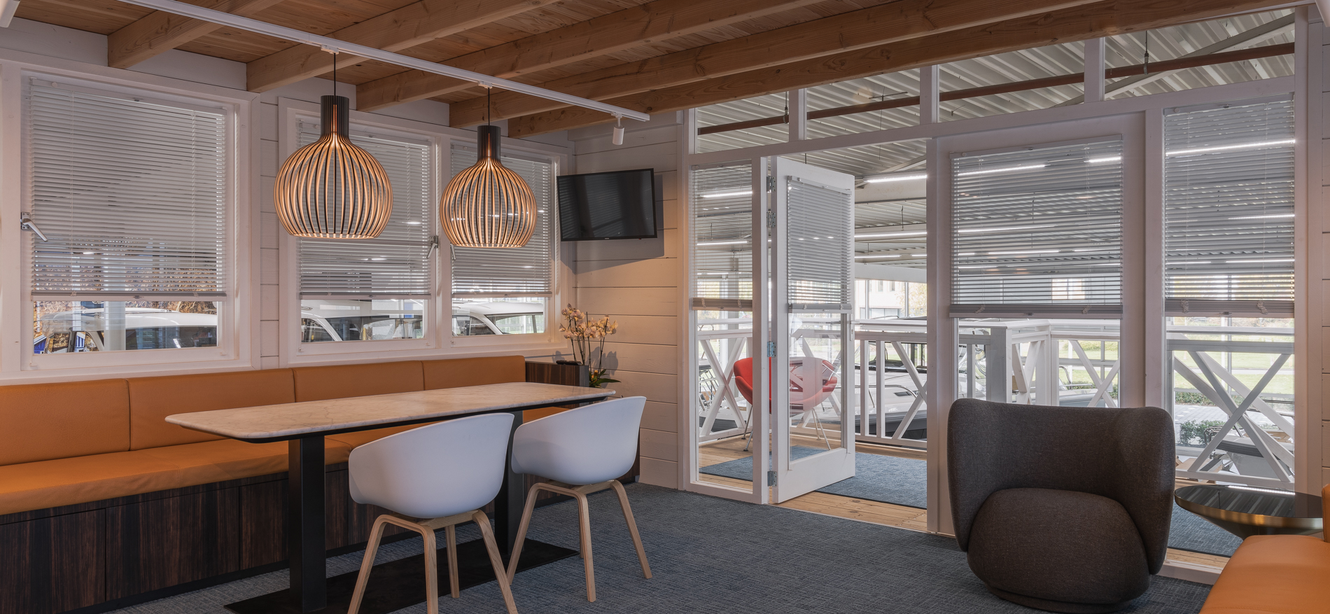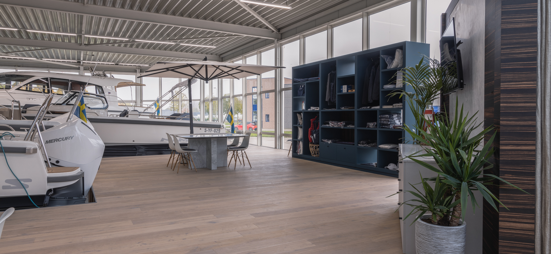 De kernvragen die we in goed overleg met opdrachtgever overdacht hebben, maar ook: hoe manoeuvreer je flexibel in de ruimte met name met de grote boten? En, niet onbelangrijk, hoe geef je de klant een overzichtelijk podium tussen al dat volumineus geweld van grote en kleinere boten? Met genoemde uitdagingen hebben de architecten van WSB gezocht naar oplossingen die alle vragen moesten beantwoorden. Over de Zweedse roots: daarvoor hebben we gekozen door een wand van 13 meter te bekleden met een grootse foto uitgelicht met achterliggende LED. De bestaande kantoorunit op de begane grond is met een extra verdieping uitgebreid en uitgevoerd als een Zweeds huis in full color. De klant heeft letterlijk zijn en haar podium gekregen middels een aanlegsteiger waarop prachtige verkoopplekken zijn ontworpen; high-end vormgeving, Carrara marmer met leerinleg en terrasparasols van Borek geven de klant de ultieme jachthaven beleving. Voor de verkoop van de accessoires zijn de presentatiekasten uitgevoerd in Coromandelfineer met spuitwerk. Ook de verkoopkantoren in het Zweedse huis zijn in deze high-end materialen uitgevoerd en geven de ruimten samen met de houten Zweedse sfeer een warme ambiance.