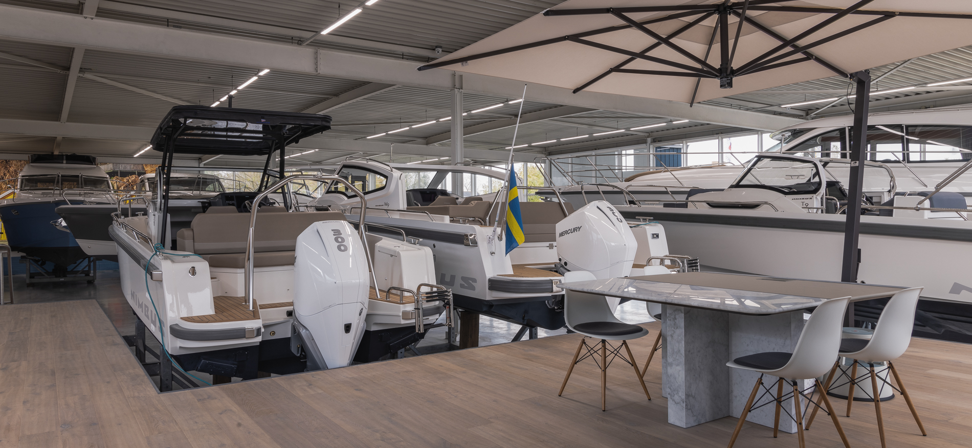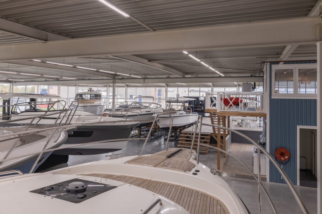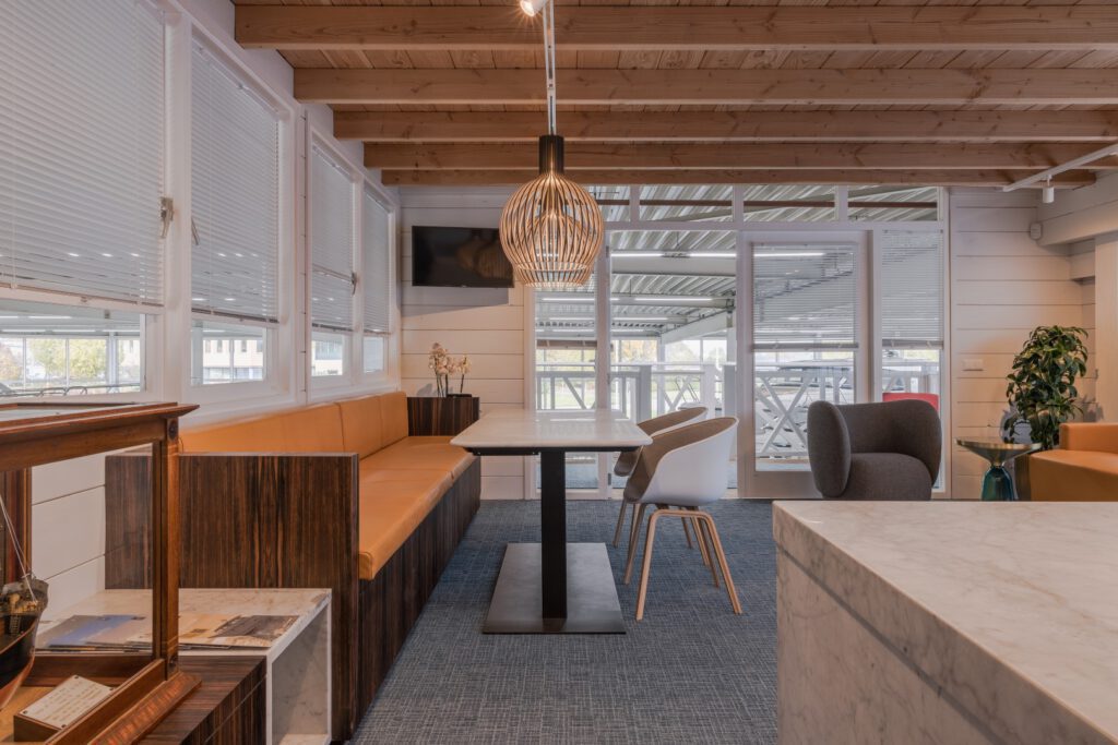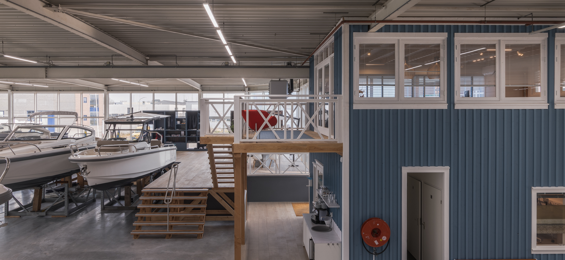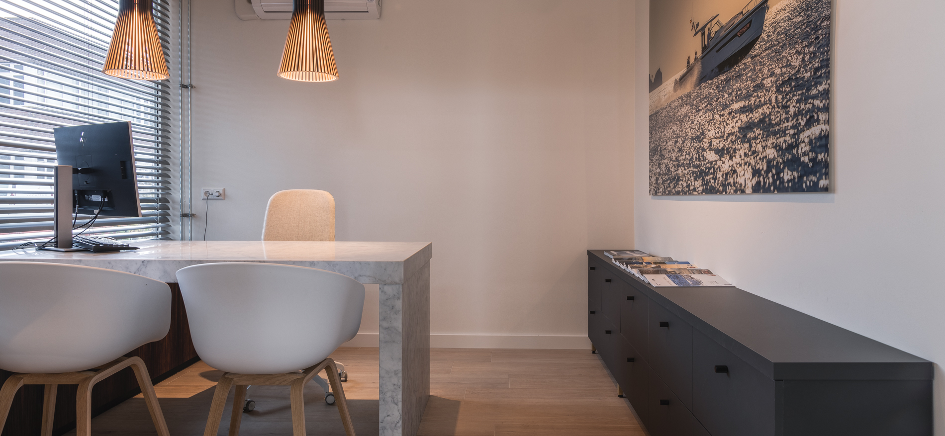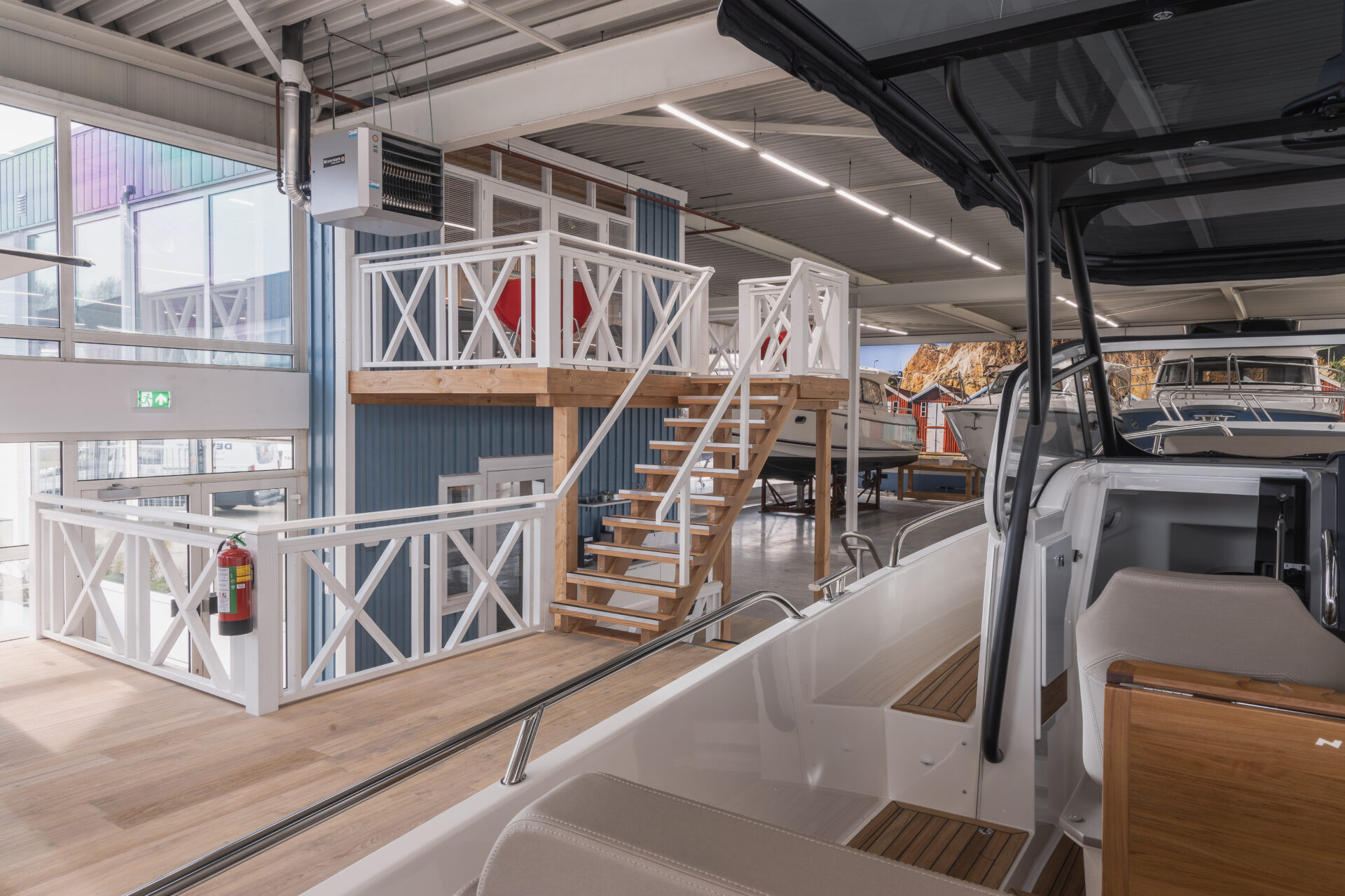 De kernvragen die we in goed overleg met opdrachtgever overdacht hebben, maar ook: hoe manoeuvreer je flexibel in de ruimte met name met de grote boten? En, niet onbelangrijk, hoe geef je de klant een overzichtelijk podium tussen al dat volumineus geweld van grote en kleinere boten? Met genoemde uitdagingen hebben de architecten van WSB gezocht naar oplossingen die alle vragen moesten beantwoorden. Over de Zweedse roots: daarvoor hebben we gekozen door een wand van 13 meter te bekleden met een grootse foto uitgelicht met achterliggende LED. De bestaande kantoorunit op de begane grond is met een extra verdieping uitgebreid en uitgevoerd als een Zweeds huis in full color. De klant heeft letterlijk zijn en haar podium gekregen middels een aanlegsteiger waarop prachtige verkoopplekken zijn ontworpen; high-end vormgeving, Carrara marmer met leerinleg en terrasparasols van Borek geven de klant de ultieme jachthaven beleving. Voor de verkoop van de accessoires zijn de presentatiekasten uitgevoerd in Coromandelfineer met spuitwerk. Ook de verkoopkantoren in het Zweedse huis zijn in deze high-end materialen uitgevoerd en geven de ruimten samen met de houten Zweedse sfeer een warme ambiance.