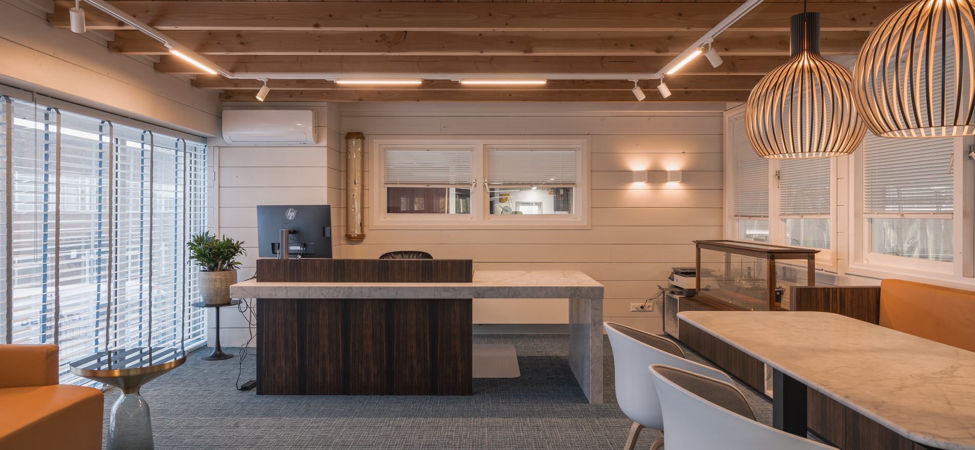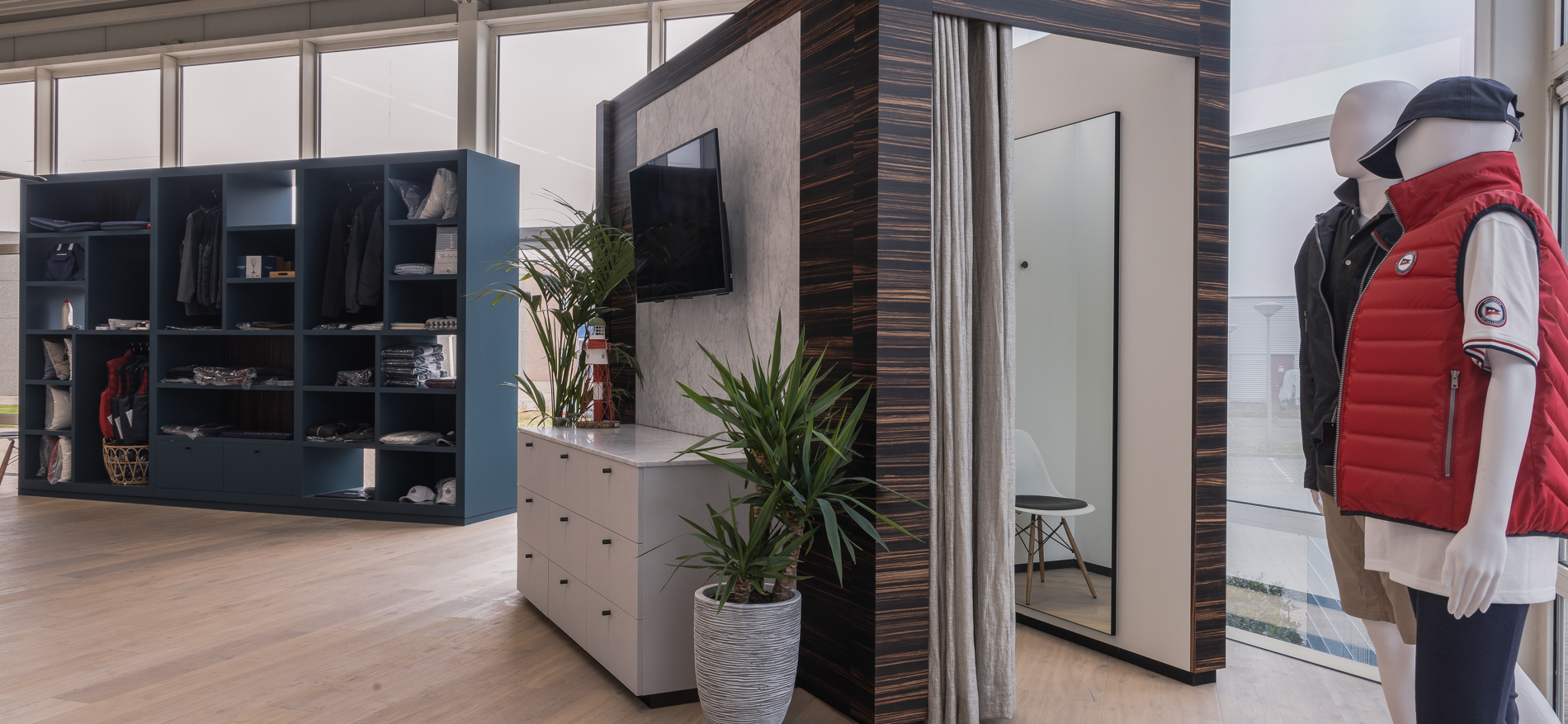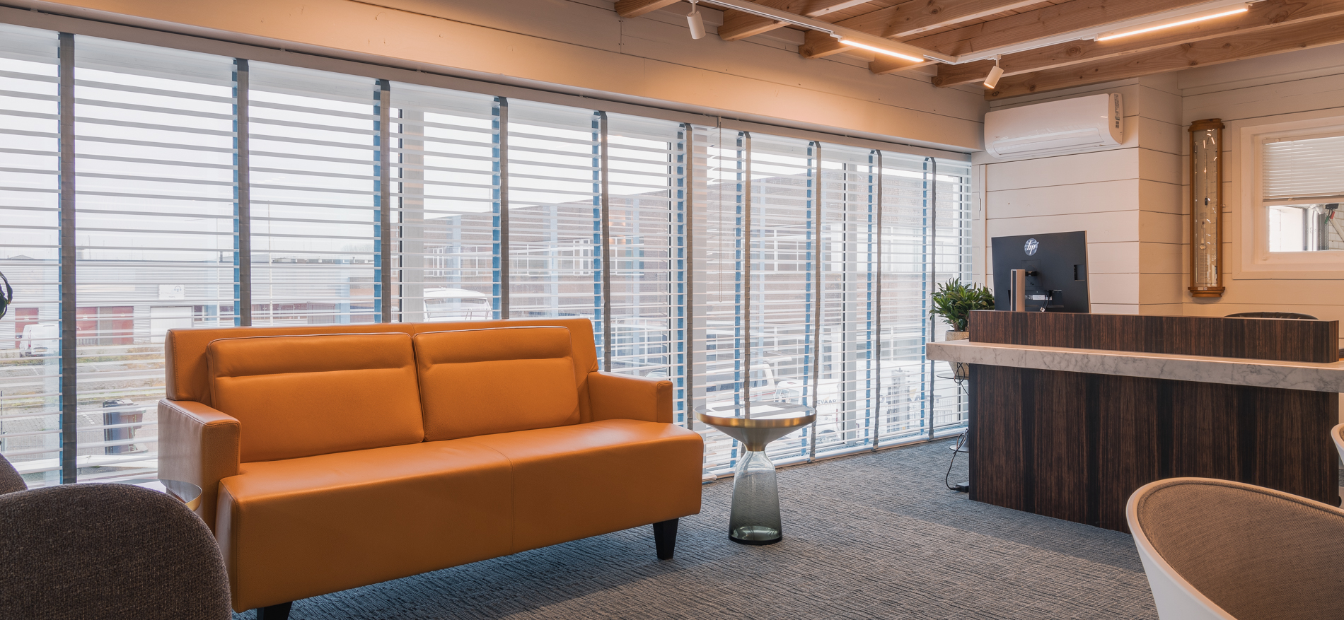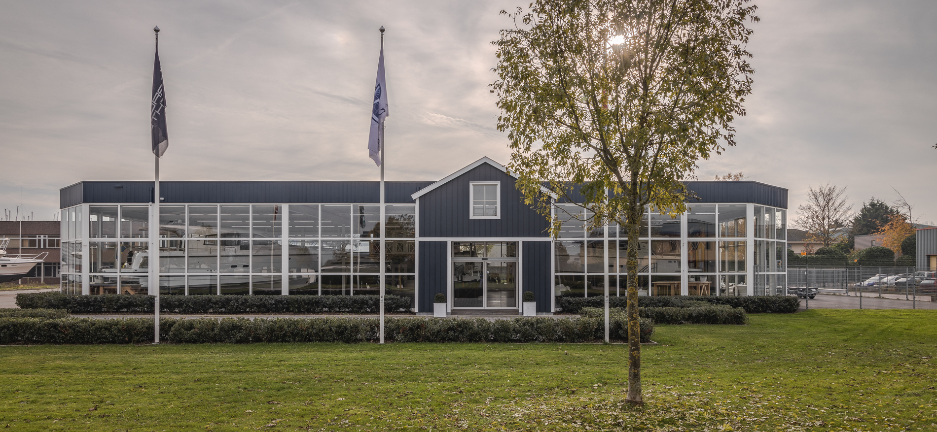 De kernvragen die we in goed overleg met opdrachtgever overdacht hebben, maar ook: hoe manoeuvreer je flexibel in de ruimte met name met de grote boten? En, niet onbelangrijk, hoe geef je de klant een overzichtelijk podium tussen al dat volumineus geweld van grote en kleinere boten? Met genoemde uitdagingen hebben de architecten van WSB gezocht naar oplossingen die alle vragen moesten beantwoorden. Over de Zweedse roots: daarvoor hebben we gekozen door een wand van 13 meter te bekleden met een grootse foto uitgelicht met achterliggende LED. De bestaande kantoorunit op de begane grond is met een extra verdieping uitgebreid en uitgevoerd als een Zweeds huis in full color. De klant heeft letterlijk zijn en haar podium gekregen middels een aanlegsteiger waarop prachtige verkoopplekken zijn ontworpen; high-end vormgeving, Carrara marmer met leerinleg en terrasparasols van Borek geven de klant de ultieme jachthaven beleving. Voor de verkoop van de accessoires zijn de presentatiekasten uitgevoerd in Coromandelfineer met spuitwerk. Ook de verkoopkantoren in het Zweedse huis zijn in deze high-end materialen uitgevoerd en geven de ruimten samen met de houten Zweedse sfeer een warme ambiance.