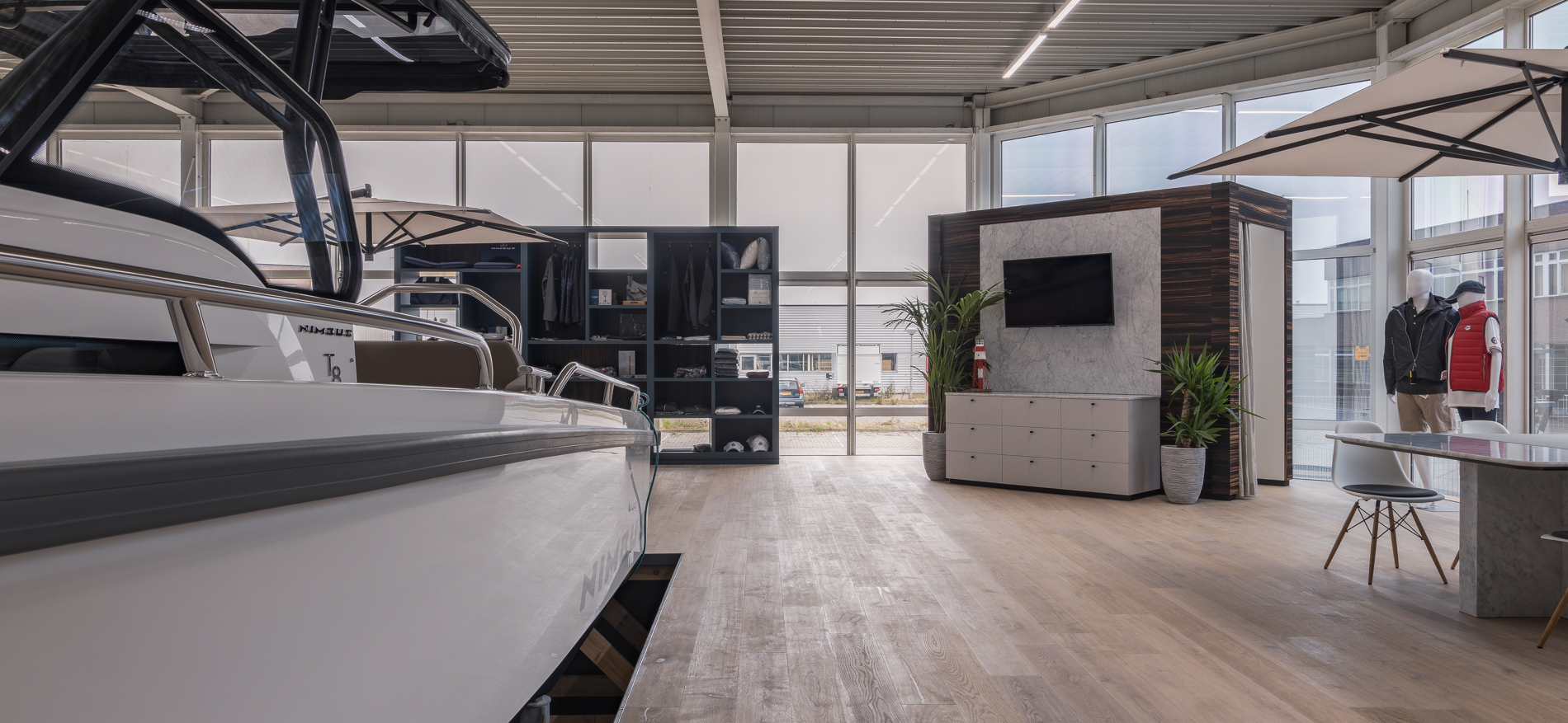Wat moet je met je luxe, gebruikte jachtenloods als de snelheid van de verkoop die van het aanbod overtreft? Dat was de uitdaging voor Arnold IJkelenstam eigenaar van De Vaart Yachting, de showroom kwam leeg te staan. Dat bood na enig denkwerk de mogelijkheid om een aparte showroom voor het Zweedse merk Nimbus in te richten. Via onze website wsbdesign.com onze projecten bekeken en gecontacteerd. Voor de designers van WSB een prachtige uitdaging: hoe geef je gestalte aan een prachtig eigenzinnig merk als Nimbus? En wat doen we met de Zweedse roots? Hoe laten we die tot uiting komen in de showroom beleving? Adviseren en het verkopen van een hoog prijssegment topproduct hoe doe je dat? Wat doen we met de warenpresentie van de accessoires? Hoe integreren we diverse kantoren en toiletpartij met pantry in de ruimte?