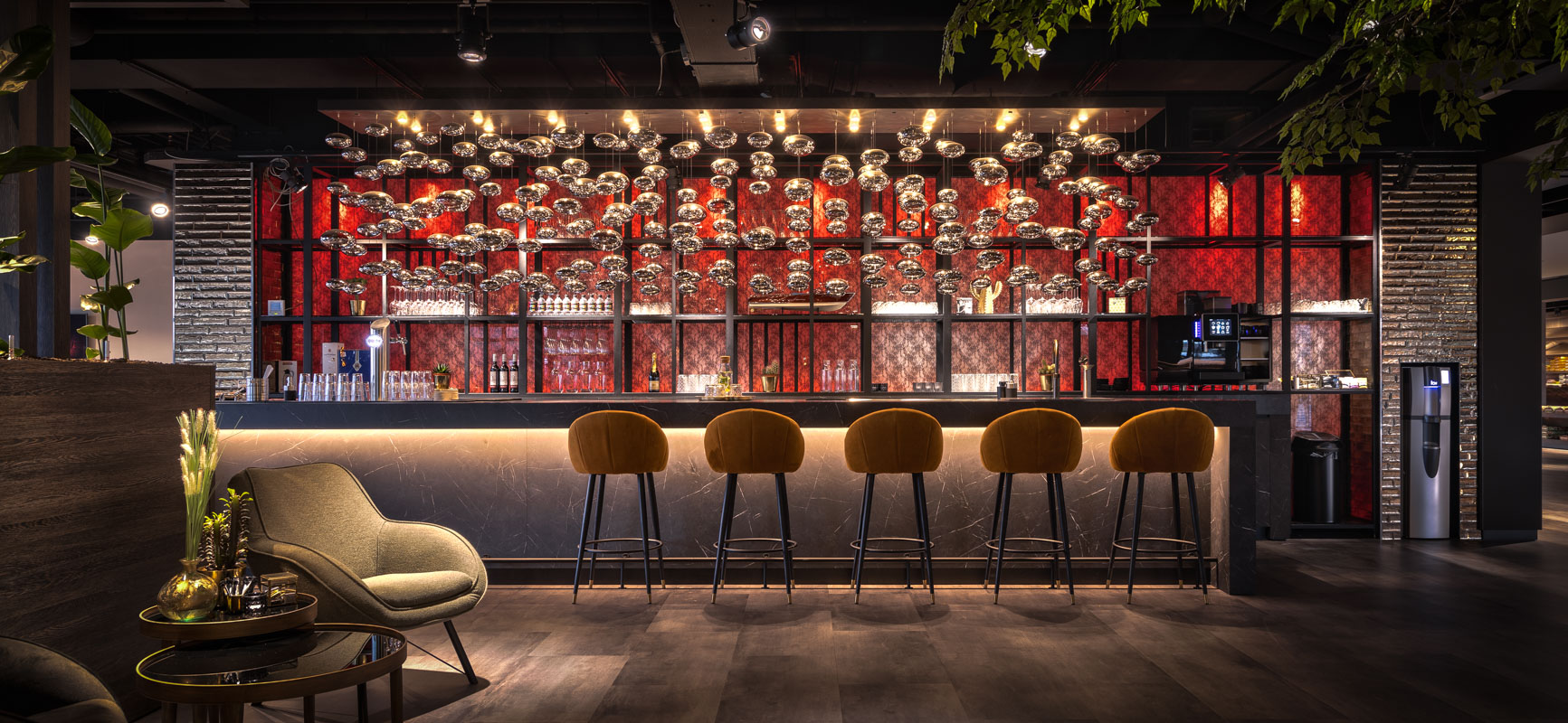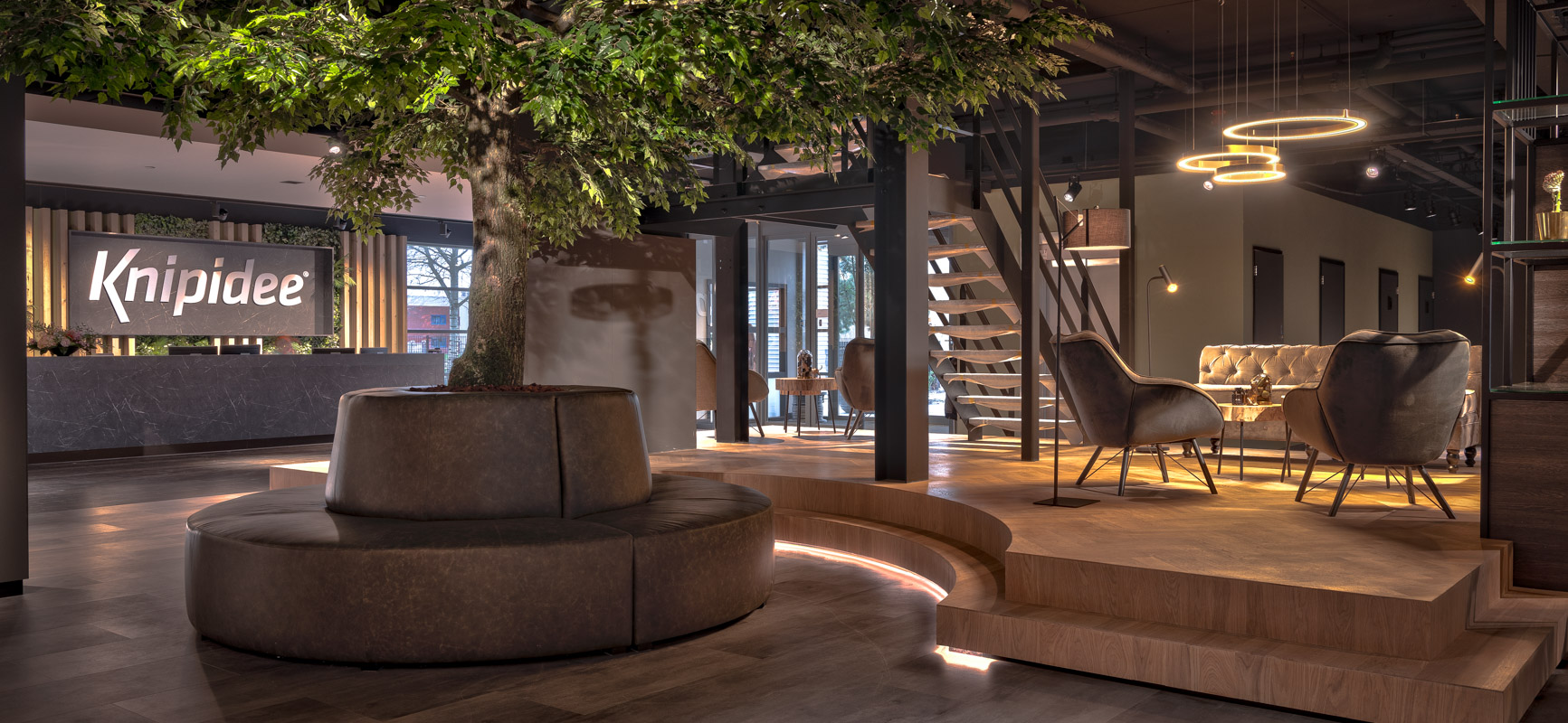 Experience centre knipidee en bar met verlichting in de nieuwe showroom en kantoorinrichting