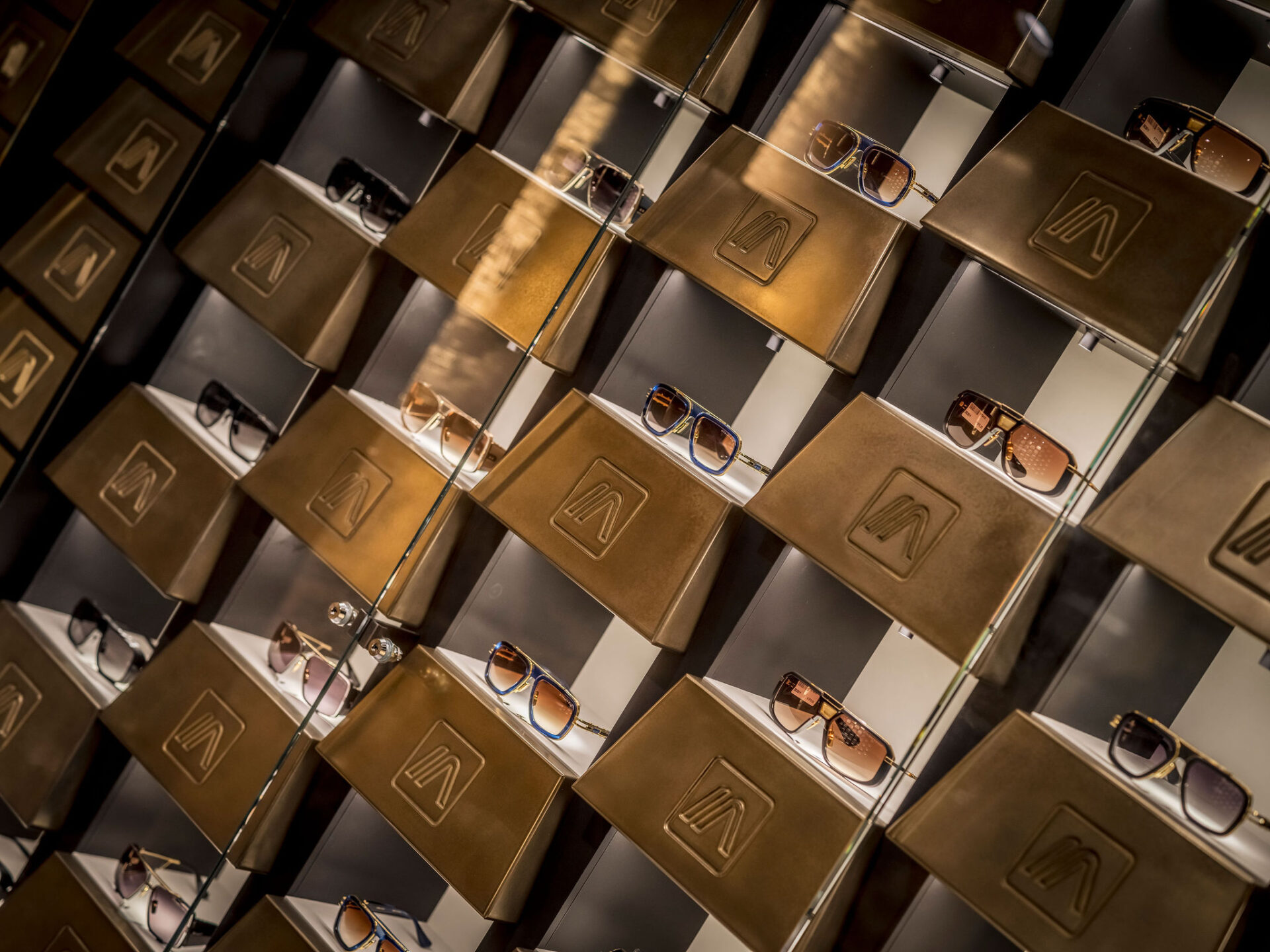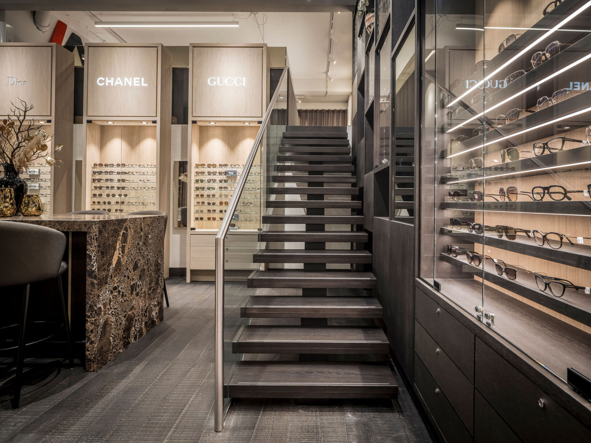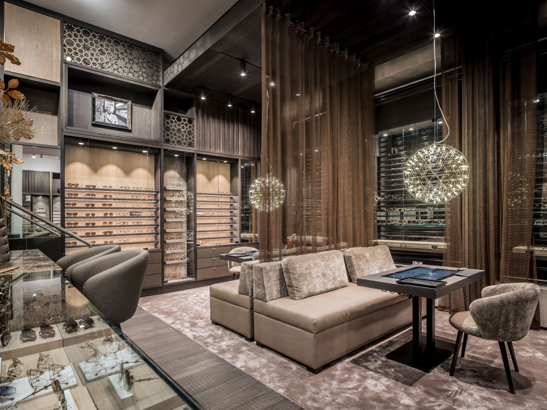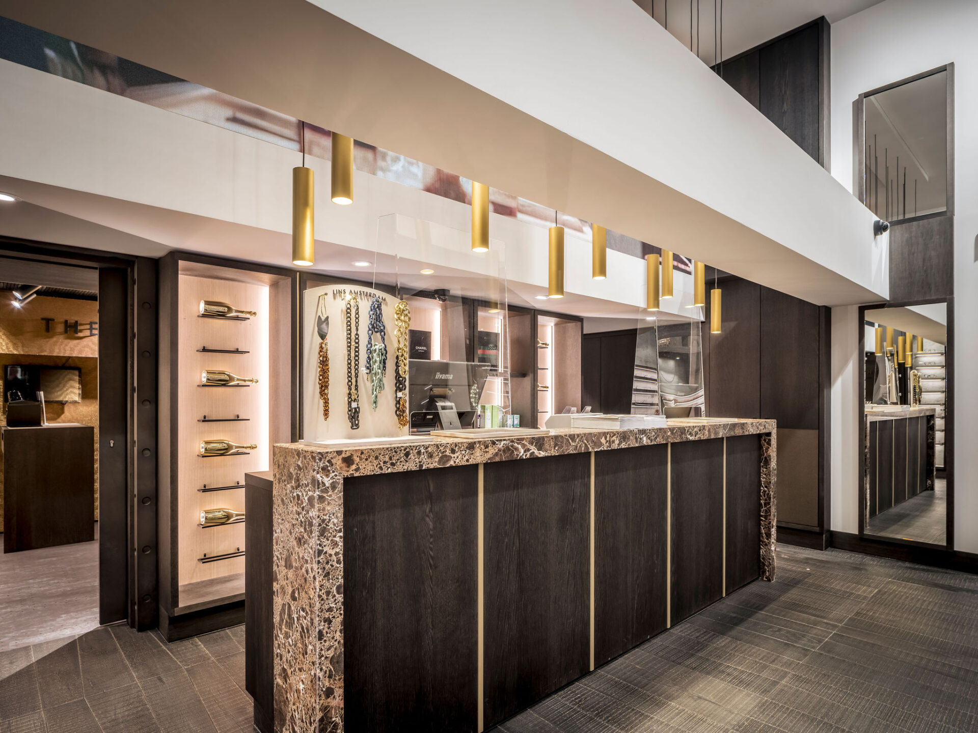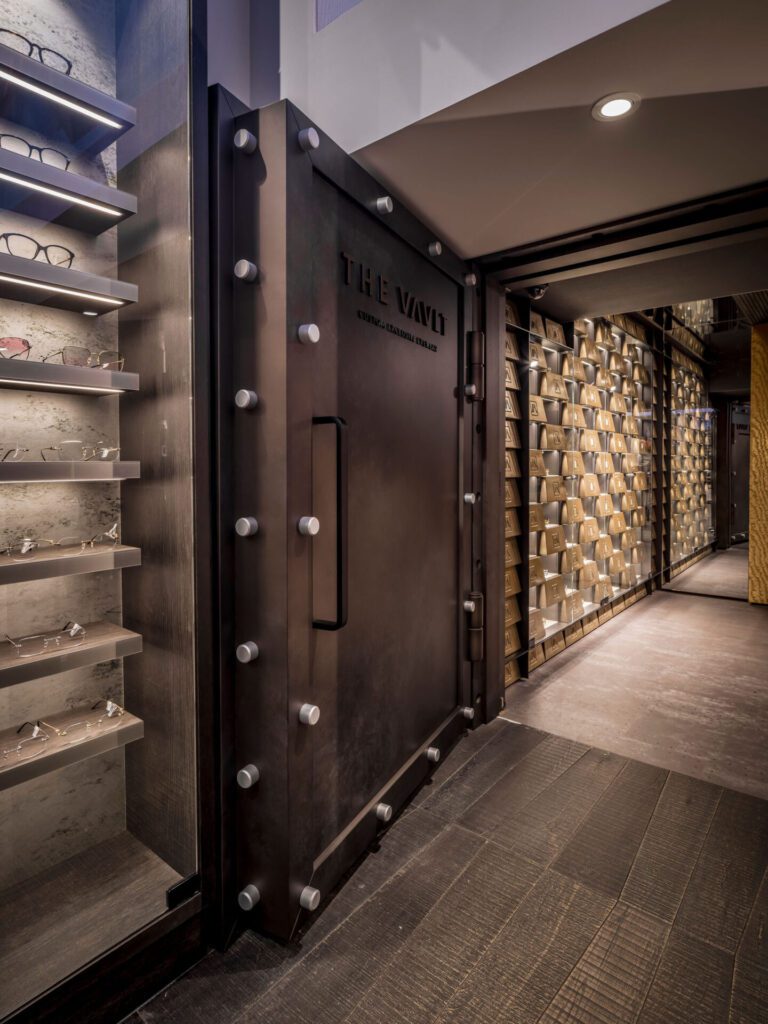 rappers, met het gevoel van een internationale hotellobby’. Nou, dat is gelukt in de winkelinrichting van de optiek zaak: een wereld van goud en diamant glanst je al bij de eerste stap over de drempel tegemoet met spiegels en goudbehang van Elitis. Een breed led-scherm hangt boven de balie, die afgewerkt is met marmer en leer. De trap is volledig geïntegreerd in de meer dan 5 meter hoge brillenwand. Het klapstuk vind je achterin de winkel: The Vault! De dikke kluisdeur geeft toegang tot de Goldbar World en daar is maar één woord mogelijk: wauw!