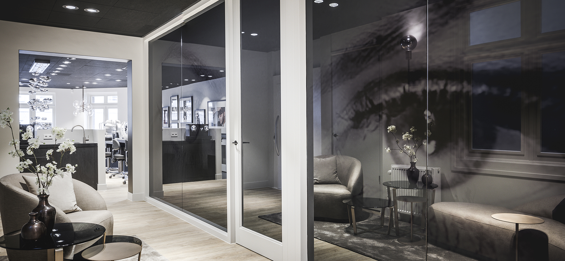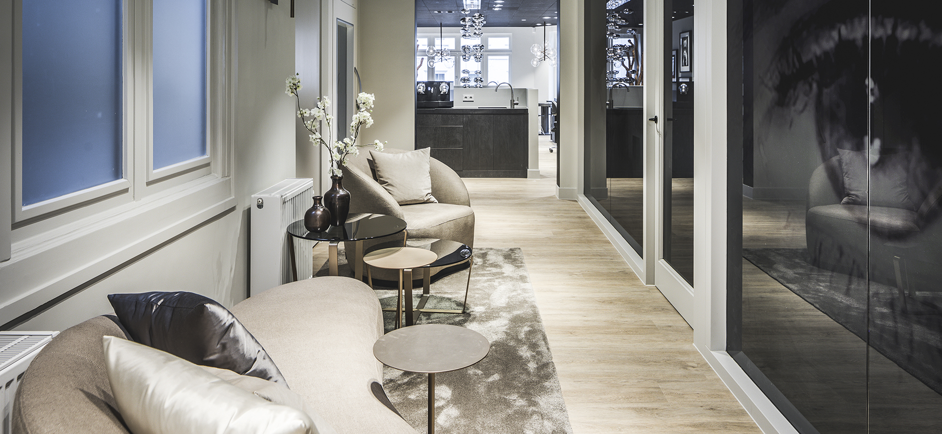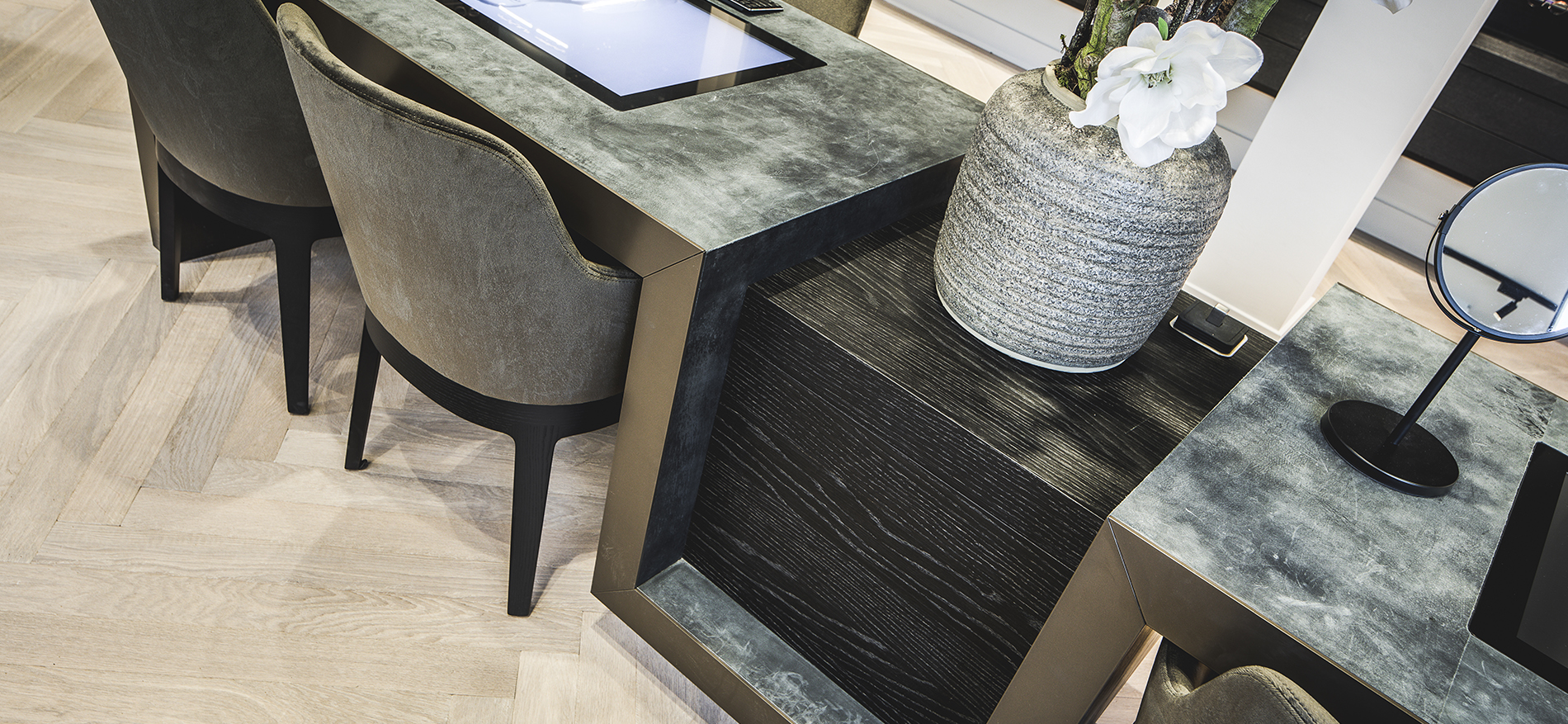 Met toepassingen in het interieur ontwerp van puur eiken gebeitst, natuursteen, leer en ledtoepassingen en glanzende stoffen is een prettige ambiance in de optiek zaak ontstaan.