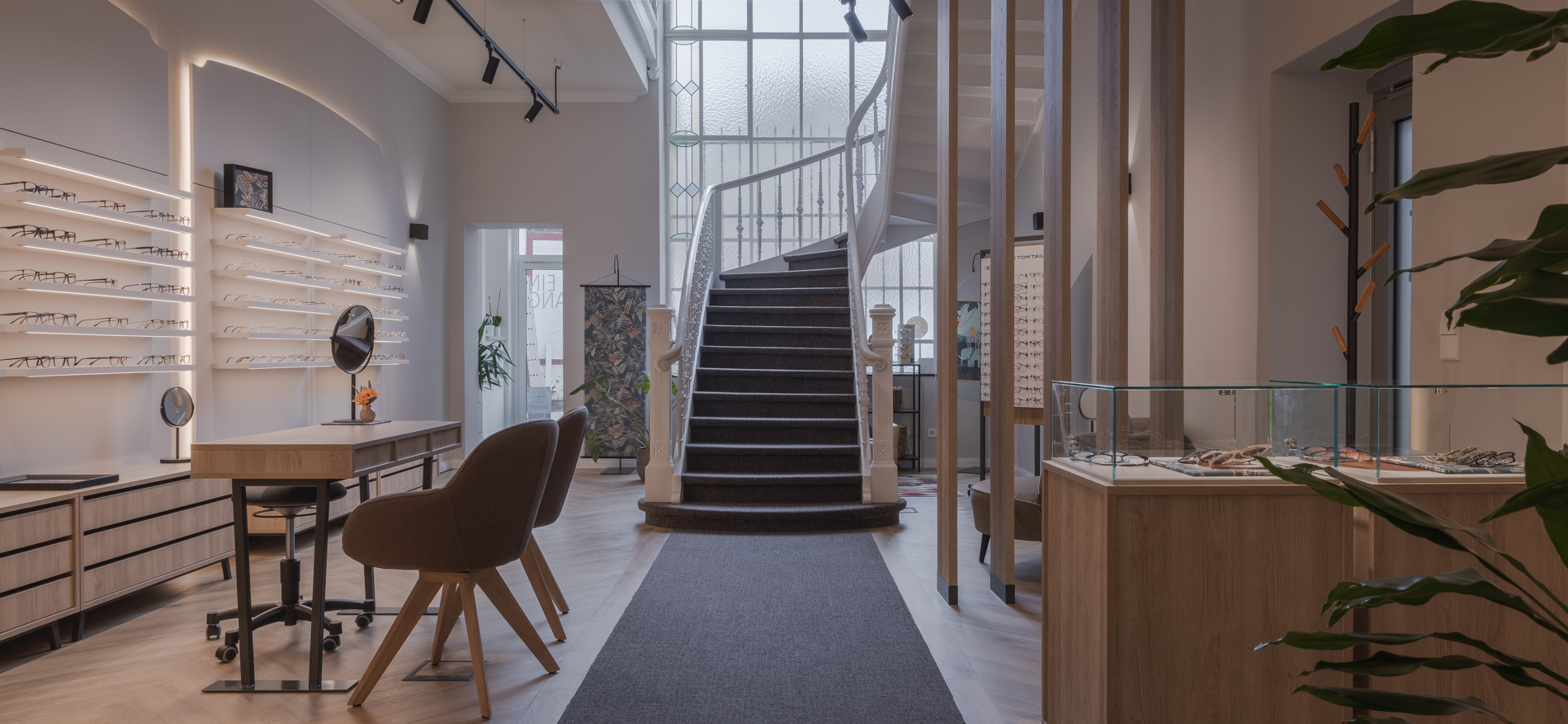 De voorgevel van de winkel staat onder monumentenzorg en is daarom geheel in stijl gebleven met prachtige decoratieve ronde etalageruiten. Ook achter in de winkel is de prachtige trap naar de refractieruimte en het grote glas in loodraam behouden gebleven. Het is een succesvolle verbouwing geworden naar volle tevredenheid van de familie Hermann!