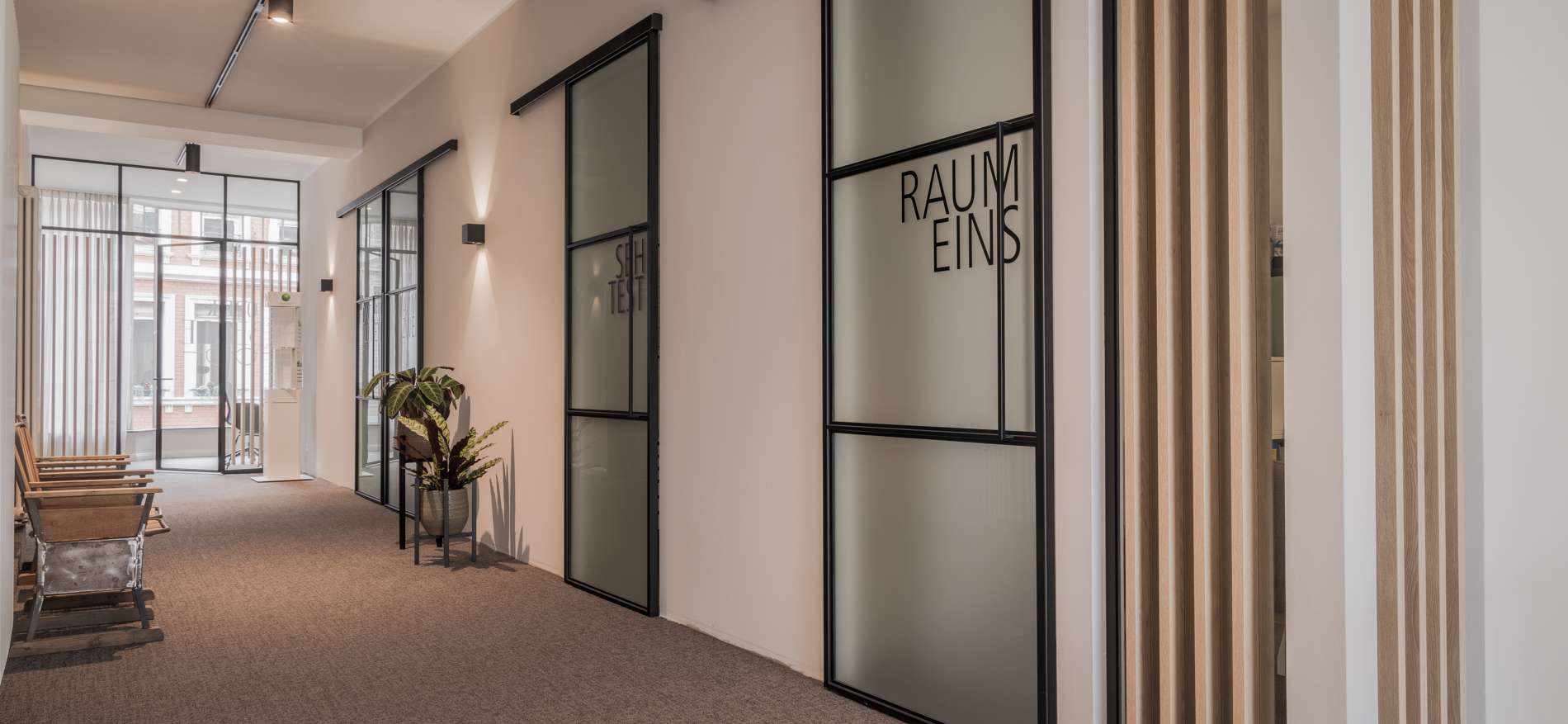 Het gehele interieur straalt een heerlijke rust uit met gebruik van zachte kleuren en een warm eiken interieur. Er is veel ruimte om alle adviestafels heen wat een verkoopgesprek heel prettig maakt. Op de eerste etage zijn alle refractieruimtes ondergebracht die afgesloten kunnen worden met stijlvolle zwartstalen schuifdeuren.