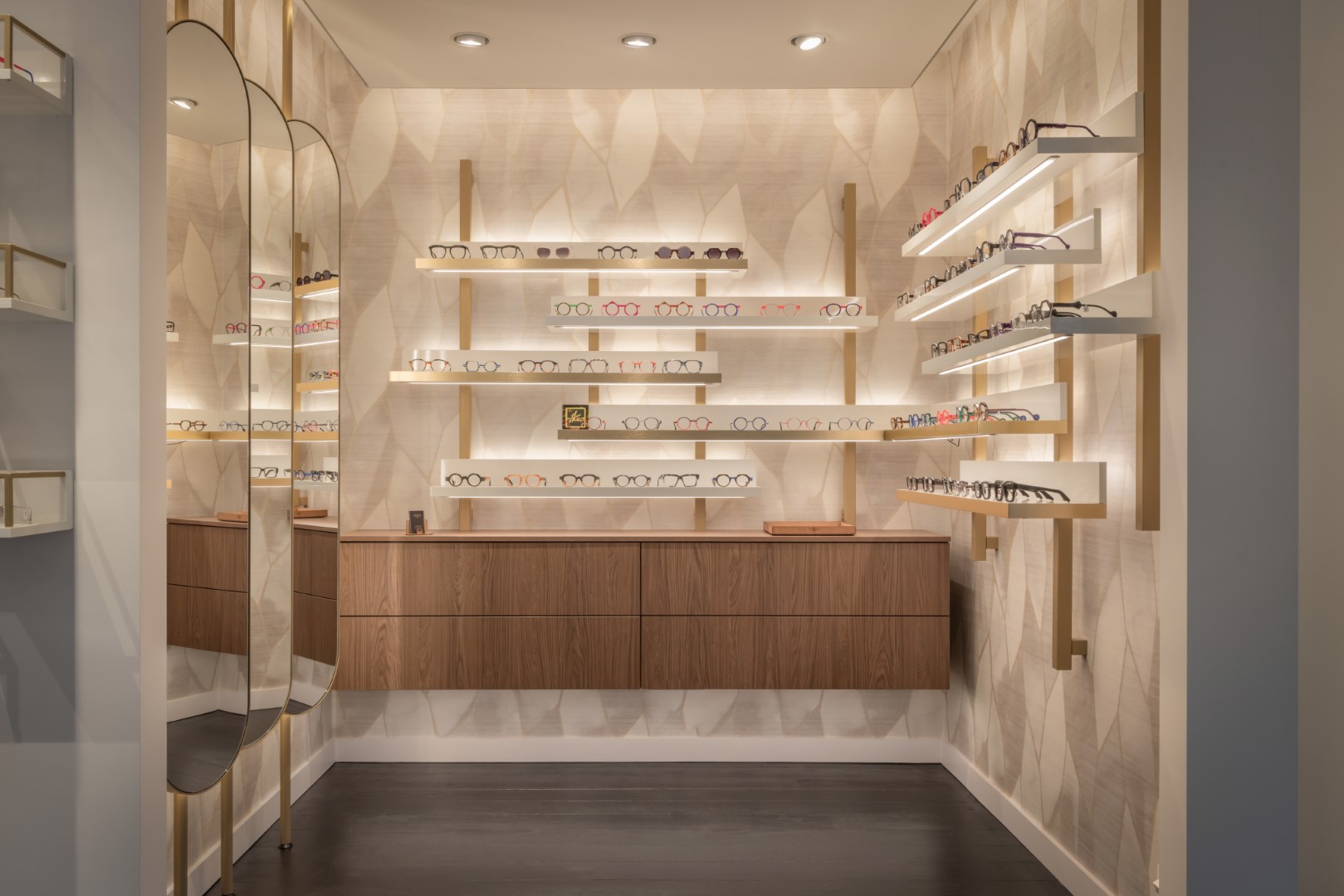 De zonnebrillen en brillen zijn op een prachtige manier tentoongesteld in luxe vitrines die een hoogwaardig winkelinterieur versterken. Het resultaat is een optiekzaak die klanten een verfijnde en inspirerende winkelervaring biedt. De keuze voor een stijlvol winkelinterieur bij deze optiekzaak was een bewuste, die de kwaliteit en het unieke karakter van Edgar Optique versterkt.