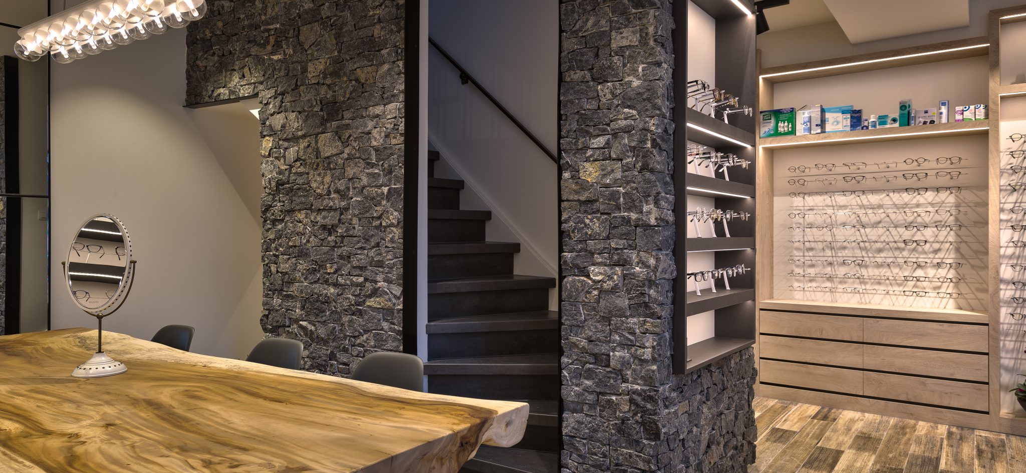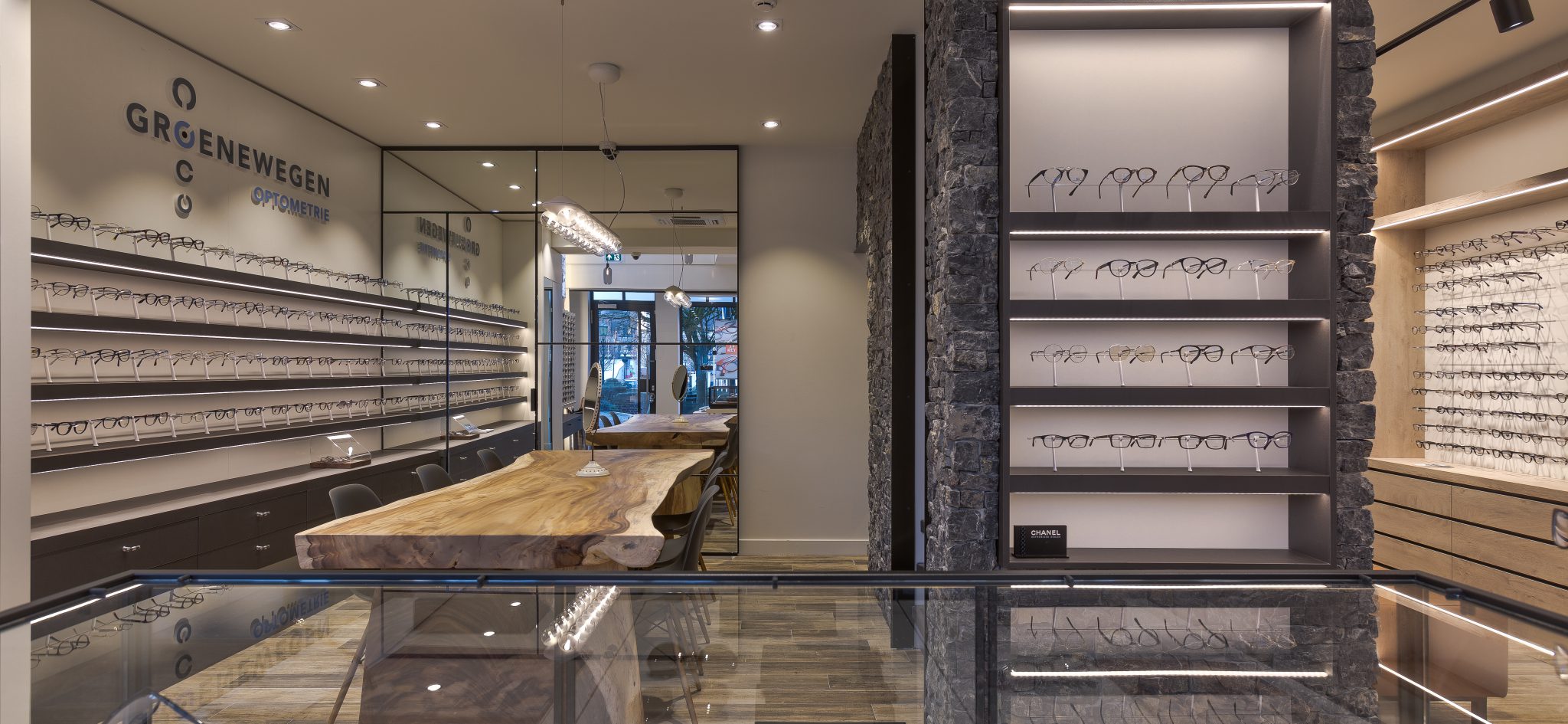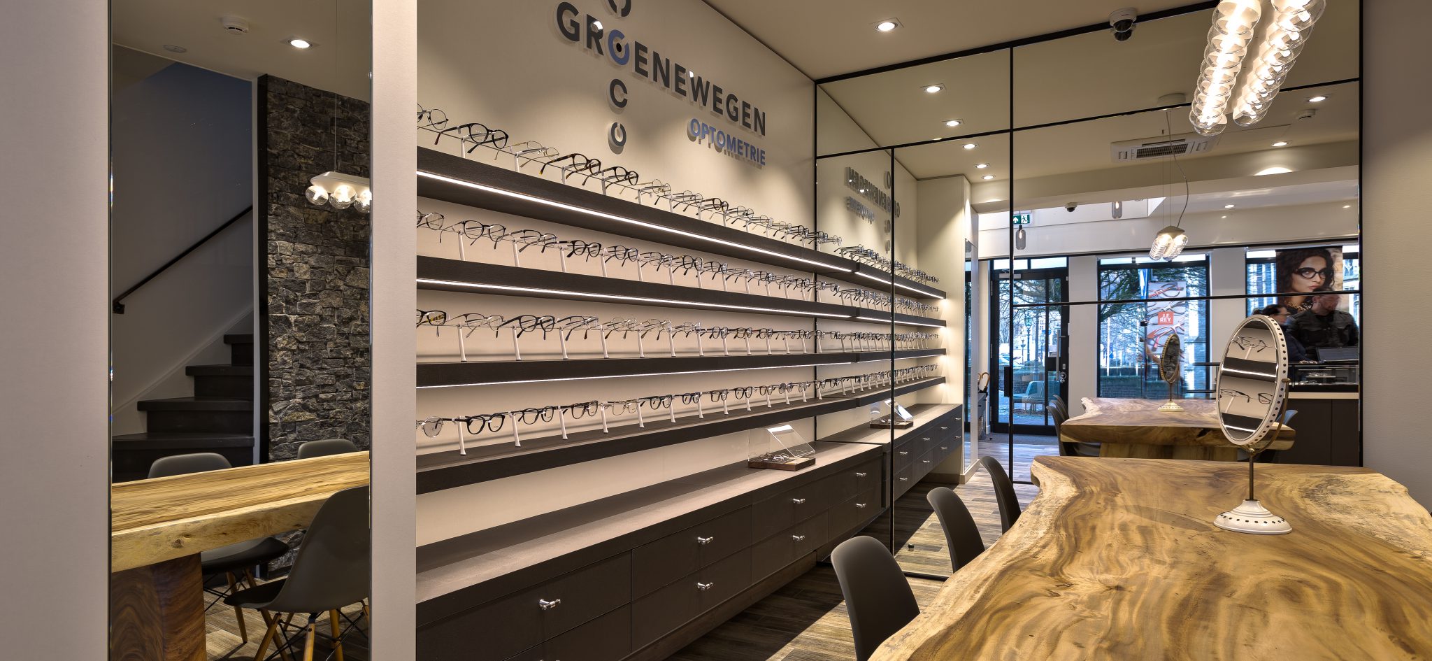 Onze opdrachtgevers Johan en Wendy Groenewegen zijn professionals op het gebied van opthometrie, brillen en lenzen. Hulst is een prachtige stad, met een rijk verleden en aan alles is duidelijk te zien dat we hier dicht bij de grenzen van 2 landen zijn. De klandizie van Groenewegen Opthometrie is breed en regionaal gespreid. De professionaliteit van Groenewegen Opthometrie wordt onderbouwd door een mooie collectie correctiemonturen en de samenwerking met firma’s als Zeiss. Ongeveer een anderhalf jaar geleden spraken we elkaar voor het eerst over de uitgangspunten voor een goede winkelbeleving. Duidelijk kwam daarbij naar voren dat het pand met meerdere verdiepingen (en destijds weinig ruimte beneden) beter geïntegreerd kon worden en onderling verbonden. In ons ontwerp zouden we dus gaan werken aan ruimtelijkheid en een goede routing / efficiënte werkprocessen.