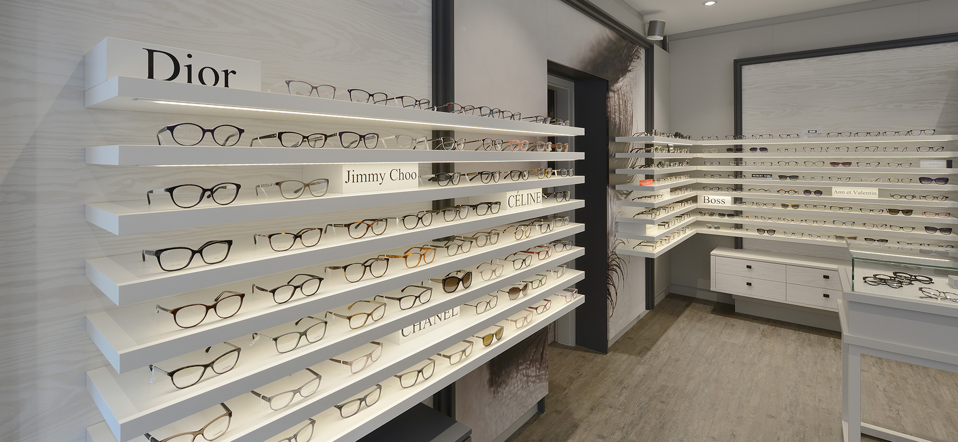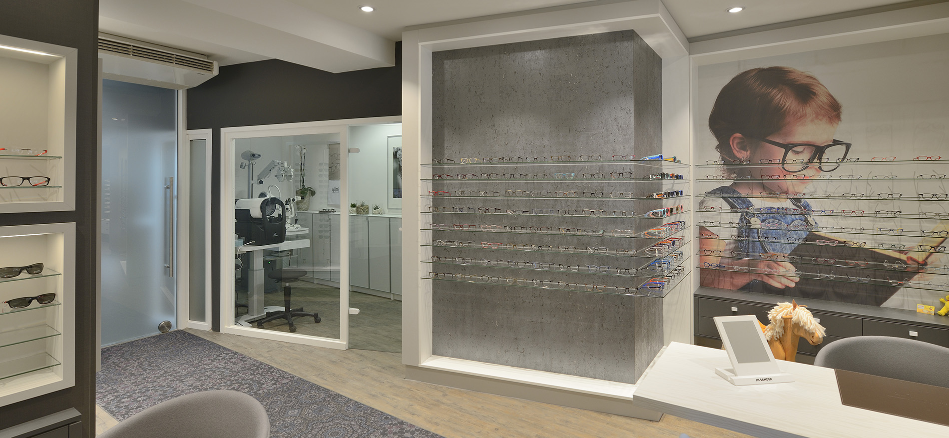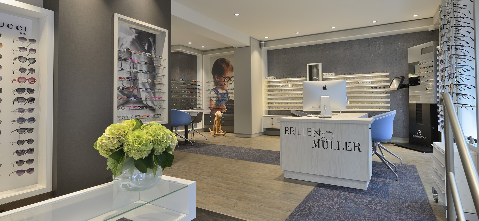Tijdens de verbouwing toen onze monteurs een paar dagen bezig waren schreef Mevrouw Müller al ‘es wird soooo schön. Sie haben bisher alle meine Erwartungen erfüllt’. Met name ook de grote visualwanden met lange brillenpresentatieschappen komen prachtig tot z’n recht. De verouderde halogeenverlichting vervangen door de juiste kleurtemperatuur van de professionele led-verlichting zowel in het plafond en onder de brilschappresentatie komen perfect tot z’n recht in deze druk bezochte optiekwinkel. Ook de samenwerking met de plaatselijke installateur voor alle computeraansluitingen is prettig verlopen. Also wieder ein einmaliges Optikladenkonzept mit einem wirkungsvollen Resultat.