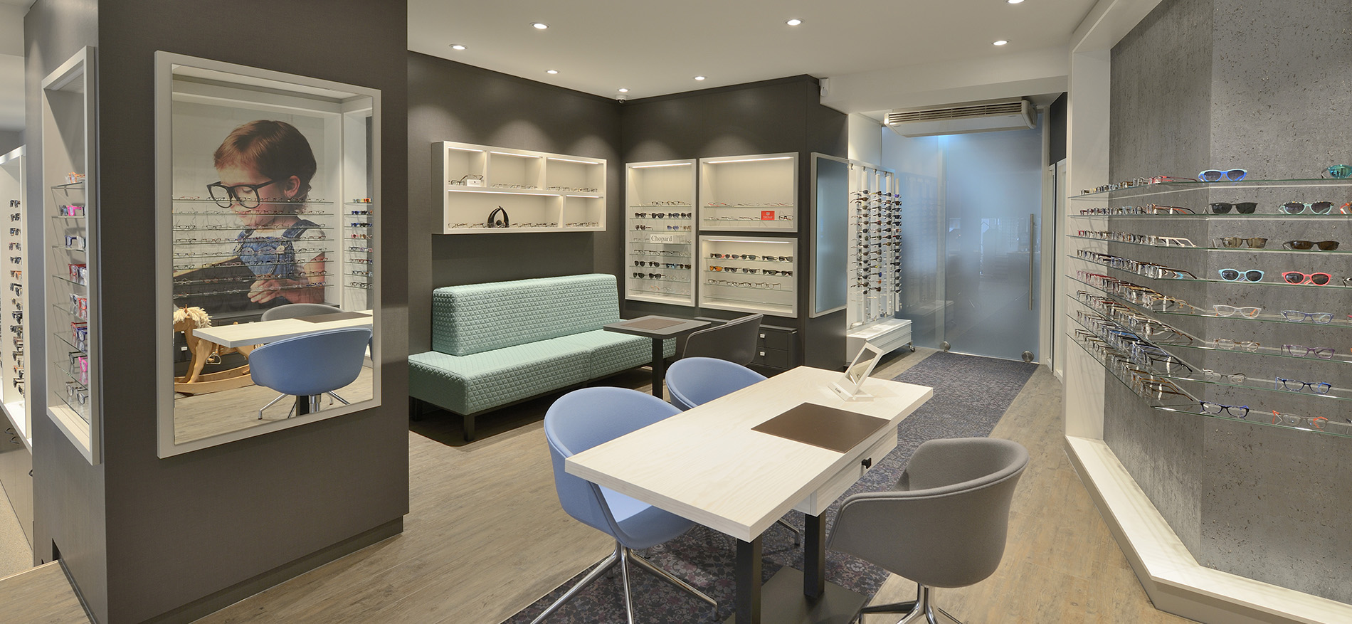 Een prachtige nieuwe vloeroplossing doorlopend in de trapverhoging van houtlook pvc gecombineerd met een fleurige opvallende printtapijtloper die de klant door de gehele optiekwinkel leidt. Afgewisseld met kleurrijke stoffenvariatie voor het zitmeubilair.