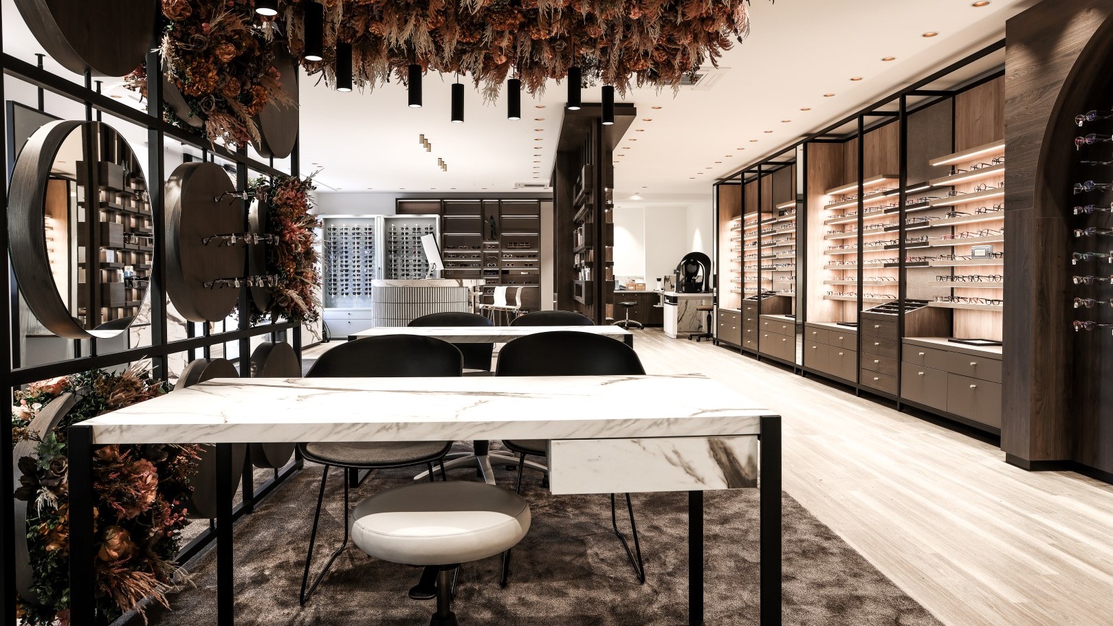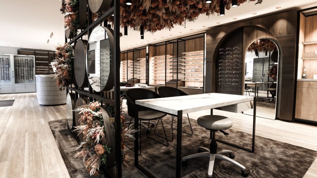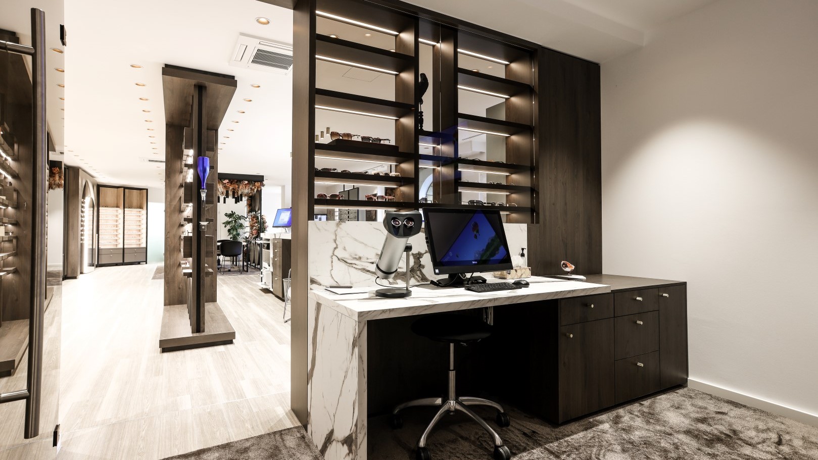 De hele optiekwinkel moest op de proef worden gesteld: een goede positionering van de refractieruimte, voldoende presentaties, ruimte voor verkoopplekken en een fijne wachtruimte. Na de totstandkoming van een geheel nieuw concept, heeft WSB vervolgens de totale inrichting in samenwerking met lokale ambachten in een optimaal tijdsbestek laten uitvoeren èn realiseren. Donker hout, warme kleuren en een marmerlook, plus een op de presentatie afgestemd lichtconcept. Het gebloemde plafondpaneel boven de consultatietafels is een echte eyecatcher!