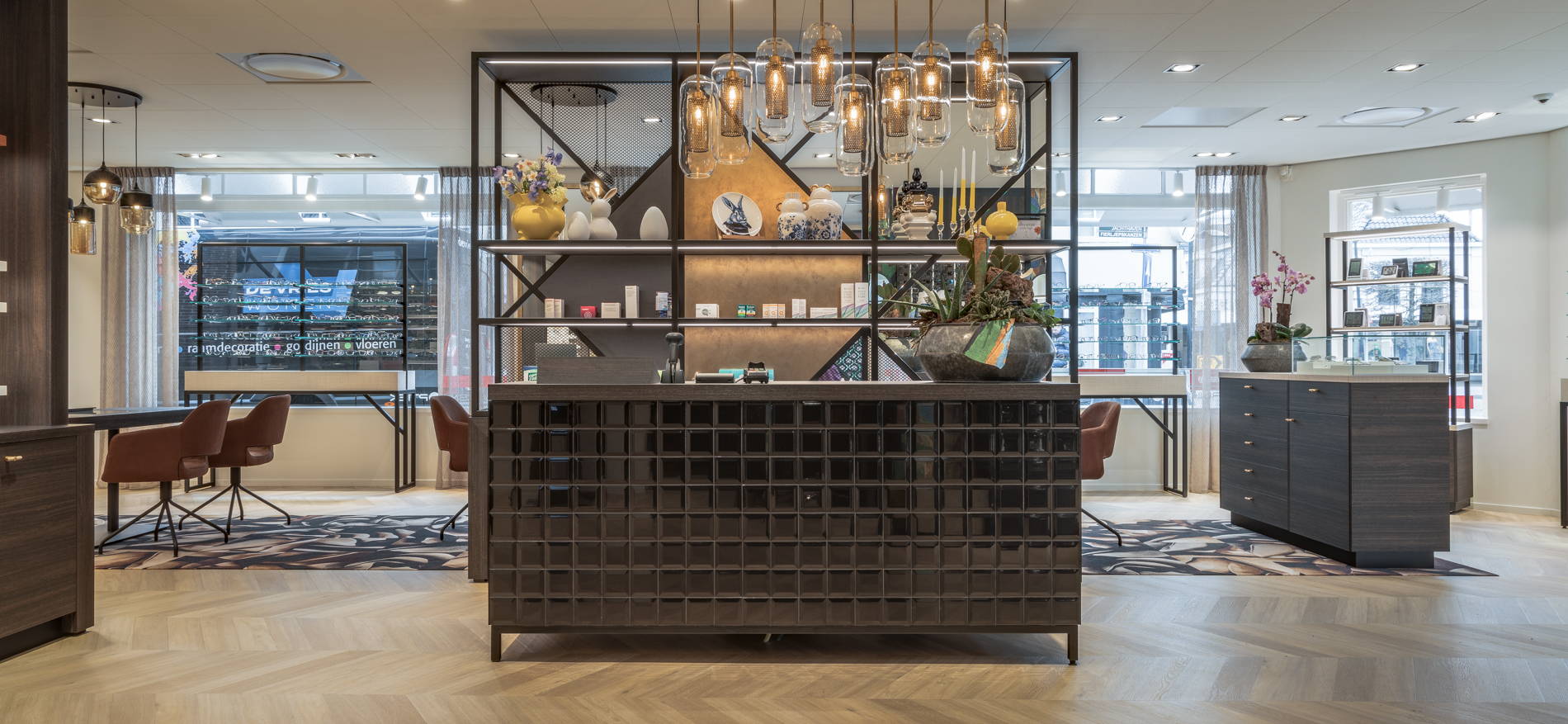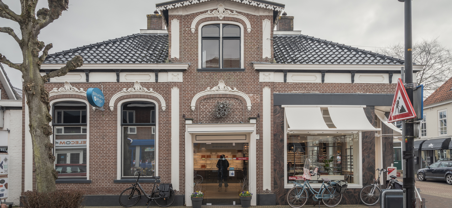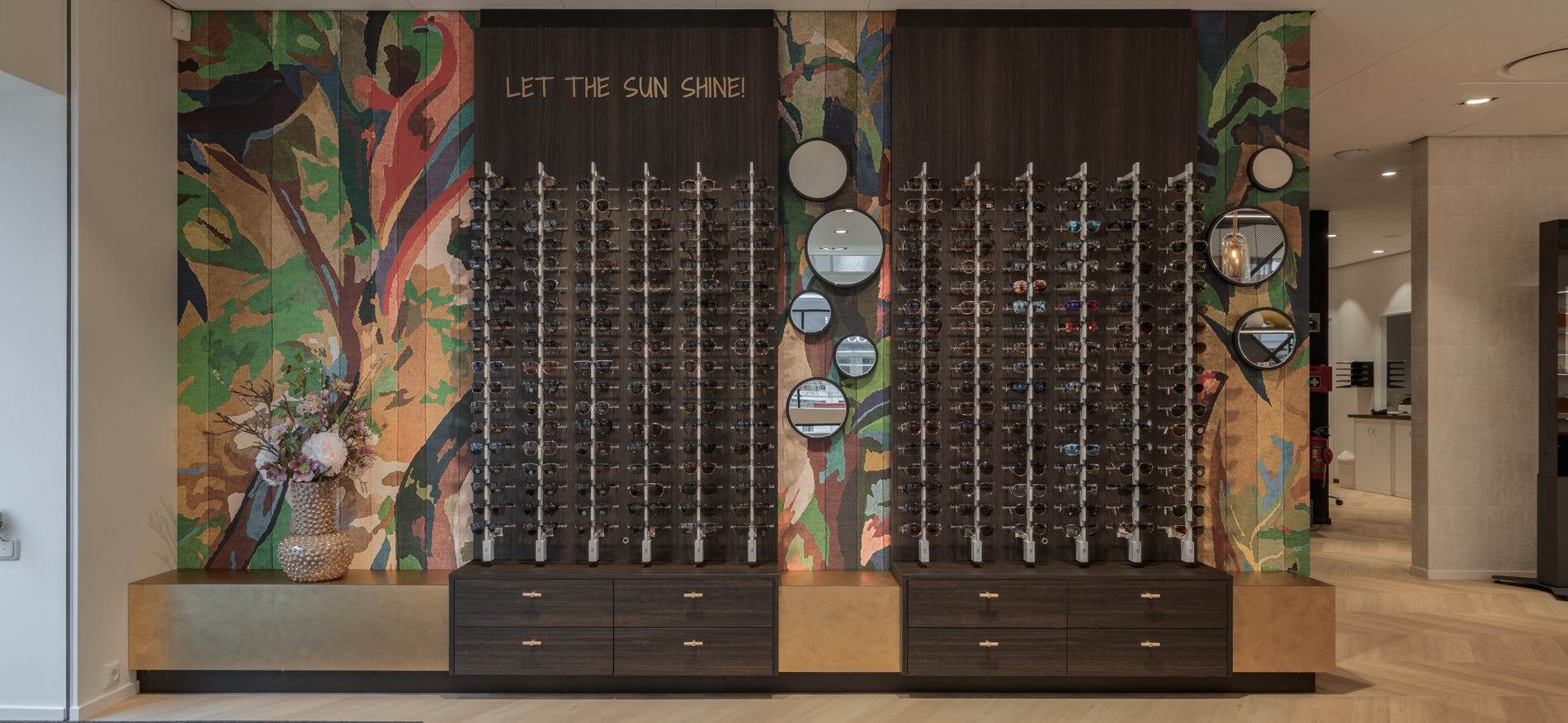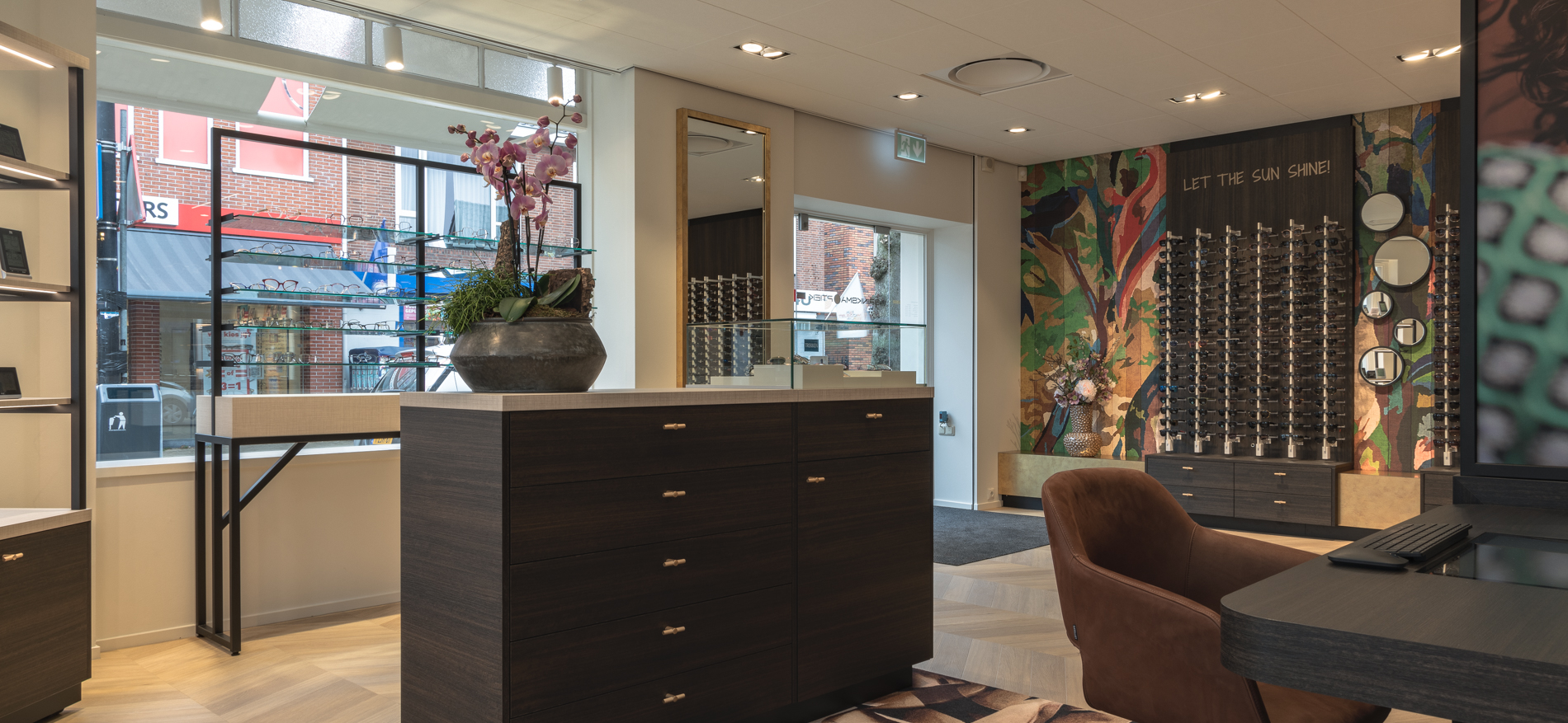 Het kleurgebruik is opvallend en frivool met veel in het oog springende kleuren. De basis bleef echter warm met een ‘dorpse’ gezelligheid. Voor de brilpresentaties is gebruik gemaakt van verlichte schappen waardoor de brillen er echt uitblinken. Al met al een super mooi resultaat. We zijn er trots op dat we voor deze betrokken Friese ondernemers de tweede winkel mochten realiseren!