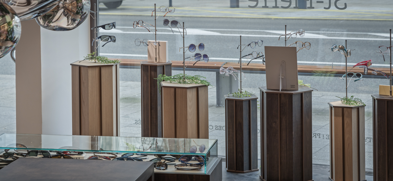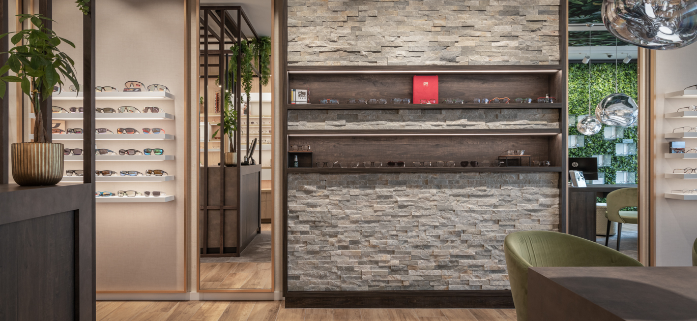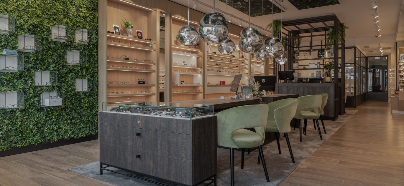 Interieur optiekwinkel met groenwand en brilpresentaties