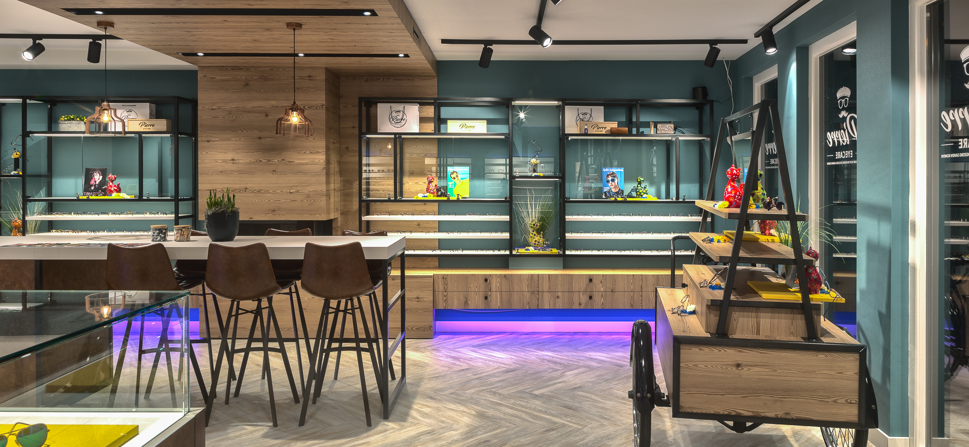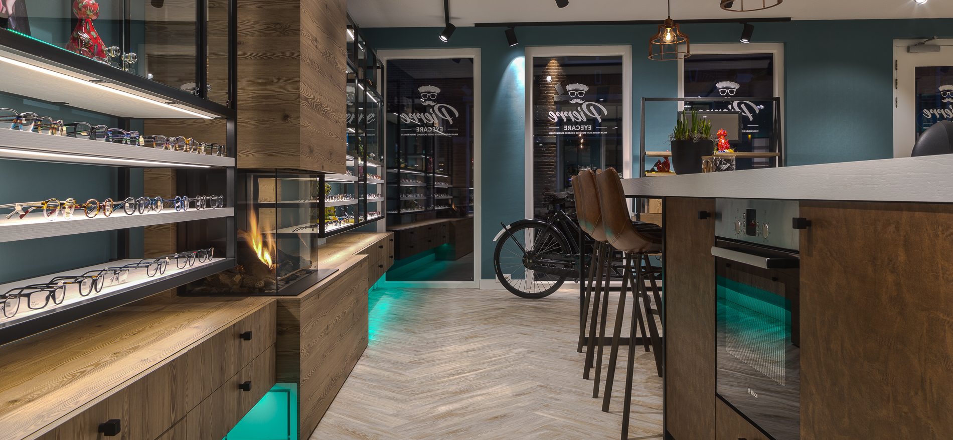 De retail designers kregen van Pieter Verweij van Kieft Optiek de opdracht om een volledig nieuw en inspirerend redesign van de winkel te bedenken. In nauw overleg tussen Pieter en Rick Blankenstijn kwam een inspirerend moodboard tot stand, waar veel ingrediënten (letterlijk vult de geur van taart nu de winkel ;-) ook definitief zijn doorgevoerd. Maar sommige ingredienten ook weer niet. Het was een feest om dit concept voor Pierre Eyecare te mogen ontwerpen. Daarbij ligt de nadruk op sfeer en de modische brilbeleving. Vlot en niet saai, betrouwbaar en heel goed.
