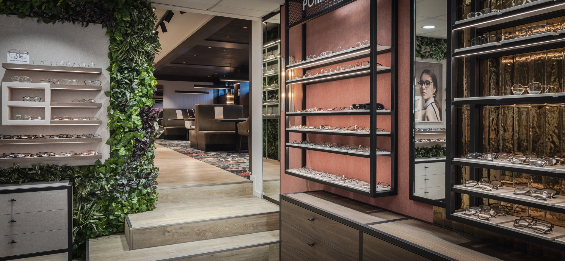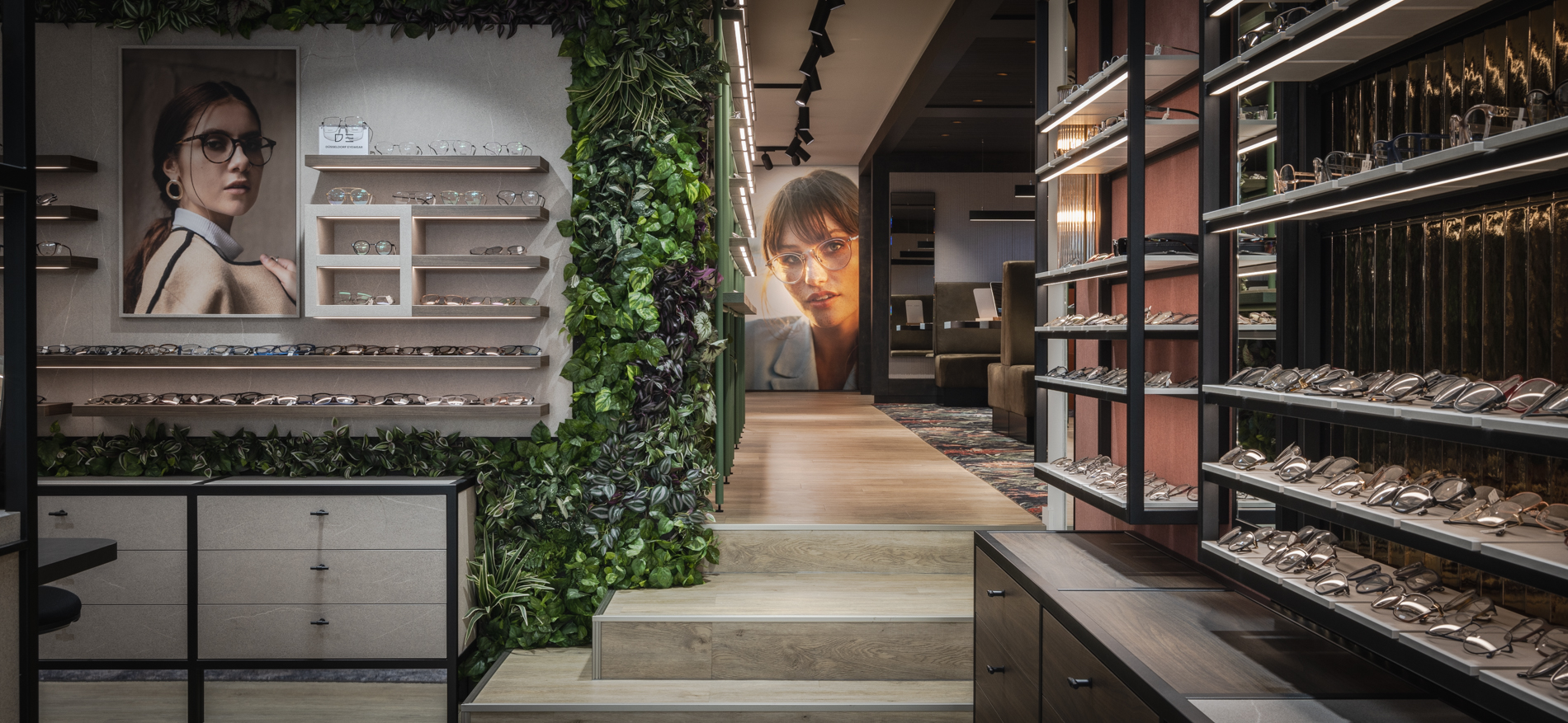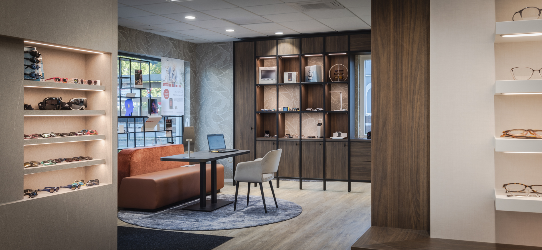 Het systeemplafond in het voorste deel van de winkel is samen met de verlichting bestaand gebleven. Voor het overige deel is de winkelformule volledig vernieuwd. Door de positie van de balie weg te halen uit het smalle verbindingsstuk tussen de hoor- en brillenwinkel ontstaat een veel betere verbinding tussen beide disciplines. De positie van de balie is naar het centrum van de brillenwinkel geplaatst. Door deze positie komt de rechterwand vrij om oneindig lang naar achteren te kunnen lopen langs een fantastische brillencollectie.