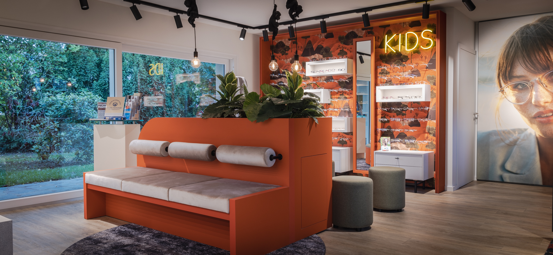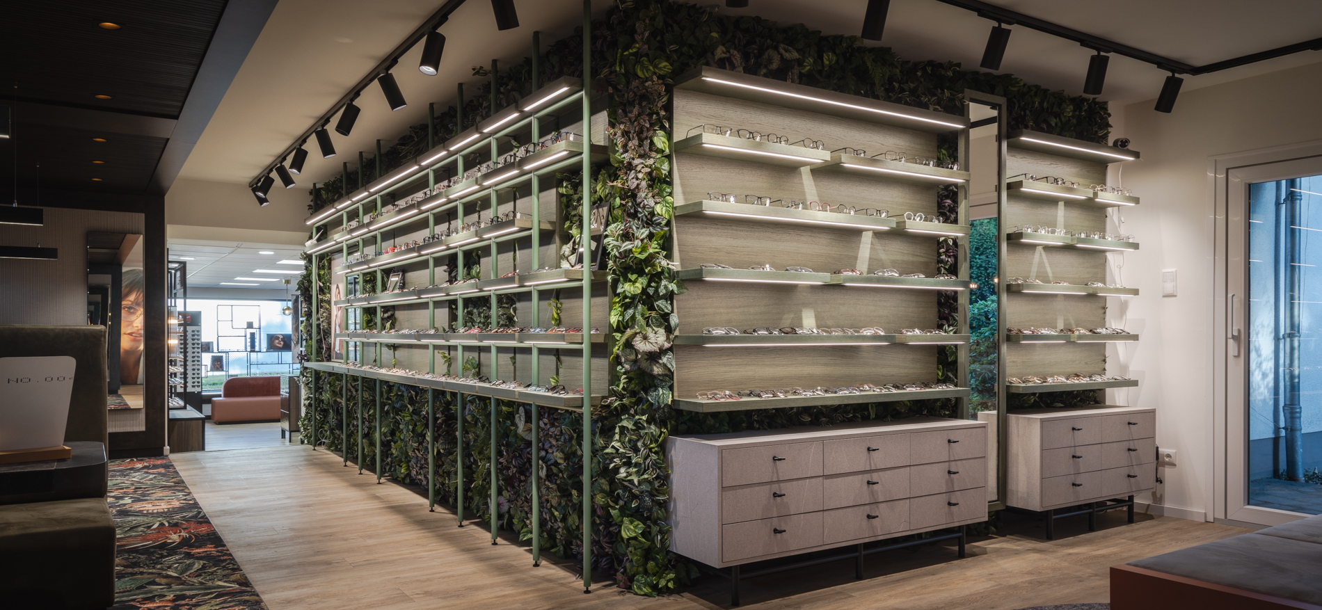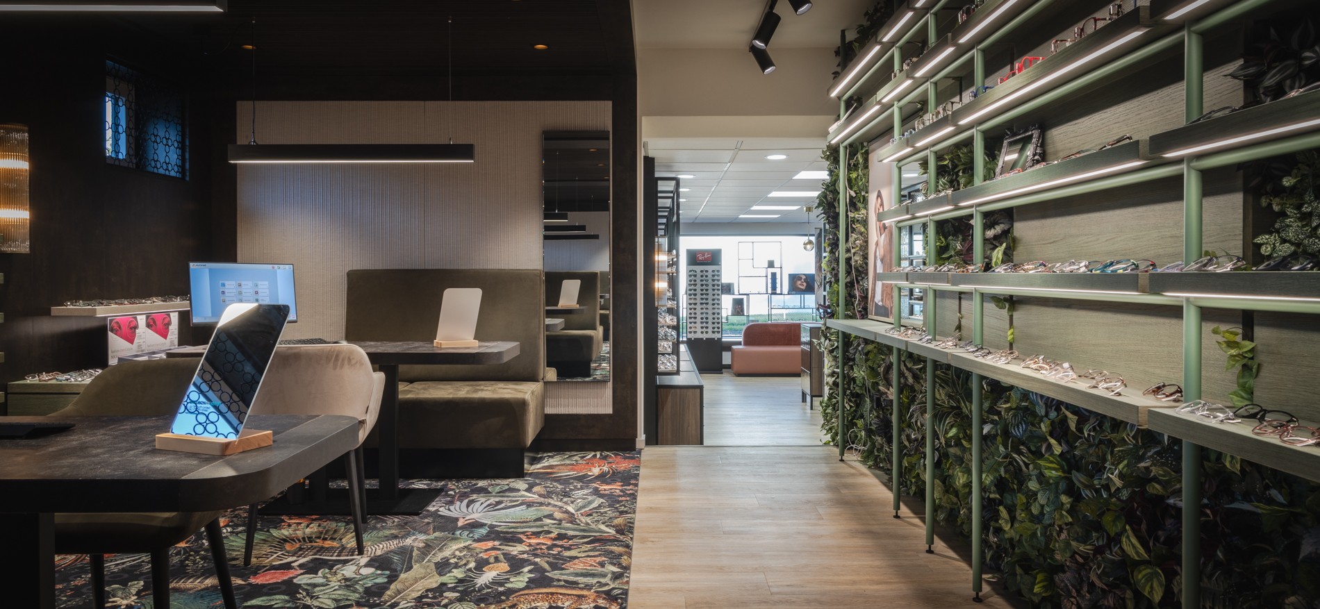 Het systeemplafond in het voorste deel van de winkel is samen met de verlichting bestaand gebleven. Voor het overige deel is de winkelformule volledig vernieuwd. Door de positie van de balie weg te halen uit het smalle verbindingsstuk tussen de hoor- en brillenwinkel ontstaat een veel betere verbinding tussen beide disciplines. De positie van de balie is naar het centrum van de brillenwinkel geplaatst. Door deze positie komt de rechterwand vrij om oneindig lang naar achteren te kunnen lopen langs een fantastische brillencollectie.