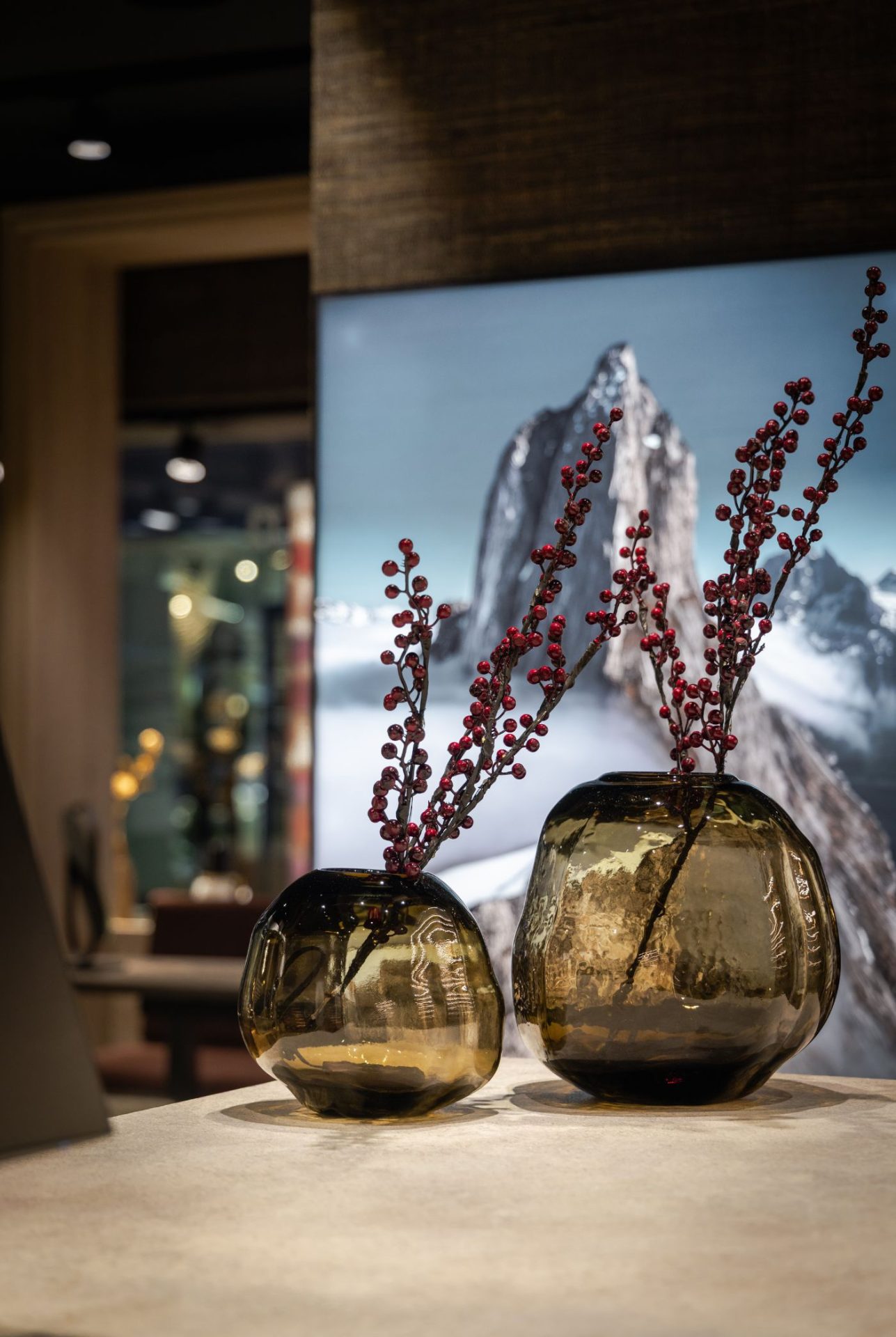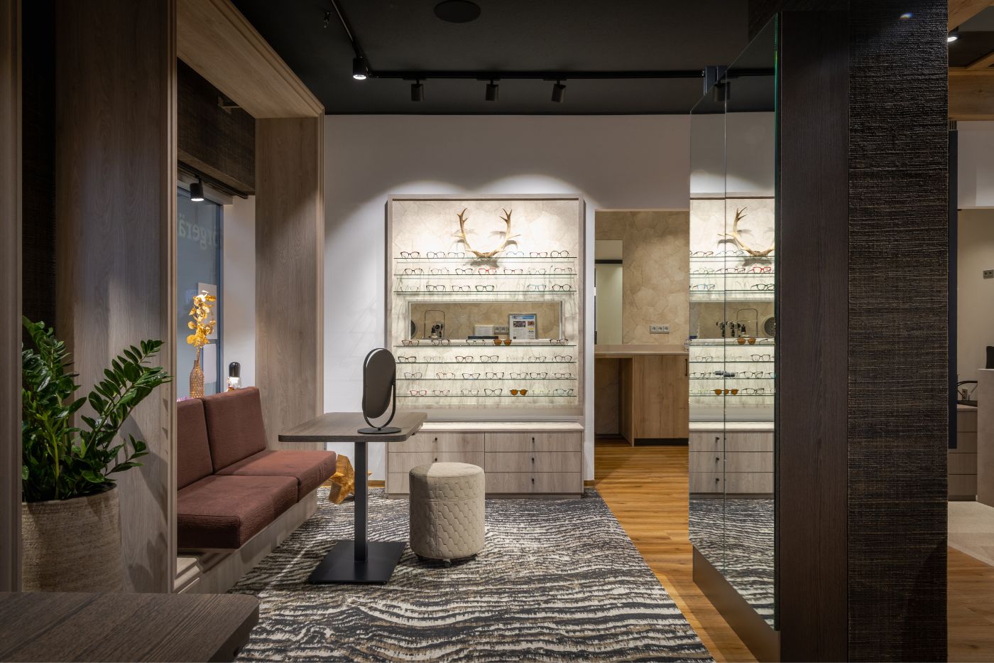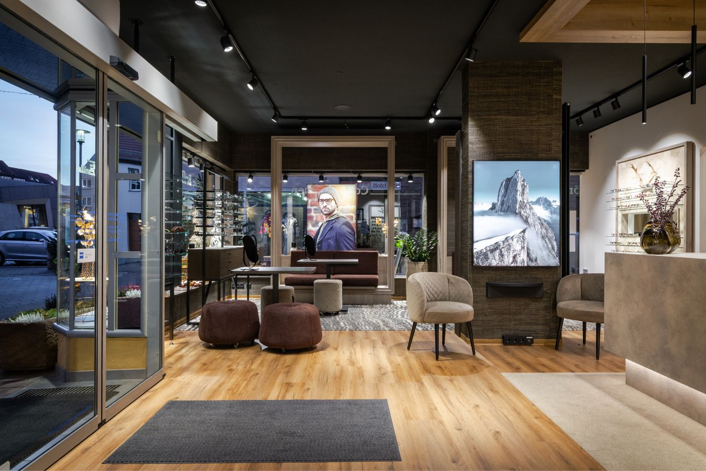 Bij Wiels Brillen in Alzey lag bij het verbouwen van de optiekwinkel de focus op een heldere mix van natuurlijke materialen en alpine chic. Donkere plafonds en gestructureerde wanden laten de verlichte brillendisplays goed uitkomen. De centrale, monolithische toonbank vormt het hart van de winkel en zorgt voor een overzichtelijke indeling, waardoor klanten gemakkelijk kunnen rondkijken.