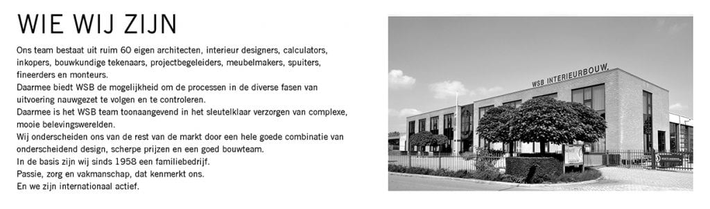 Ons team bestaat uit ruim 60 eigen architecten, interieur designers, calculators, inkopers, bouwkundige tekenaars, projectbegeleiders, meubelmakers, spuiters, fineerders en monteurs. Daarmee biedt WSB de mogelijkheid om de processen in de diverse fasen van uitvoering nauwgezet te volgen en te controleren. Daarmee is het WSB team toonaangevend in het sleutelklaar verzorgen van complexe, mooie belevingswerelden. Wij onderscheiden ons van de rest van de markt door een hele goede combinatie van onderscheidend design, scherpe prijzen en een goed bouwteam. In de basis zijn wij sinds 1958 een familiebedrijf. Passie, zorg en vakmanschap, dat kenmerkt ons. En we zijn internationaal actief.