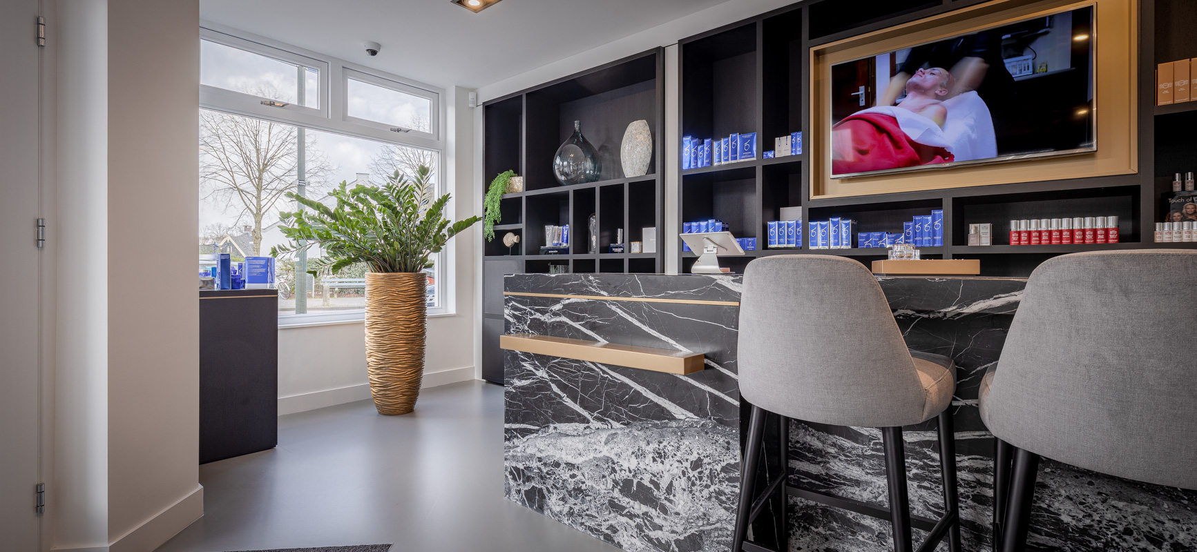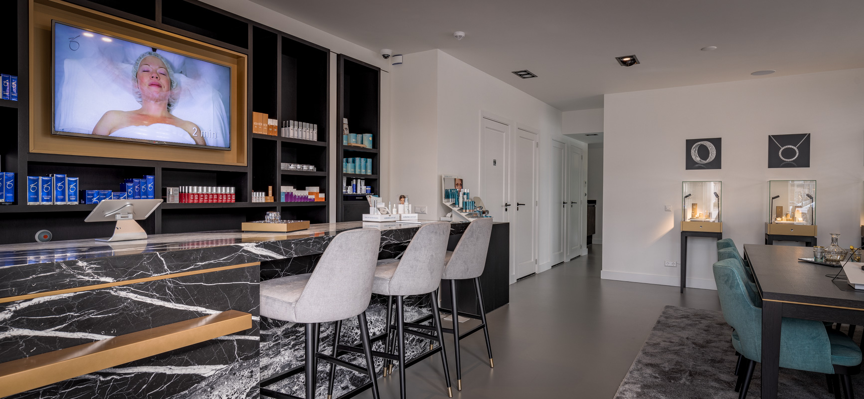 Op een prachtig punt in het centrum van Laren is Xcellent skin gevestigd. Huidcoach en specialist in huidverbetering Silvia Atanasova heeft hier haar kliniek. Een uniek totaalconcept met effectieve, huid verbeterende behandelmethodes trekken cliënteel uit de hele regio. Voor de inrichting van haar salon kwam Silvia bij WSB uit. Warmte, gastvrijheid en professionaliteit is wat het interieur uit moet stralen. De luxe en rijke materialen in combinatie met de strakke basis van het pand hebben het gewenste resultaat; een prachtige zaak waarin iedereen zich direct vertrouwd voelt. Naast beauty verkoopt Silvia ook een lijn exclusieve sieraden afgewerkt met de mooiste diamanten. Verfijnde vitrines met high end verlichting geven de collectie een fantastisch podium.
