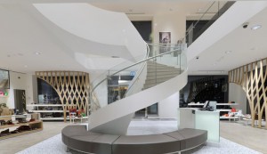 Nico Schreuder van WSB: “Voor de winkelinrichting van schoenenzaak Shuz in Veenendaal ontwikkelde WSB Design een luchtig en transparant ontwerp met luxe materialen en een fantastische architectuur. In het ontwerp zijn geen pilaren gebruikt, waardoor de uitnodigende wenteltrap de enige verbinding is tussen de twee verdiepingen van de winkel. Bij retail design moet je rekening houden met hoogtes, commercie en routing. Het is in dit geval de kunst om te zorgen dat klanten ook naar boven lopen. Rob Schmit, mede-eigenaar van Shuz by Schmit: “Door de trap een centrale plaats te geven, nodigt hij uit om naar de herenafdeling op de eerste verdieping te lopen en dat is precies wat wij wilden.” Retaildesign