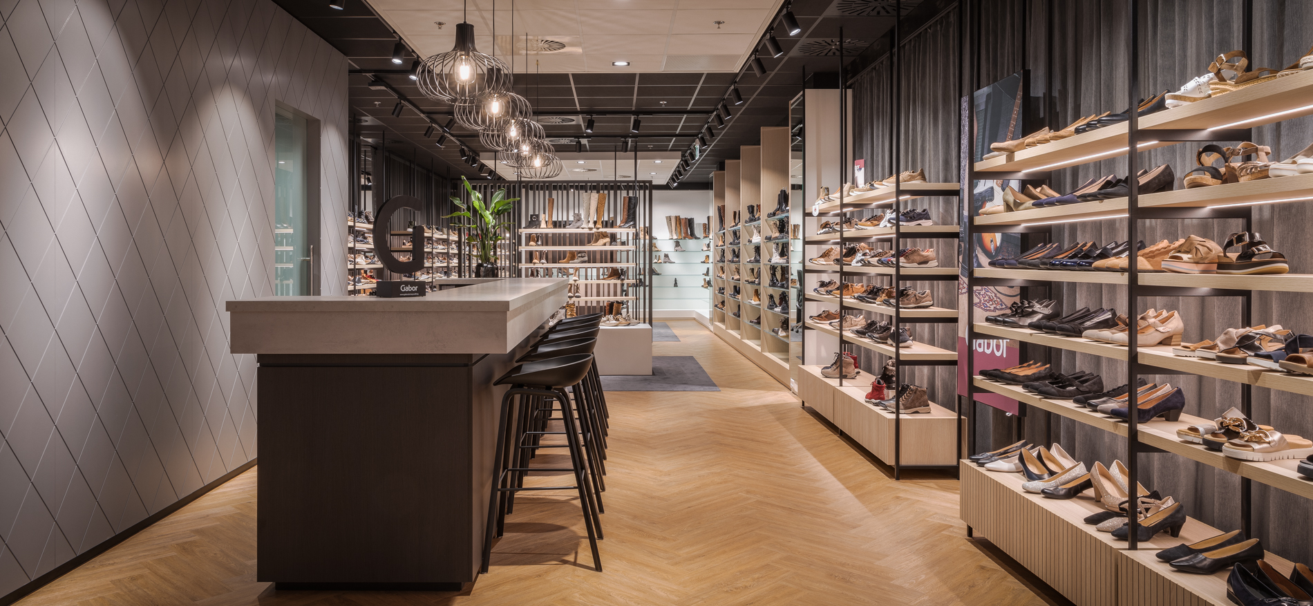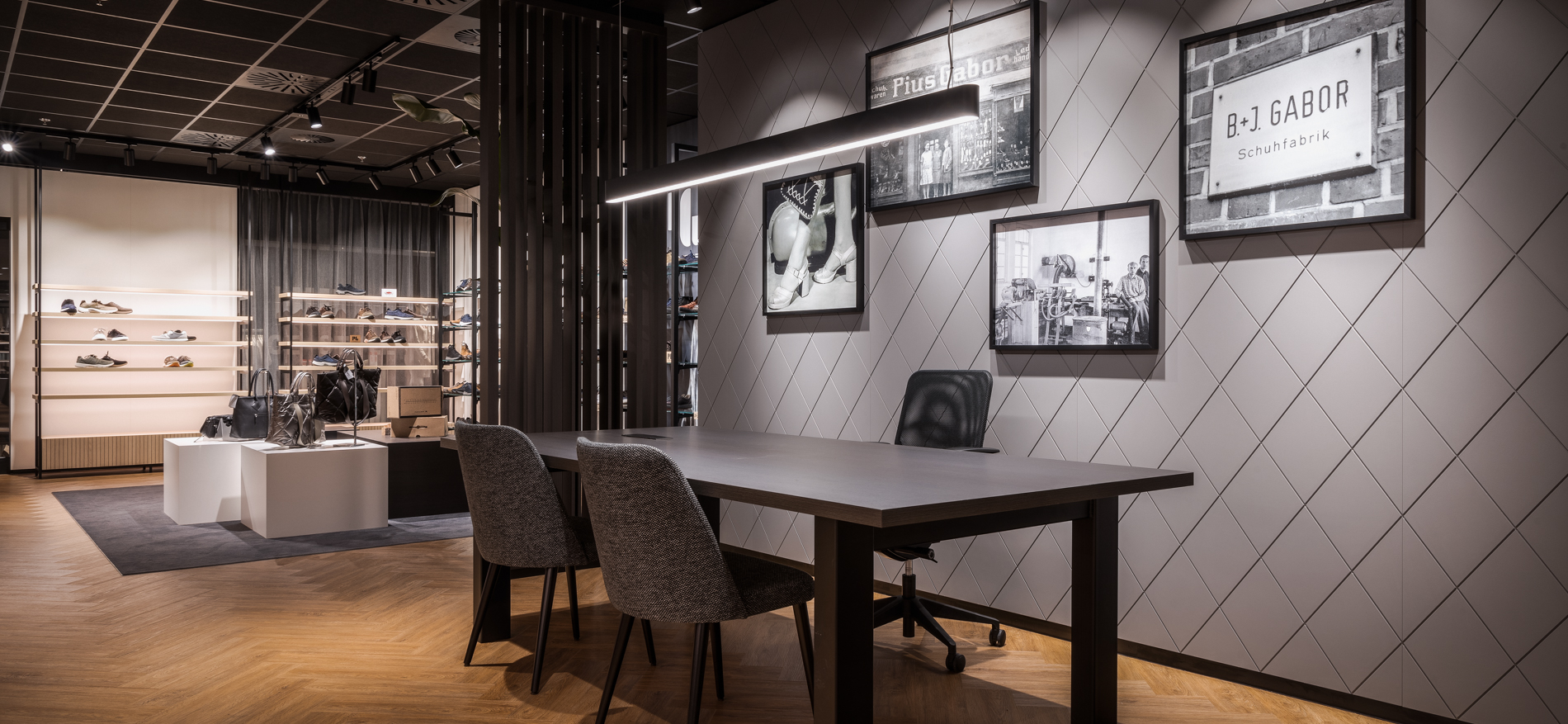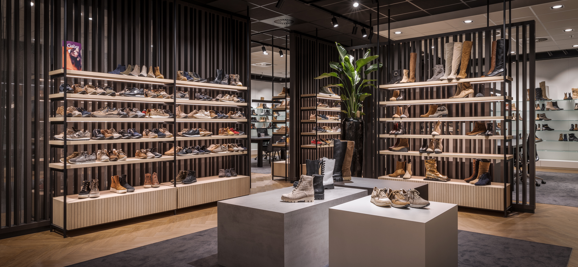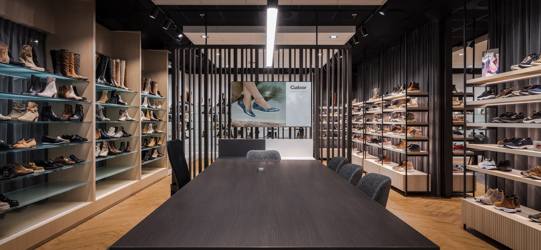 De interieurarchitecten van WSBDesign.com hebben bij het ontwerp van het showroom sterk gekeken naar de corparate identity van het merk Gabor. Gabor is wereldwijd bekend, maar van origine Duits. Kwaliteit, Pasvorm, Mooi materiaal gebruik en Mooie vormgeving zijn in het DNA van GAbor verweven. Daarnaast is bij de uitbreiding van de showroom gekeken naar de semi-transparante ideale manier om voor iedere klant een eigen aankoopruimte te ontwikkelen. De aandacht voor de klant en het assortiment staat centraal. De nieuwe collectie kan bij de selectie direct gefotografeerd worden voor offline en ook online verkoop. In de nieuwe en grotere showroom is ook een volwaardige ruimte gecreëerd voor de herencollectie: Pius Gabor.