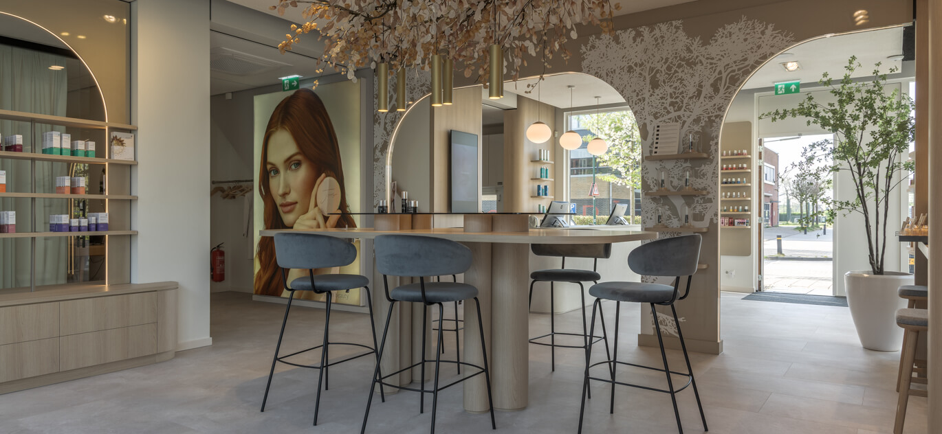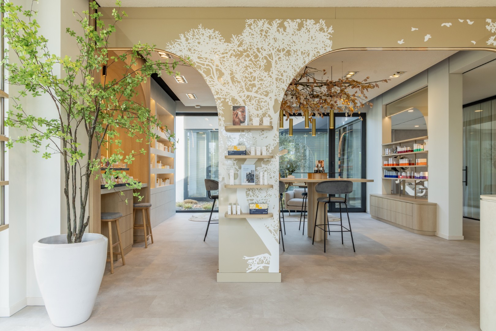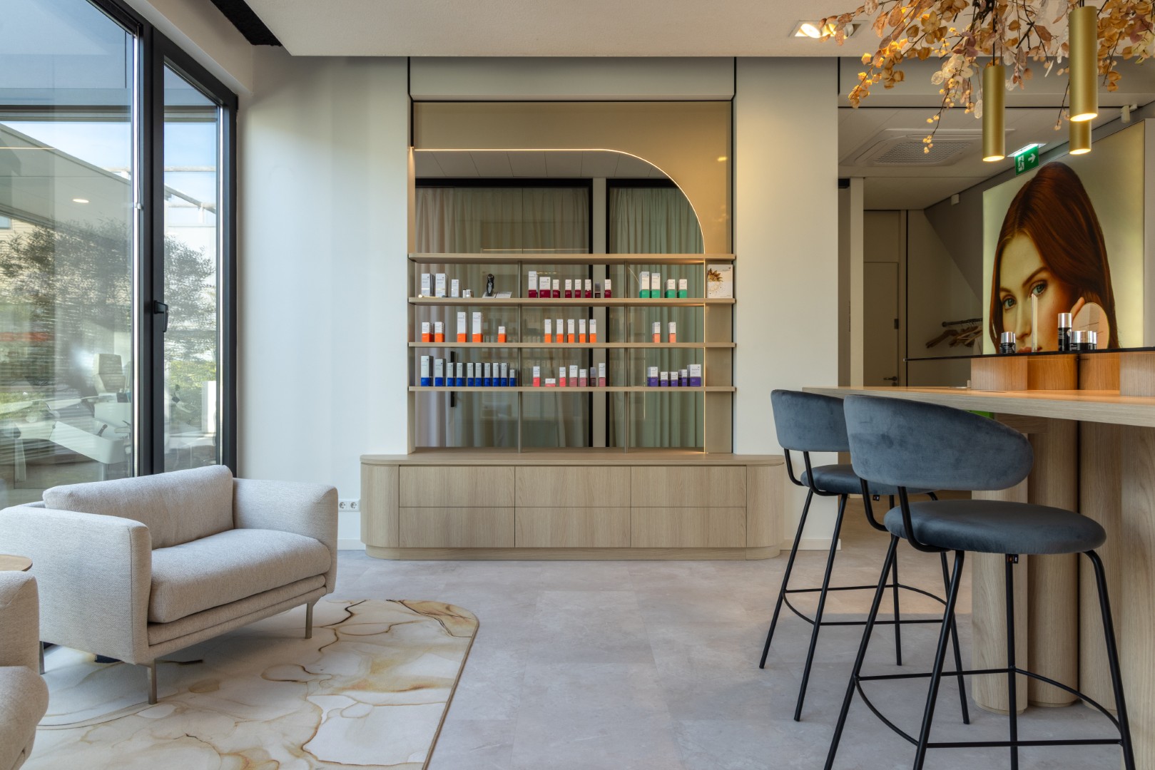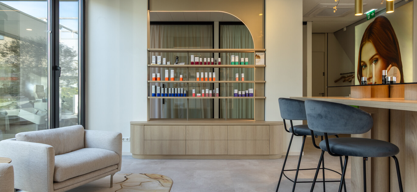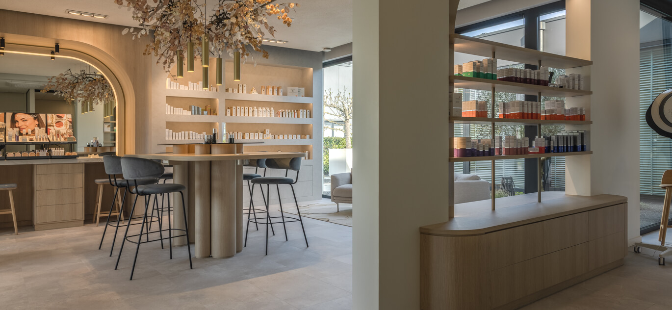 De uitdaging was om meer rust in de productpresentatie te brengen en dit te combineren met een interactief element. Tegelijkertijd moest het interieur een update krijgen naar een stijl van nu, met afgeronde vormen en rijke structuren. Een echte eyecatcher is de doorgang met twee boogpoorten voorzien van LED-verlichting, die de bezoeker leiden naar de experience tafel met ruimte voor acht zitplekken. Daarachter bevindt zich een warme lounge-wachtruimte waarin klanten in alle rust kunnen ontspannen voorafgaand aan hun behandeling. Deze nieuwe indeling verbetert niet alleen de routing, maar versterkt ook de klantbeleving. Het geheel is ontworpen met aandacht voor een duurzaam interieurontwerp dat past bij de visie van Body & Vital.