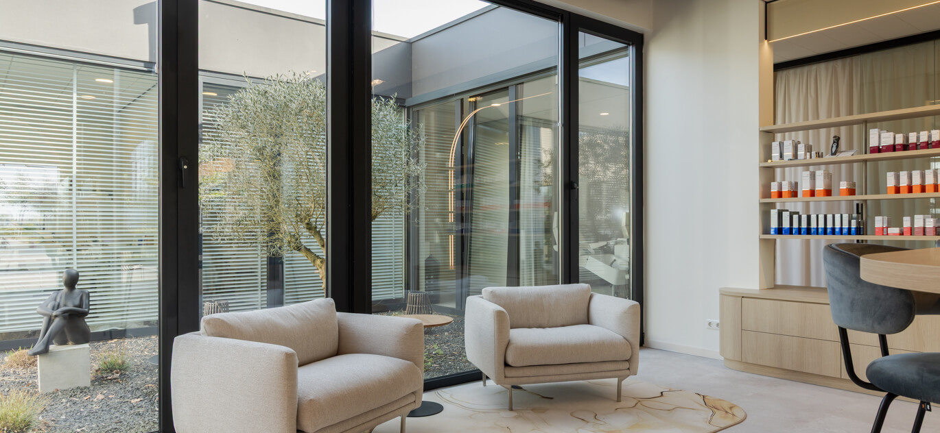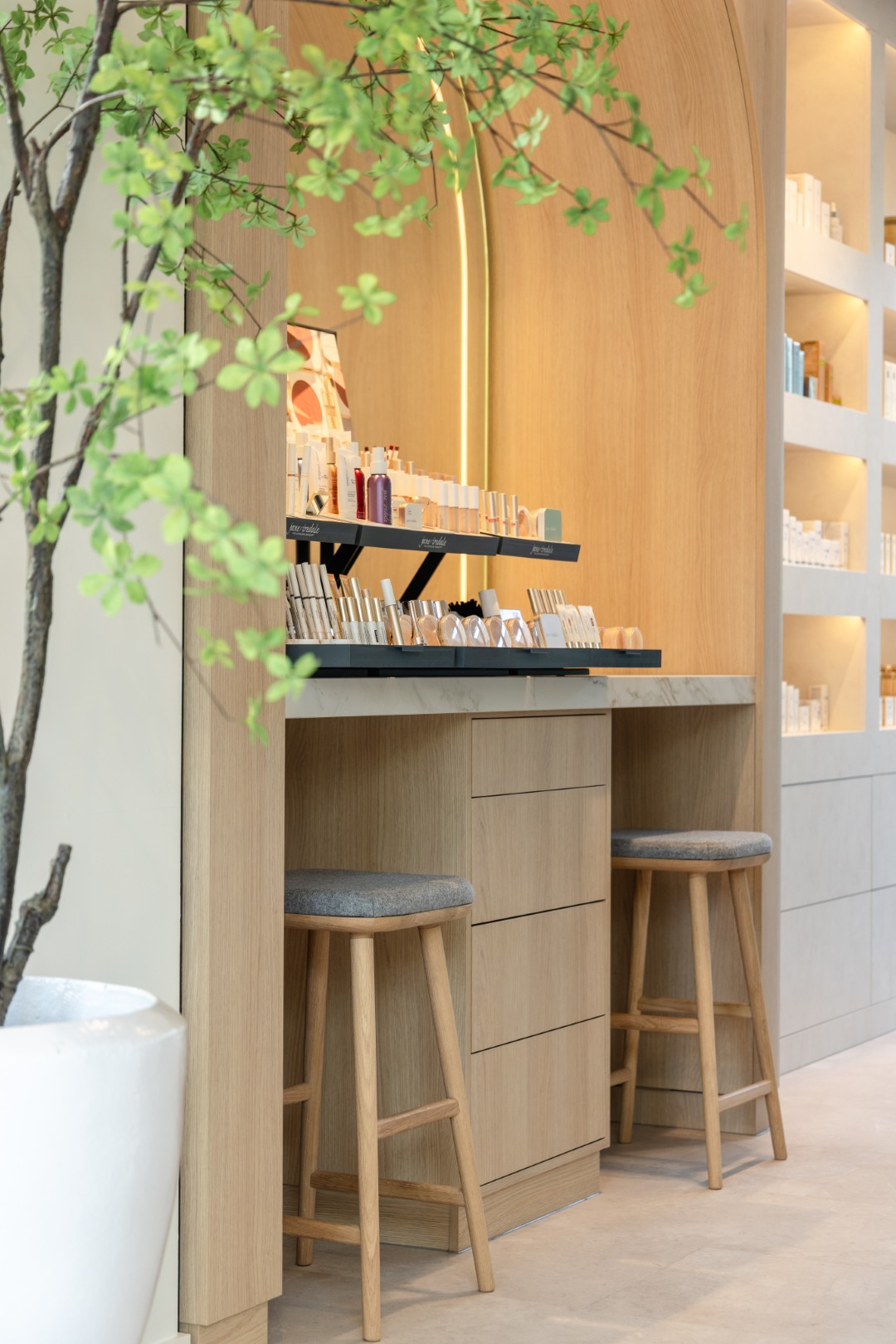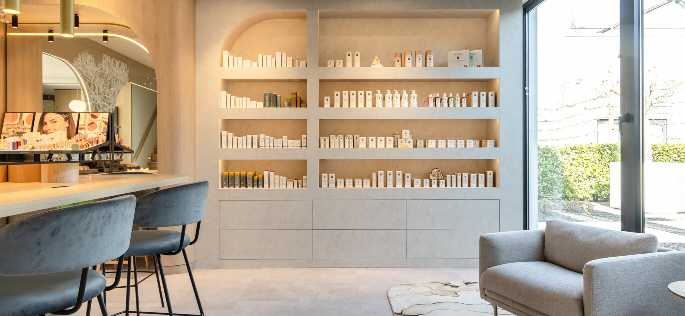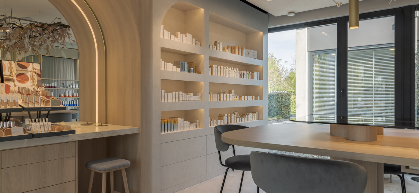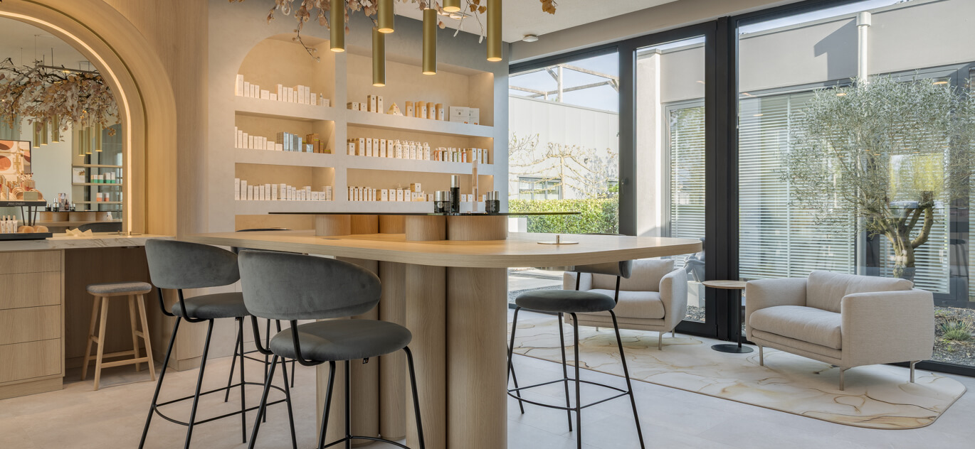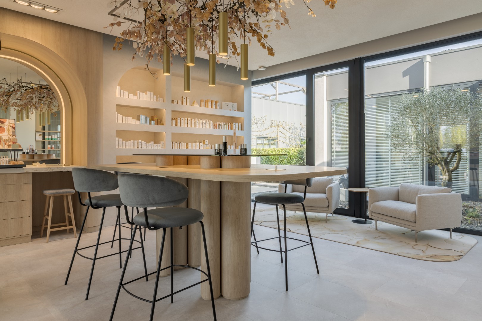 De uitdaging was om meer rust in de productpresentatie te brengen en dit te combineren met een interactief element. Tegelijkertijd moest het interieur een update krijgen naar een stijl van nu, met afgeronde vormen en rijke structuren. Een echte eyecatcher is de doorgang met twee boogpoorten voorzien van LED-verlichting, die de bezoeker leiden naar de experience tafel met ruimte voor acht zitplekken. Daarachter bevindt zich een warme lounge-wachtruimte waarin klanten in alle rust kunnen ontspannen voorafgaand aan hun behandeling. Deze nieuwe indeling verbetert niet alleen de routing, maar versterkt ook de klantbeleving. Het geheel is ontworpen met aandacht voor een duurzaam interieurontwerp dat past bij de visie van Body & Vital.